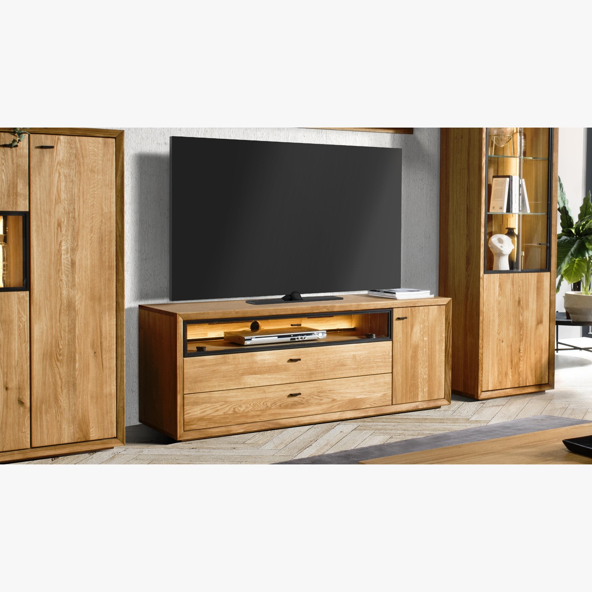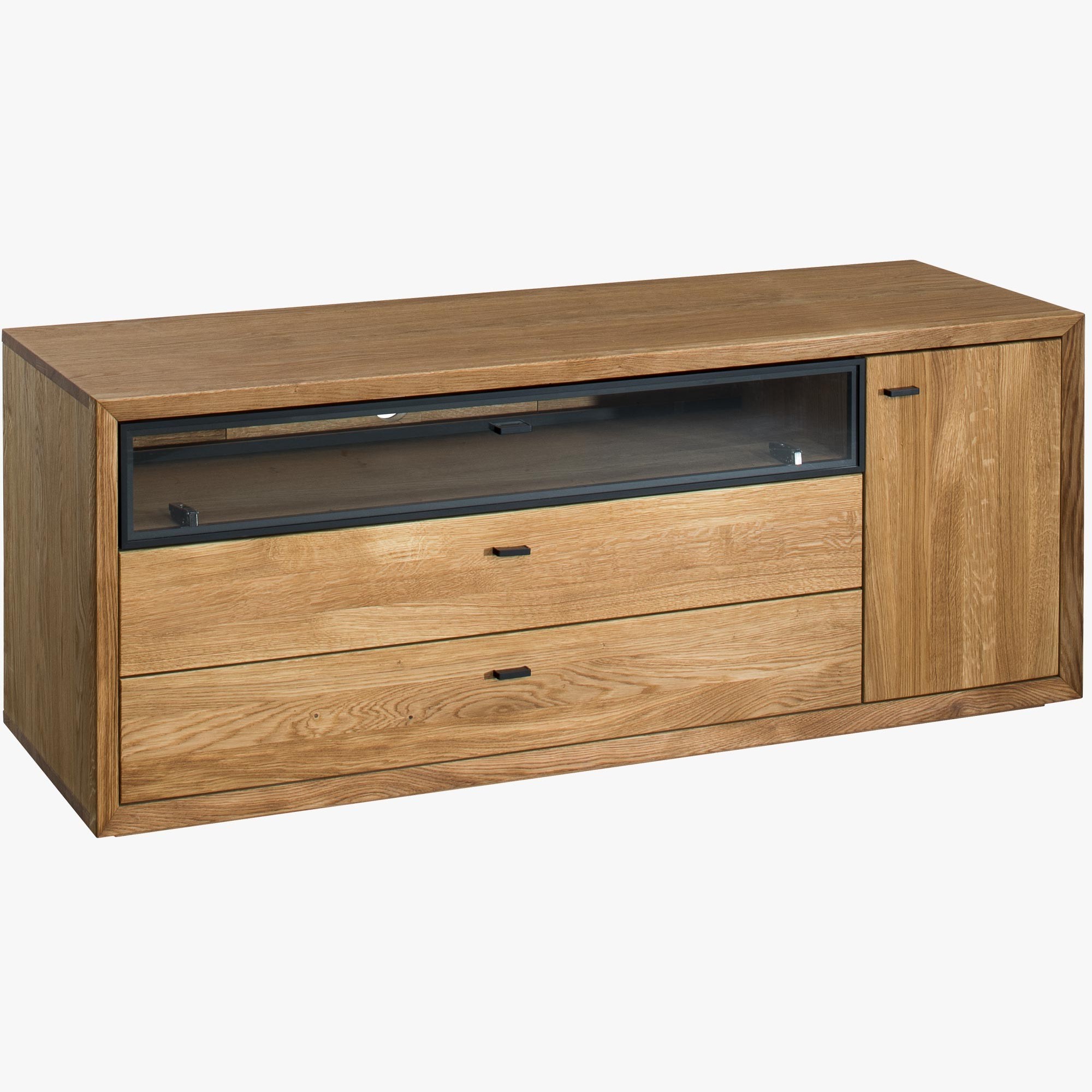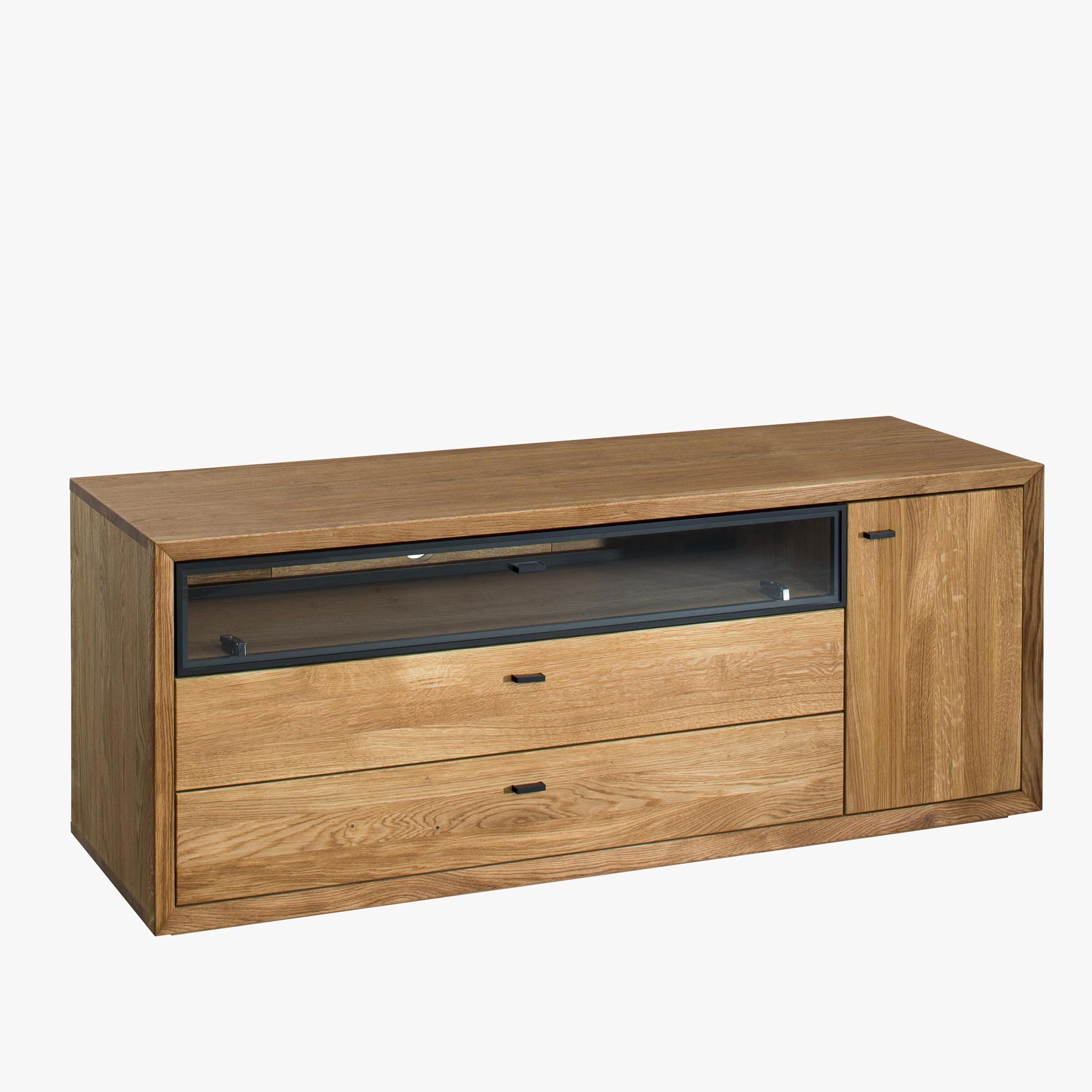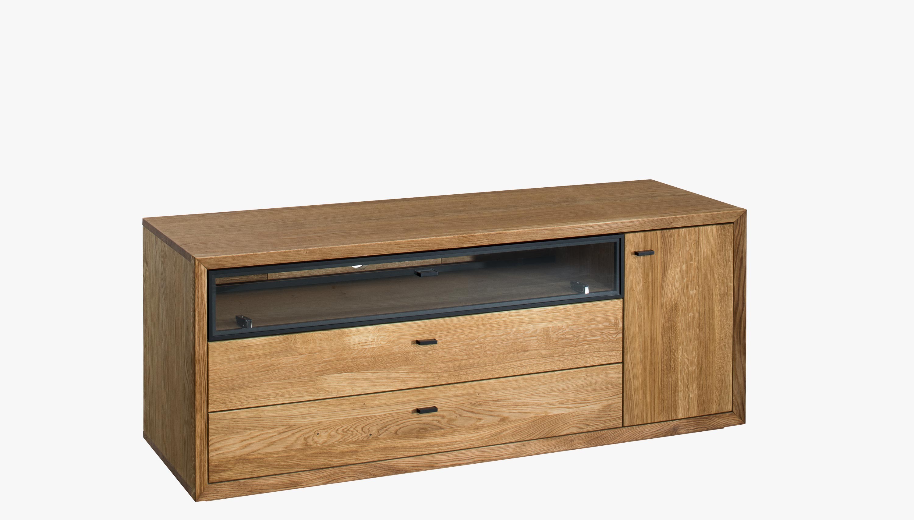 Televízna komoda v nádhernom mierne industriálnom štýle s moderným nadčasovým dizajnom. Tv komoda je z kolekcie nábytku Vilo, čo je novinka predstavená na jeseň 2020. Tv komoda sa dodáva už zostavená v prémiovej kvalite prevedenia. Komoda má 1 otváracie dvierka, kde vo vnútri sa nachádza jedna polica, v strednej časti je veľký otvorený priestor zakrytý presklenými dvierkami, ktorý má zo zadnej strany dieru na kabeláž. Pod ktorým sa nachádzajú 2 veľké zásuvky. Kovanie a dotváranie je tiché soft-close. Predná strana komody je dubové drevo, s jedinečnou štruktúrou prírodného charakteru dreva s jemne štruktúrovaným povrchom. Zvyšok nábytku je prírodná dubová dyha najvyššej kvality.