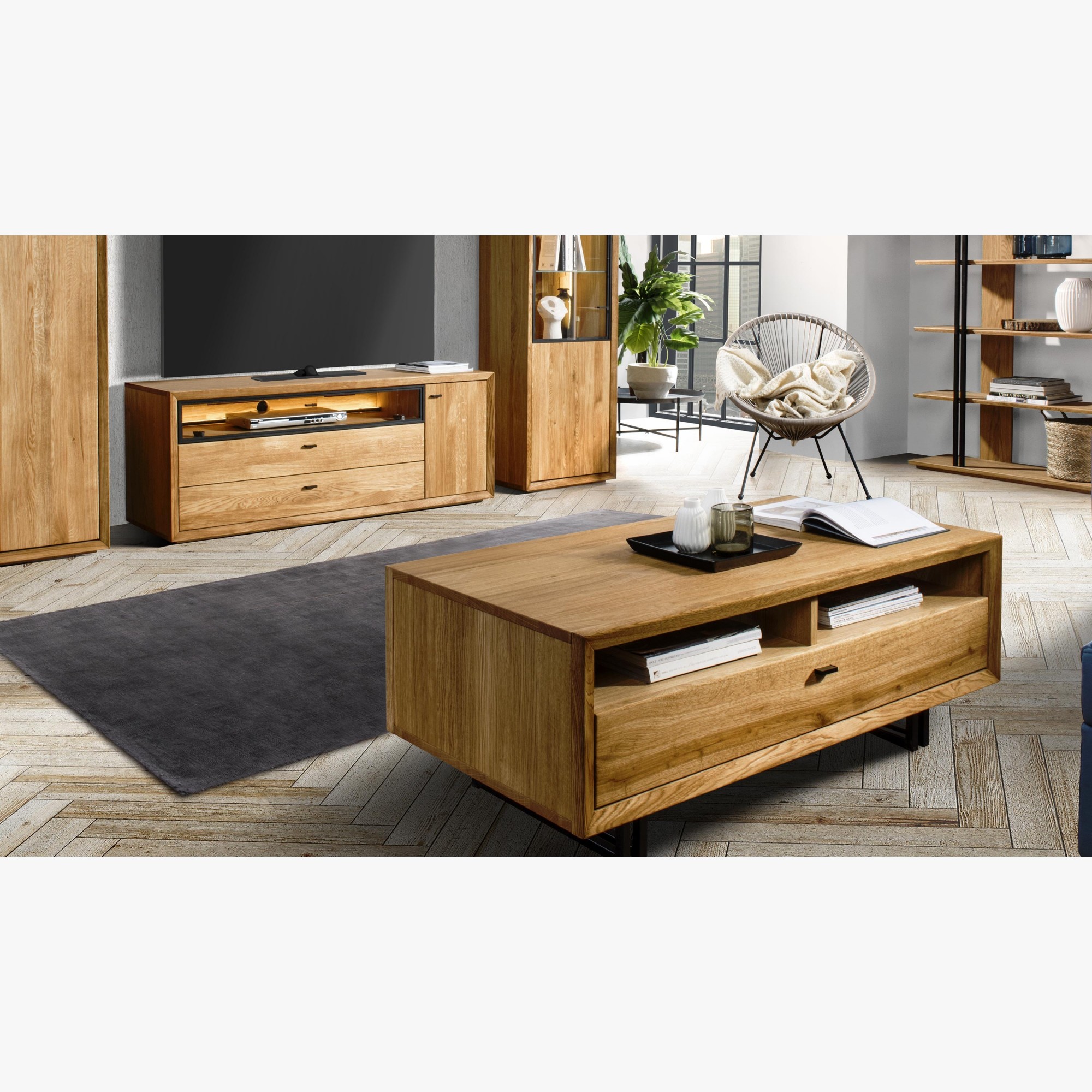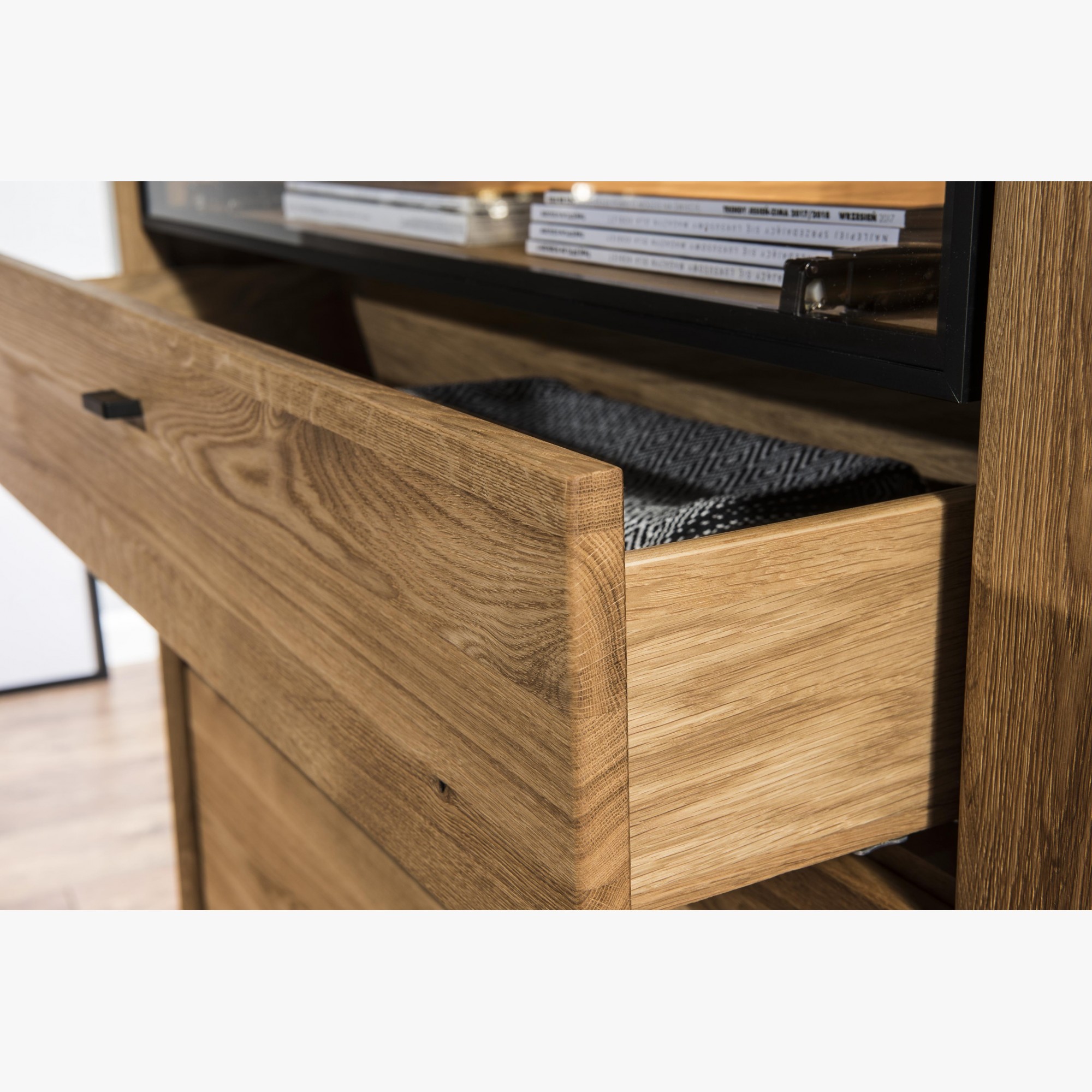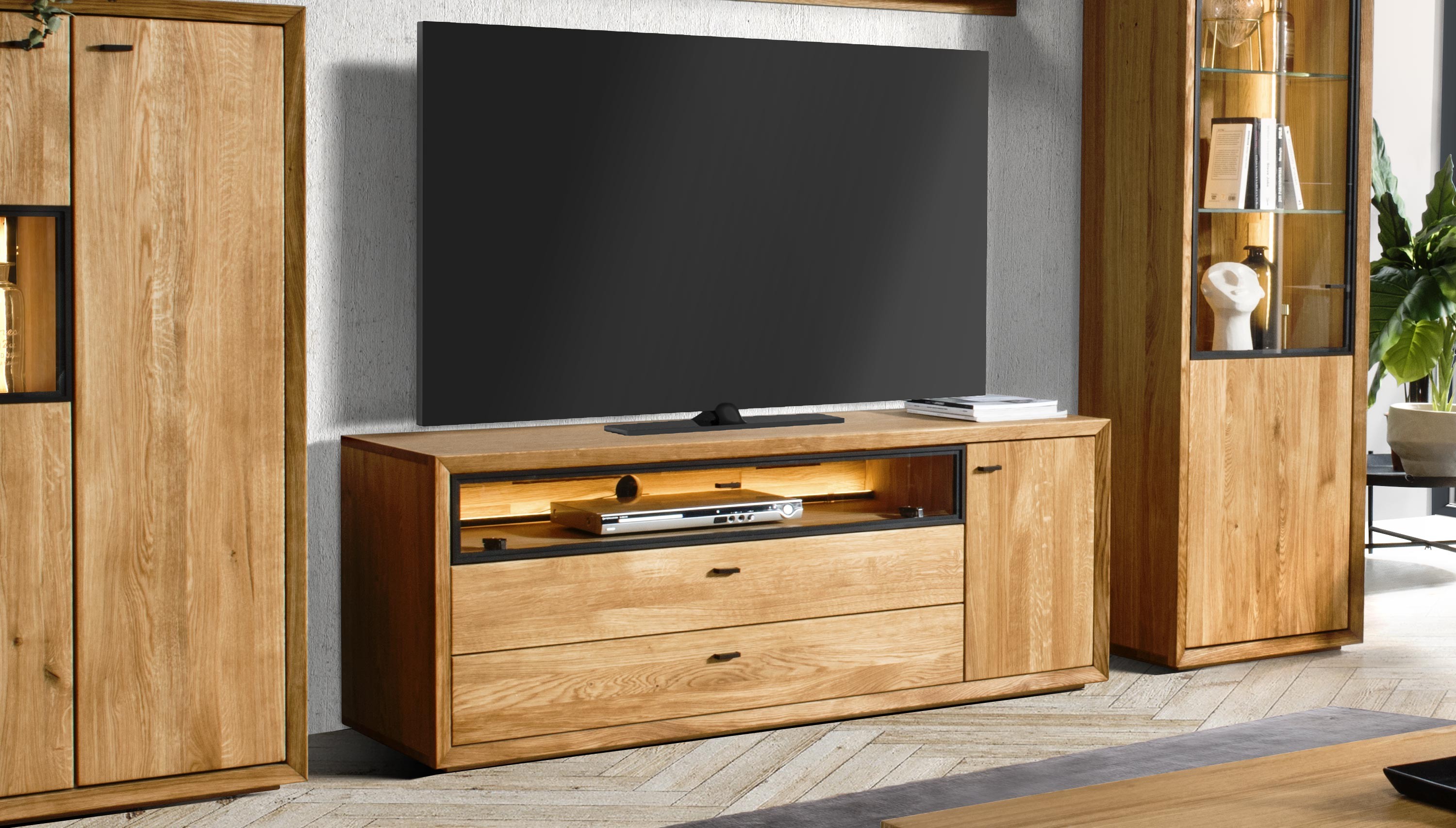 Televízna komoda v nádhernom mierne industriálnom štýle s moderným nadčasovým dizajnom. Tv komoda je z kolekcie nábytku Vilo, čo je novinka predstavená na jeseň 2020. Tv komoda sa dodáva už zostavená v prémiovej kvalite prevedenia. Komoda má 1 otváracie dvierka, kde vo vnútri sa nachádza jedna polica, v strednej časti je veľký otvorený priestor zakrytý presklenými dvierkami, ktorý má zo zadnej strany dieru na kabeláž. Pod ktorým sa nachádzajú 2 veľké zásuvky. Kovanie a dotváranie je tiché soft-close. Predná strana komody je dubové drevo, s jedinečnou štruktúrou prírodného charakteru dreva s jemne štruktúrovaným povrchom. Zvyšok nábytku je prírodná dubová dyha najvyššej kvality.