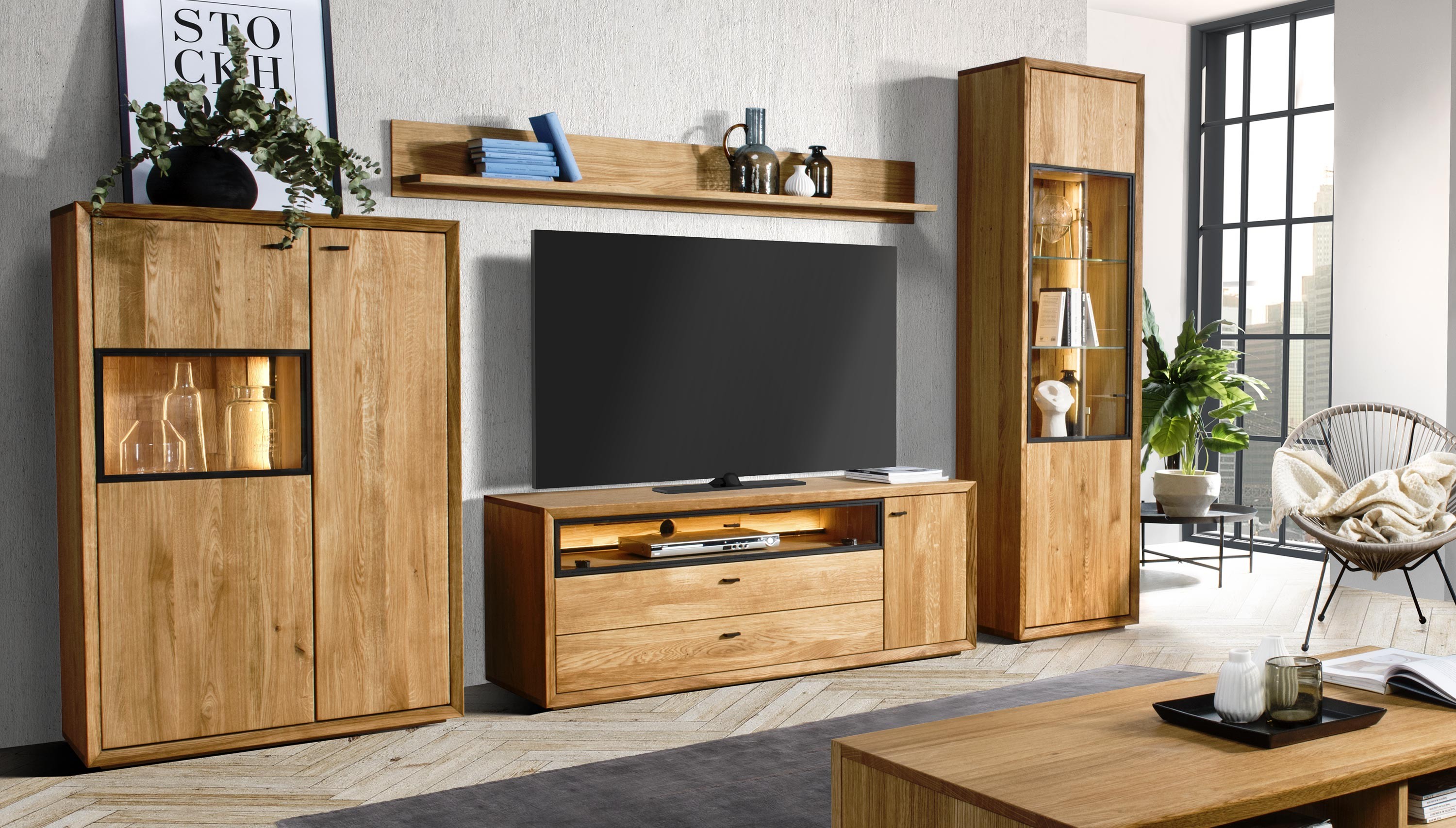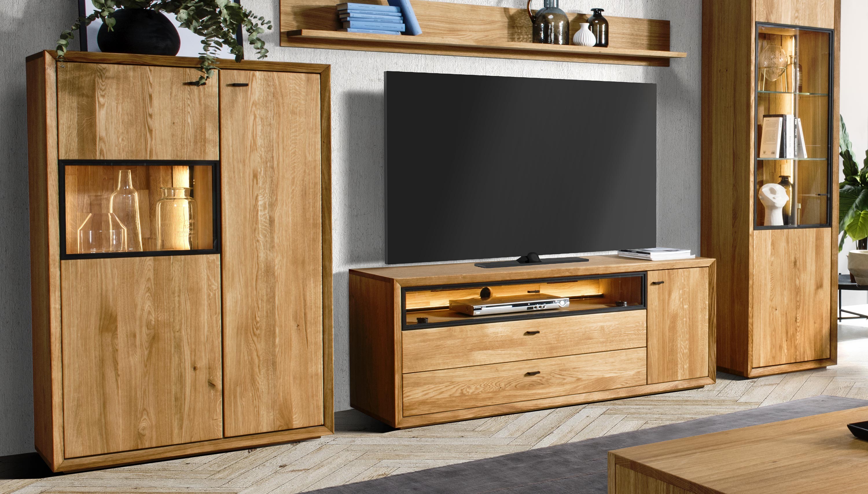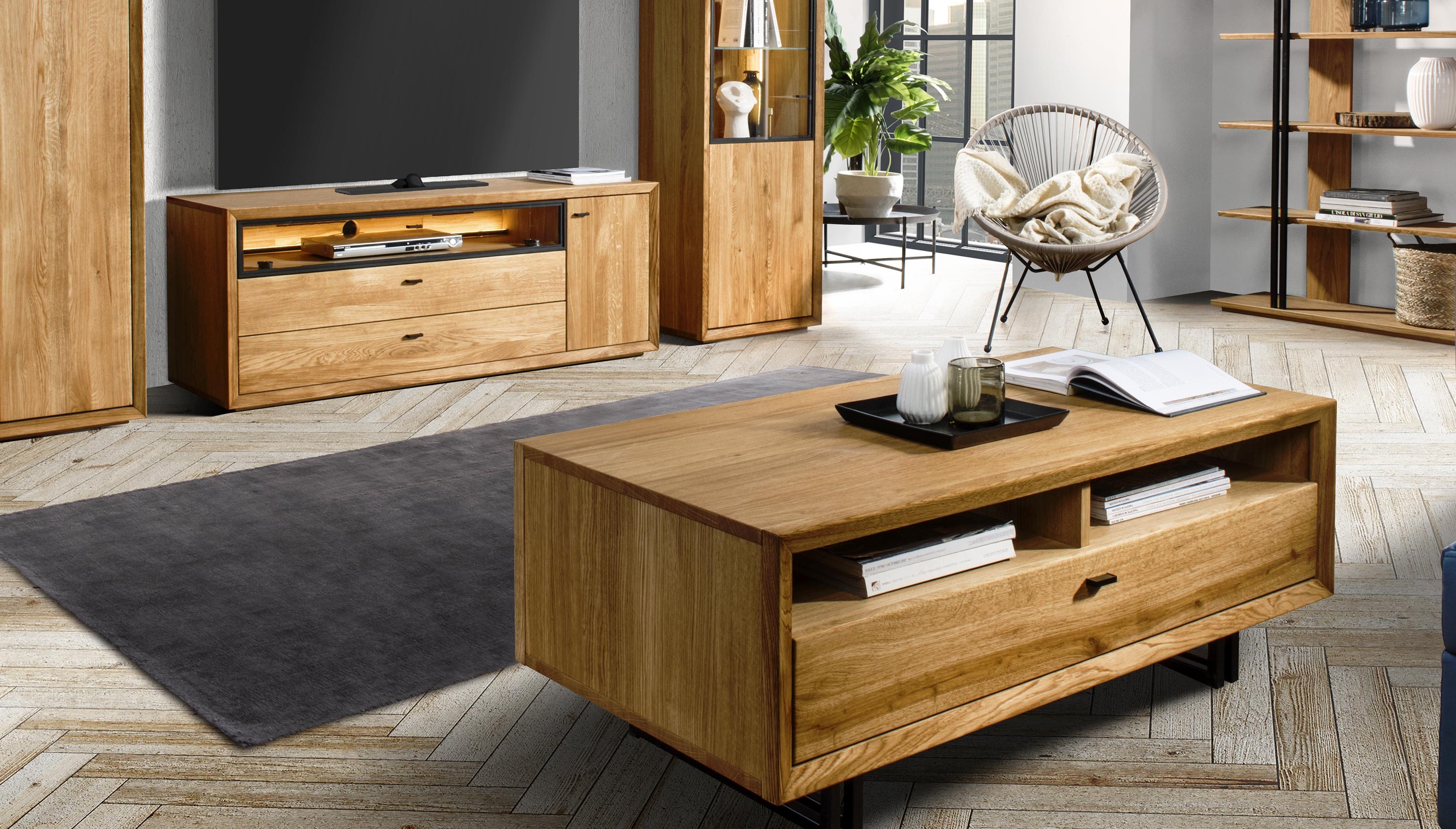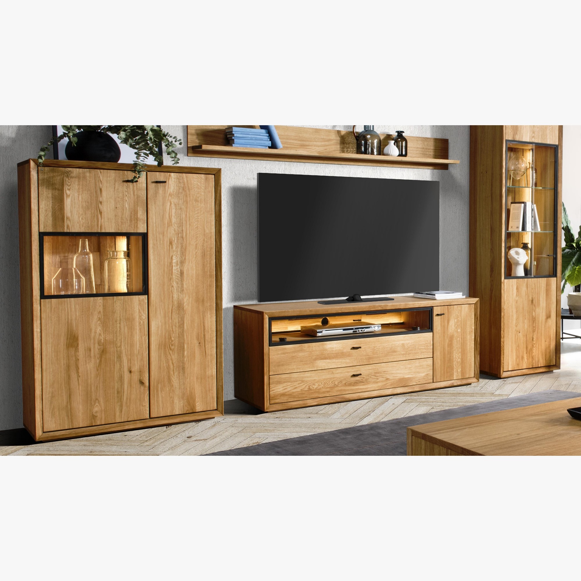 Televízna komoda v nádhernom mierne industriálnom štýle s moderným nadčasovým dizajnom. Tv komoda je z kolekcie nábytku Vilo, čo je novinka predstavená na jeseň 2020. Tv komoda sa dodáva už zostavená v prémiovej kvalite prevedenia. Komoda má 1 otváracie dvierka, kde vo vnútri sa nachádza jedna polica, v strednej časti je veľký otvorený priestor zakrytý presklenými dvierkami, ktorý má zo zadnej strany dieru na kabeláž. Pod ktorým sa nachádzajú 2 veľké zásuvky. Kovanie a dotváranie je tiché soft-close. Predná strana komody je dubové drevo, s jedinečnou štruktúrou prírodného charakteru dreva s jemne štruktúrovaným povrchom. Zvyšok nábytku je prírodná dubová dyha najvyššej kvality.