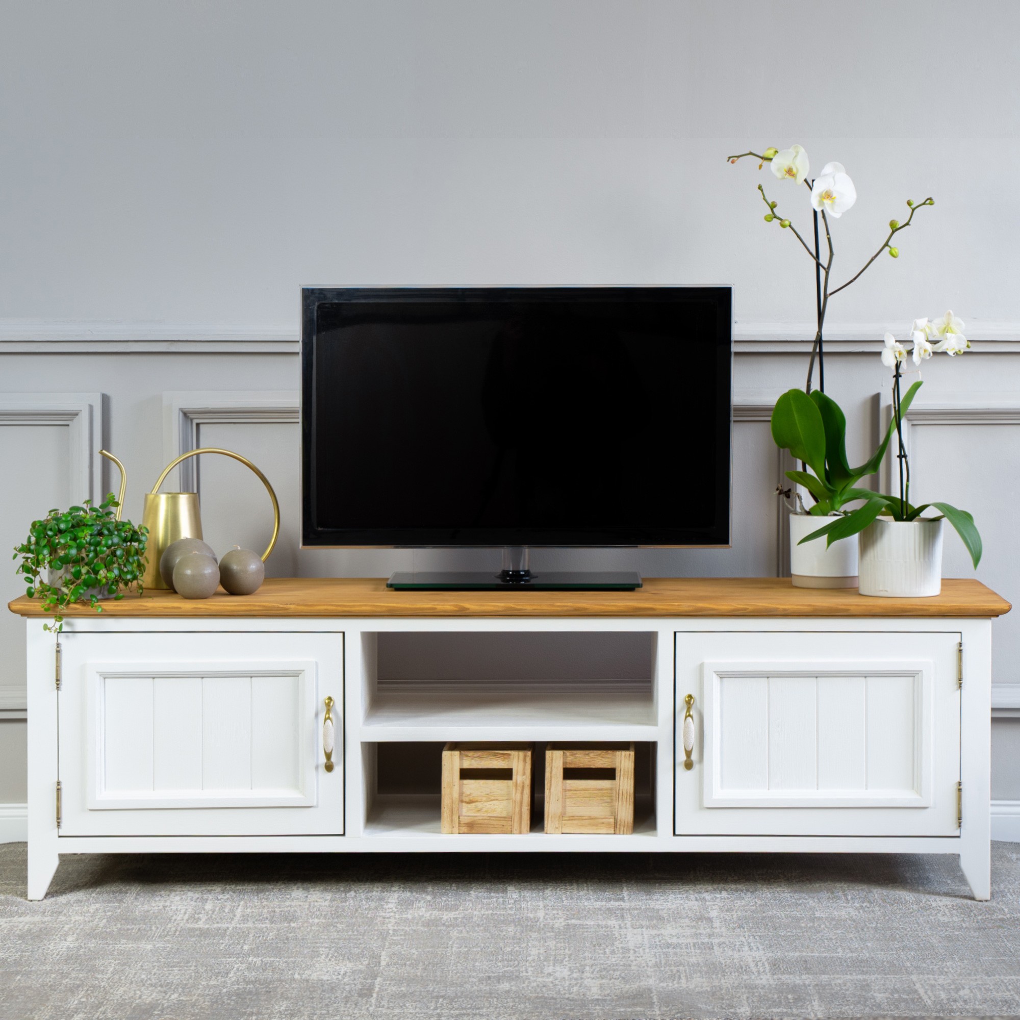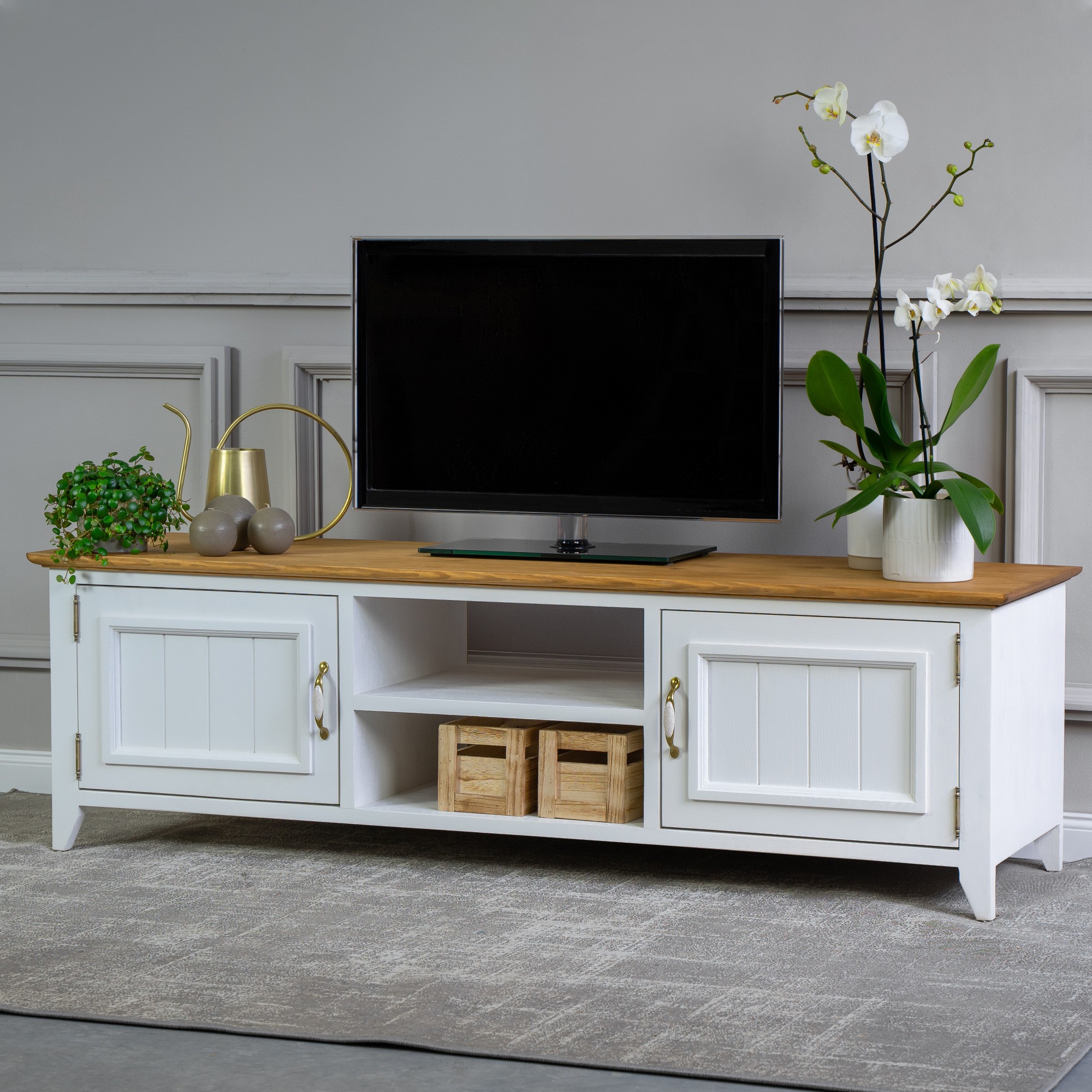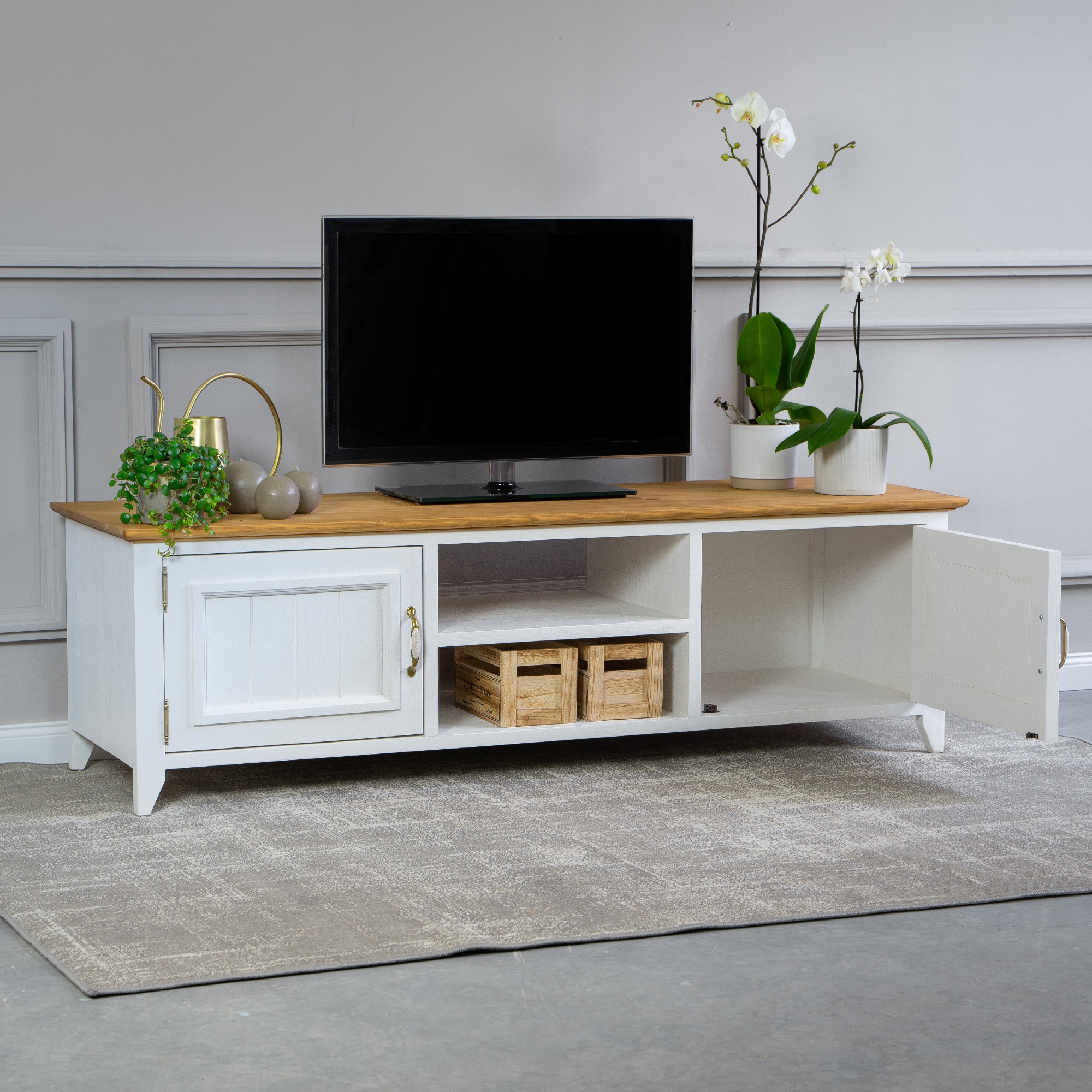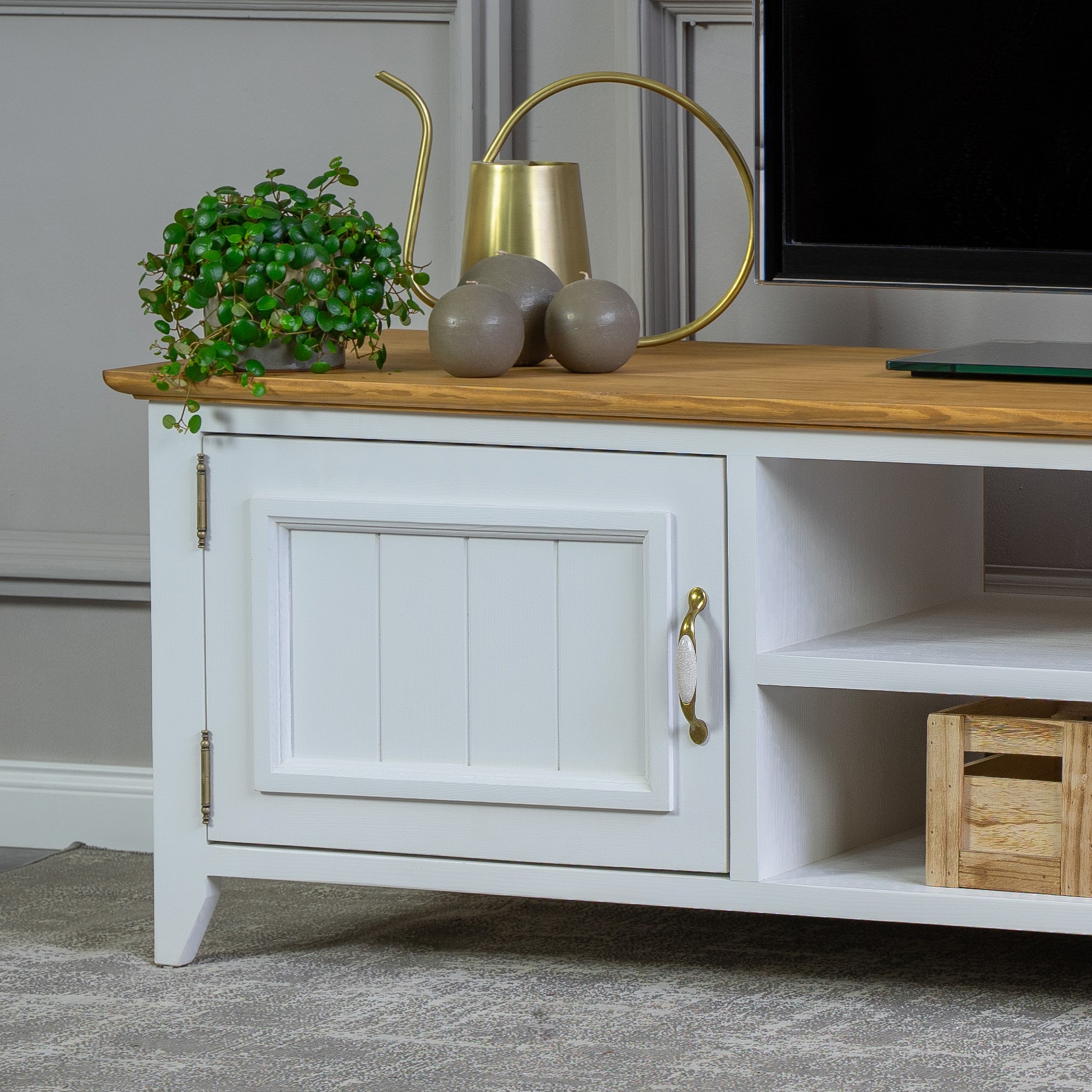 túžite aj vy prežívať dovolenku na Francúzskom vidieku, doplnenú o čerstvú vôňu levandule? Môžete si to veľmi jednoducho splniť a prežívať to každý deň. Prírodný drevený TV stolík z kolekcie Lille rozšírený o ďalšie kúsky do vášho obývacieho priestoru vám vytvorí dokonalú atmosféru práve Francúzskeho vidieka. TV stolík je v bielo hnedej farebnej kombinácii vyrobený z čistého borovicového dreva. TV stolík sa dodáva už zmontovaný a má po stranách otváracie dvierka, v strednej časti je polica. Rozšírte svoj interiér o tento atraktívny kúsok a prežívajte denne silu prírodného nábytku. Ekológia prírodného produktu a harmónia nádherného dizajnu sú vlastnosti, ktoré sme spojili pri výrobe TV stolíka LILLE.