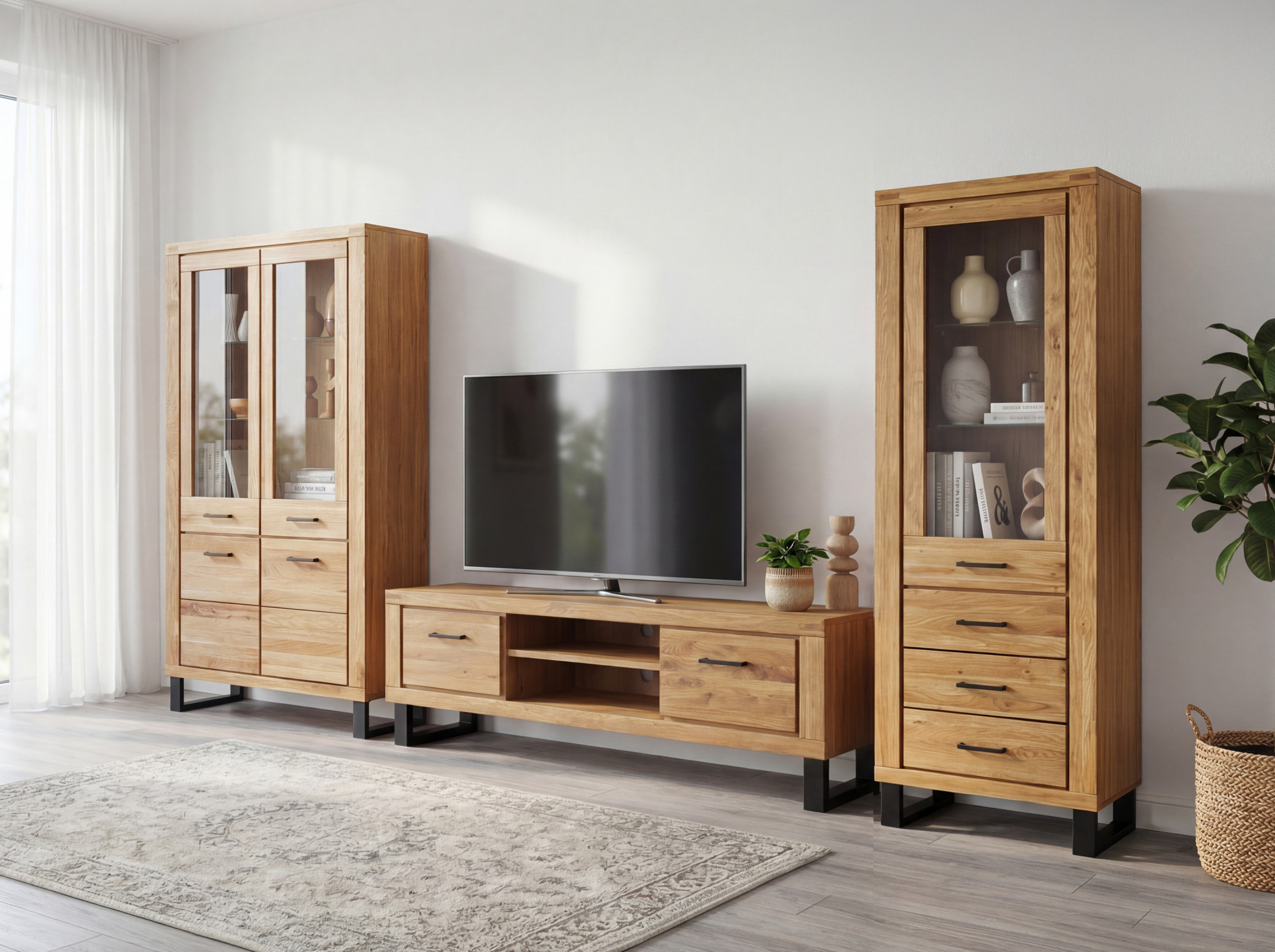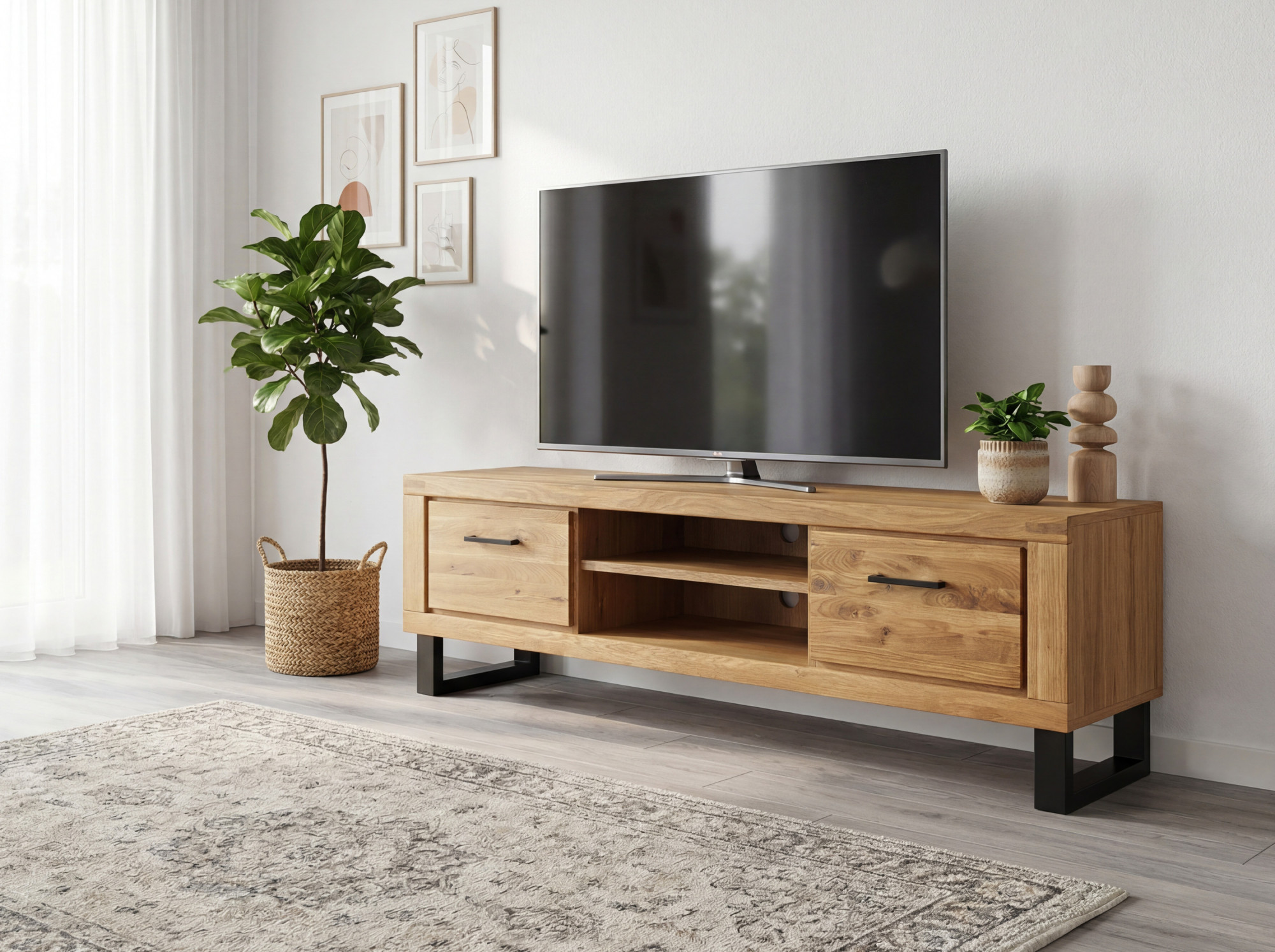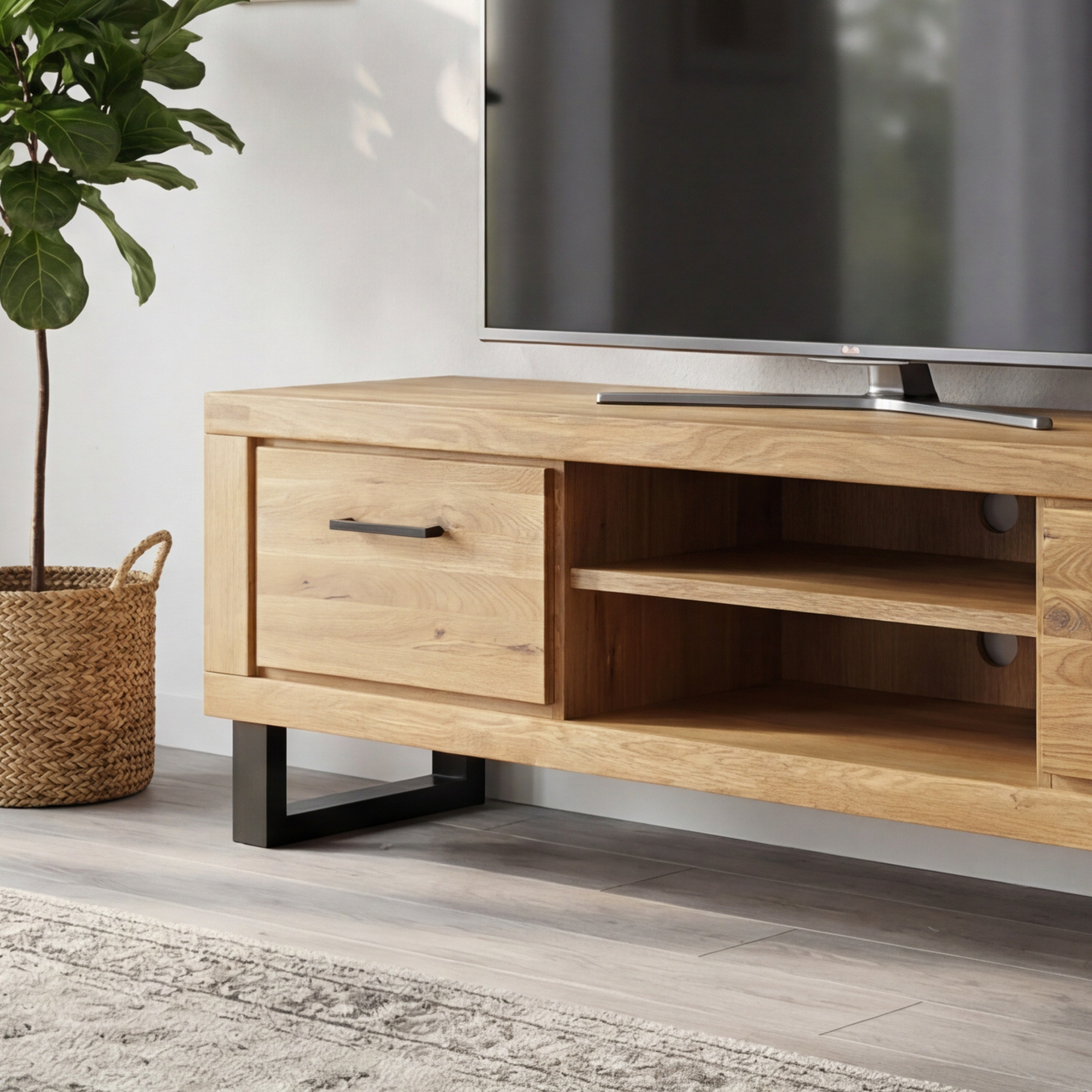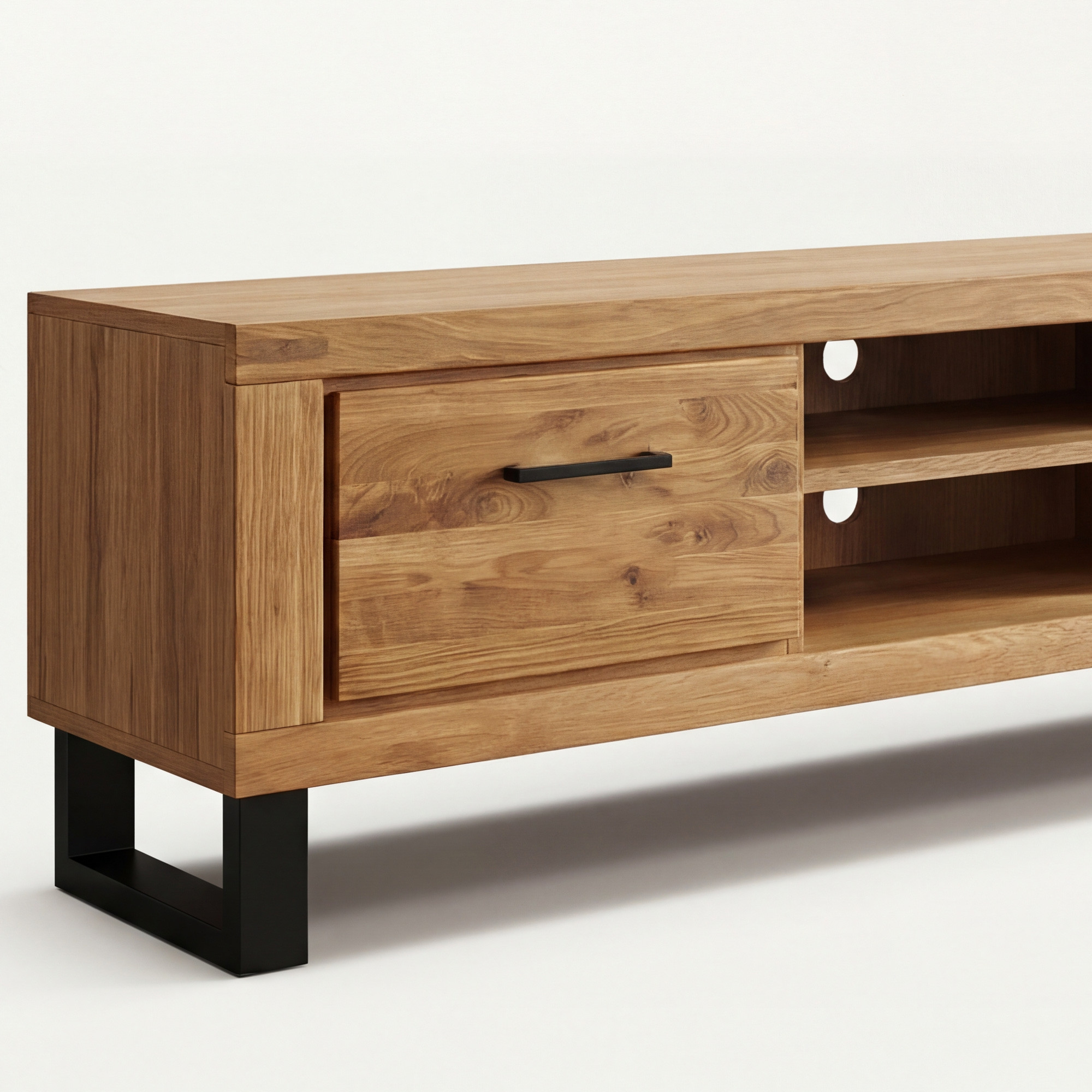 Hľadáte priestranný televízny stolík, ktorý spája moderný dizajn s praktickým úložným priestorom? Predstavujeme vám dlhú dubovú TV komodu Martina na elegantných kovových nožičkách, ktorá sa stane dominantou vašej obývačky. Komoda je navrhnutá pre milovníkov minimalistických interiérov, ktorí ocenia prirodzený a čistý vzhľad dreva. Predná časť dvierok je vyrobená z masívneho dubového dreva ošetreného prírodným olejom, ktorý zvýrazňuje kresbu dreva a dodáva nábytku autentický charakter. TV komoda ponúka dve dvierka, za ktorými sa nachádza praktická polica na uloženie set-top boxu, hernej konzoly či iného príslušenstva k televízoru.