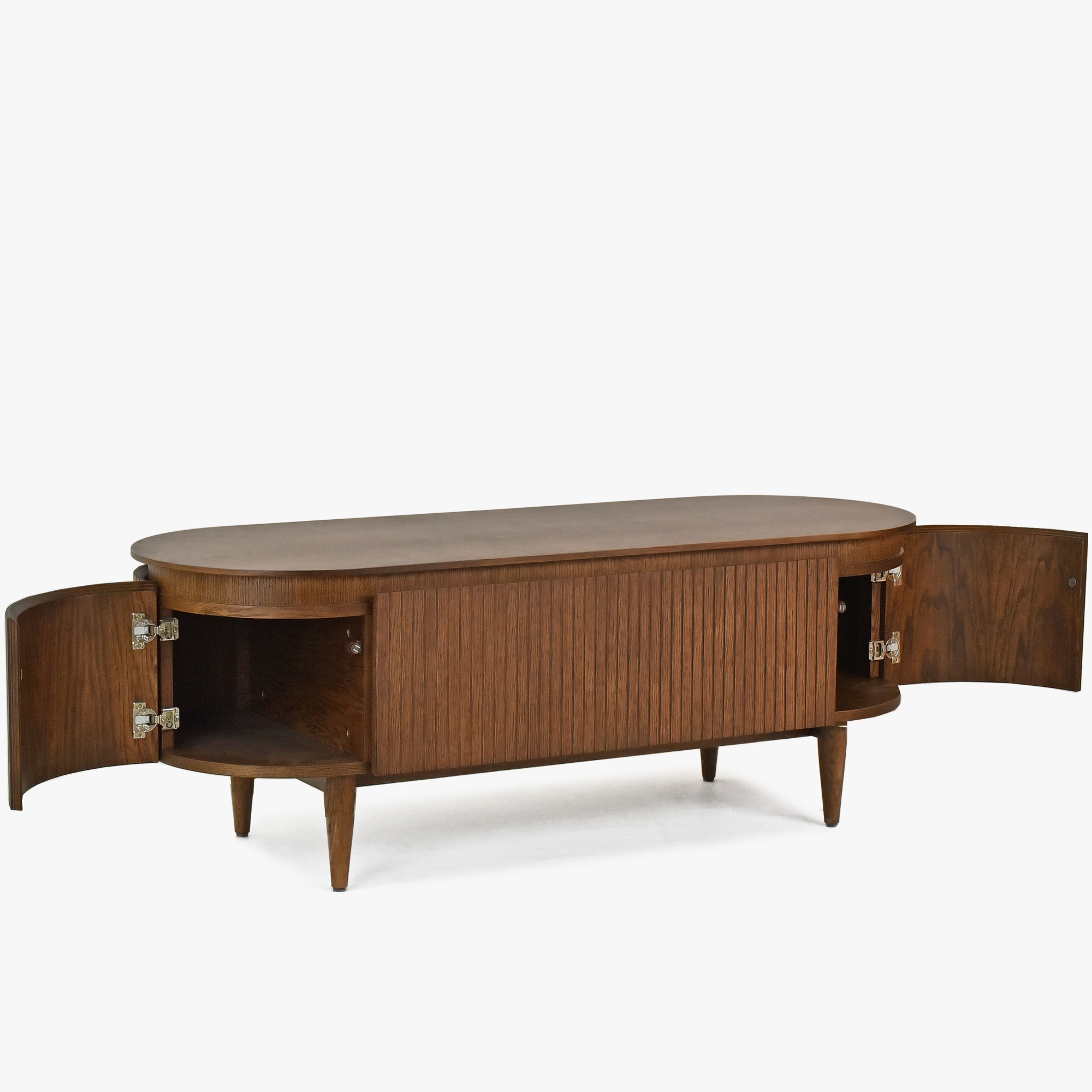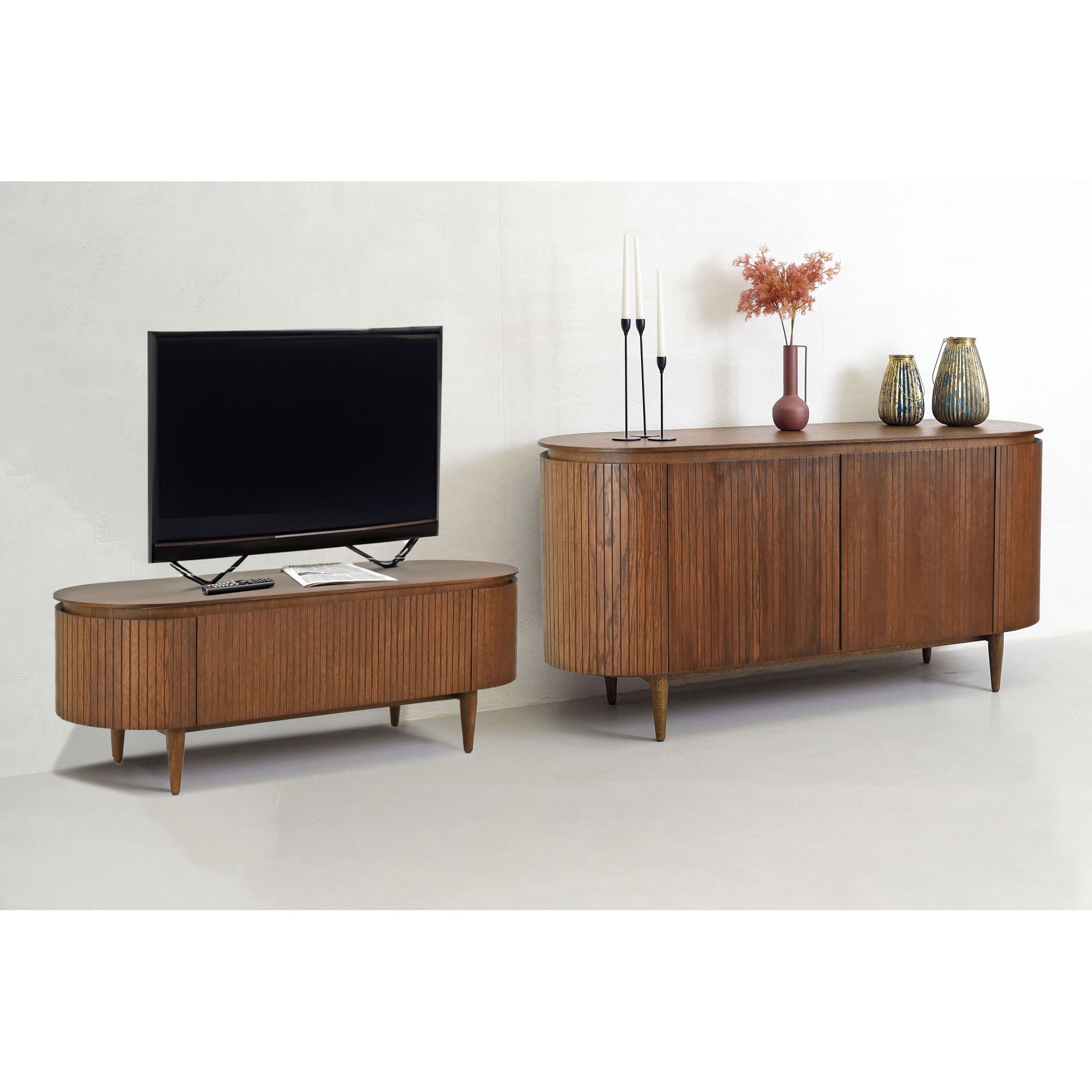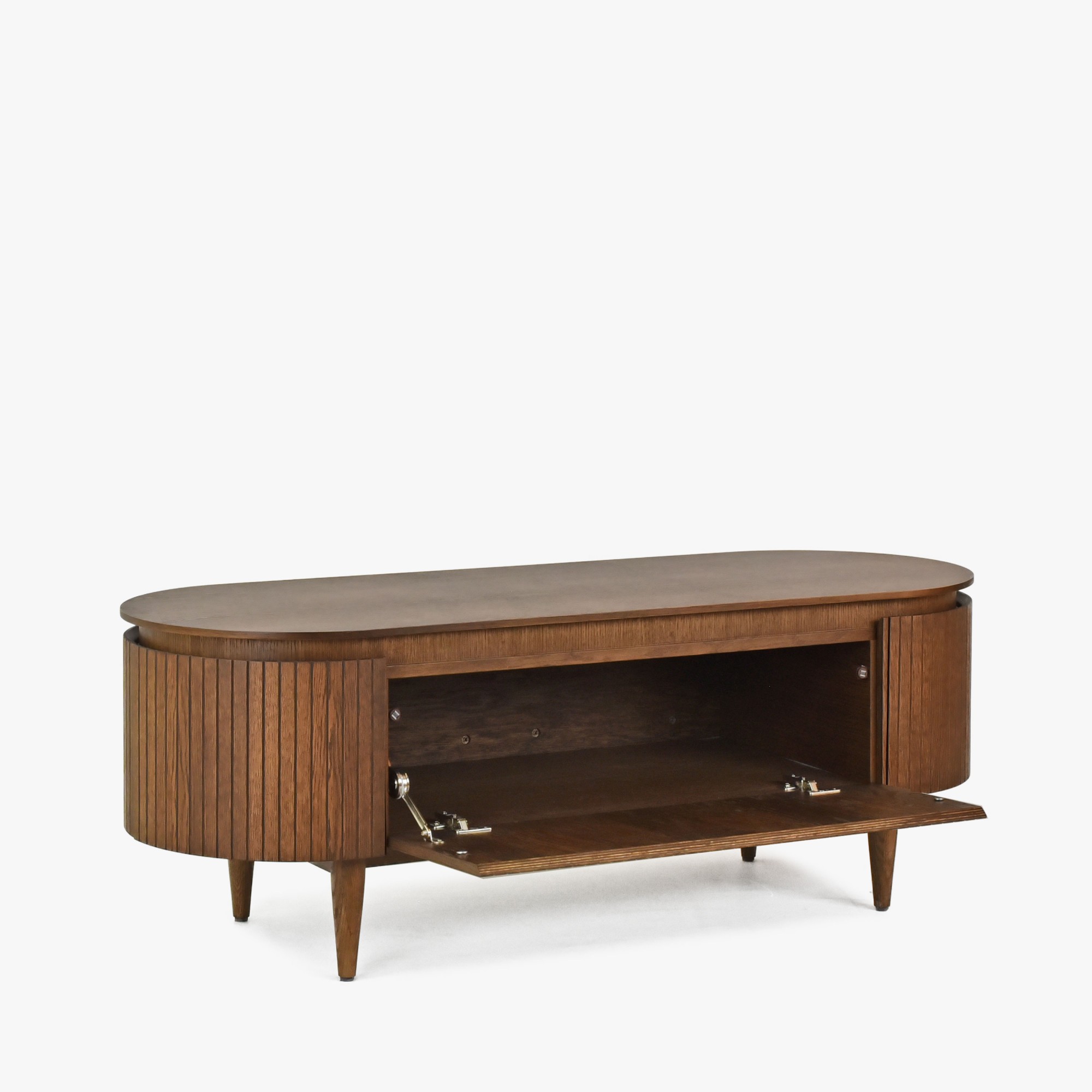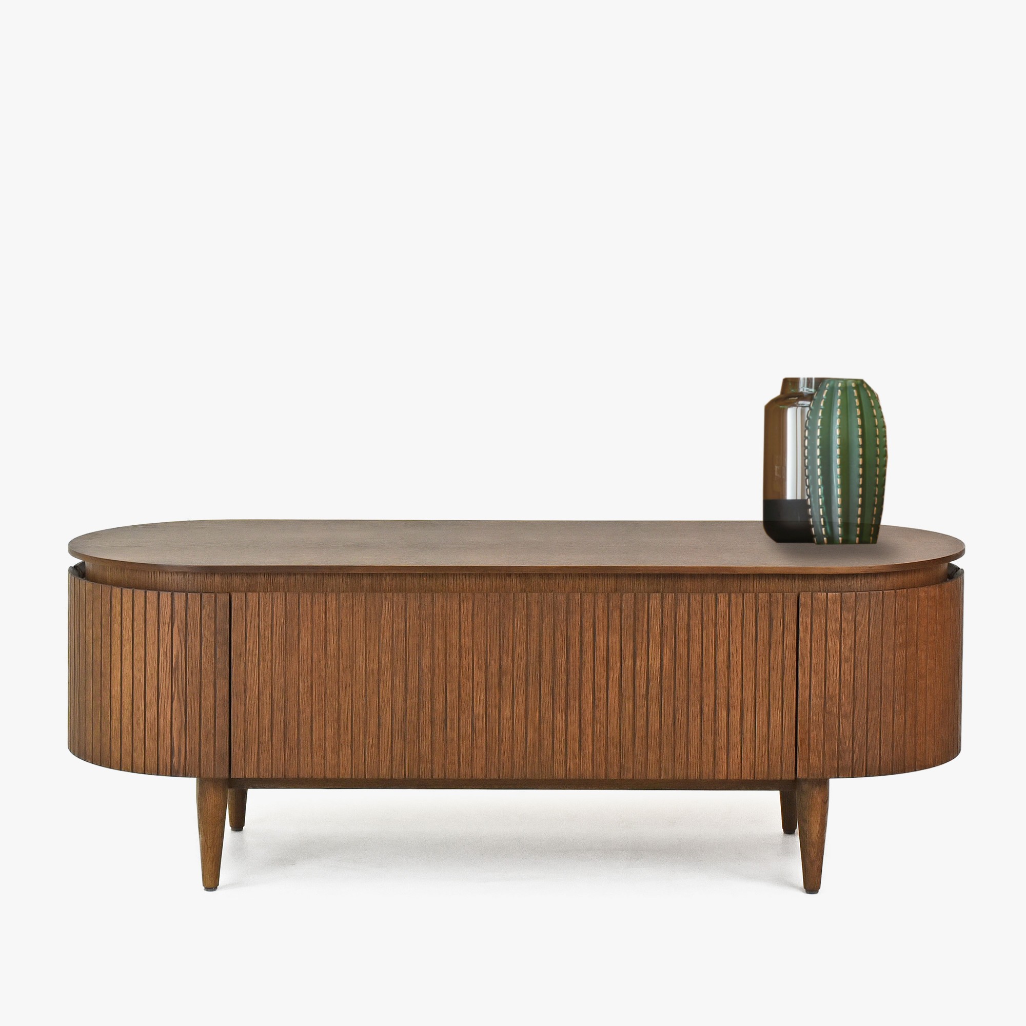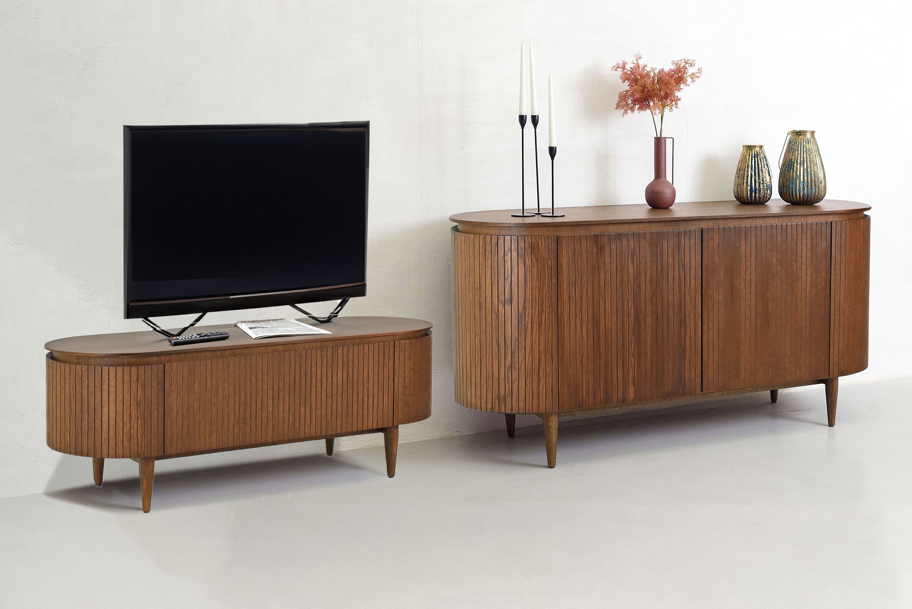 Televízna komoda, ktorá je presne tým, čo potrebujete pre dokonalé vybavenie vašej obývacej časti. So svojím neodolateľným tvarom a elegantnou farbou orecha okamžite zaujme pozornosť každého návštevníka. Naša tv komoda je vyrobená s precíznosťou a starostlivosťou o každý detail. Kombinácia dreva dub a dubovej dyhy vytvára neuveriteľnú harmoniu, ktorá okamžite dodá vášmu interiéru sofistikovanosť a eleganciu. Dvierka po stranách poskytujú dostatok úložného priestoru pre skryté uloženie vašich obľúbených filmov, kníh alebo dekoratívnych predmetov. Padacie dvierka uprostred potom umožňujú jednoduchý prístup k technike bez akejkoľvek námahy.
