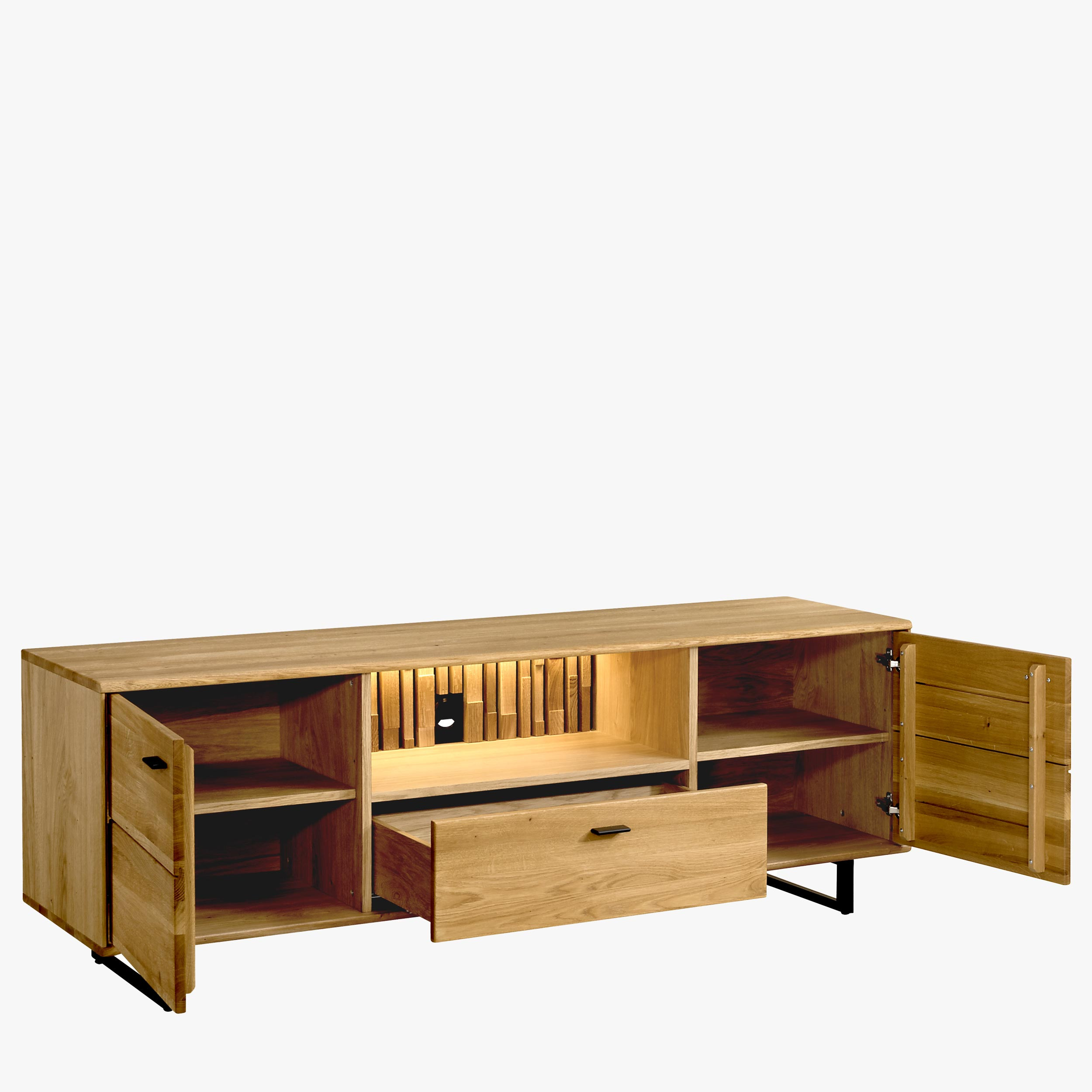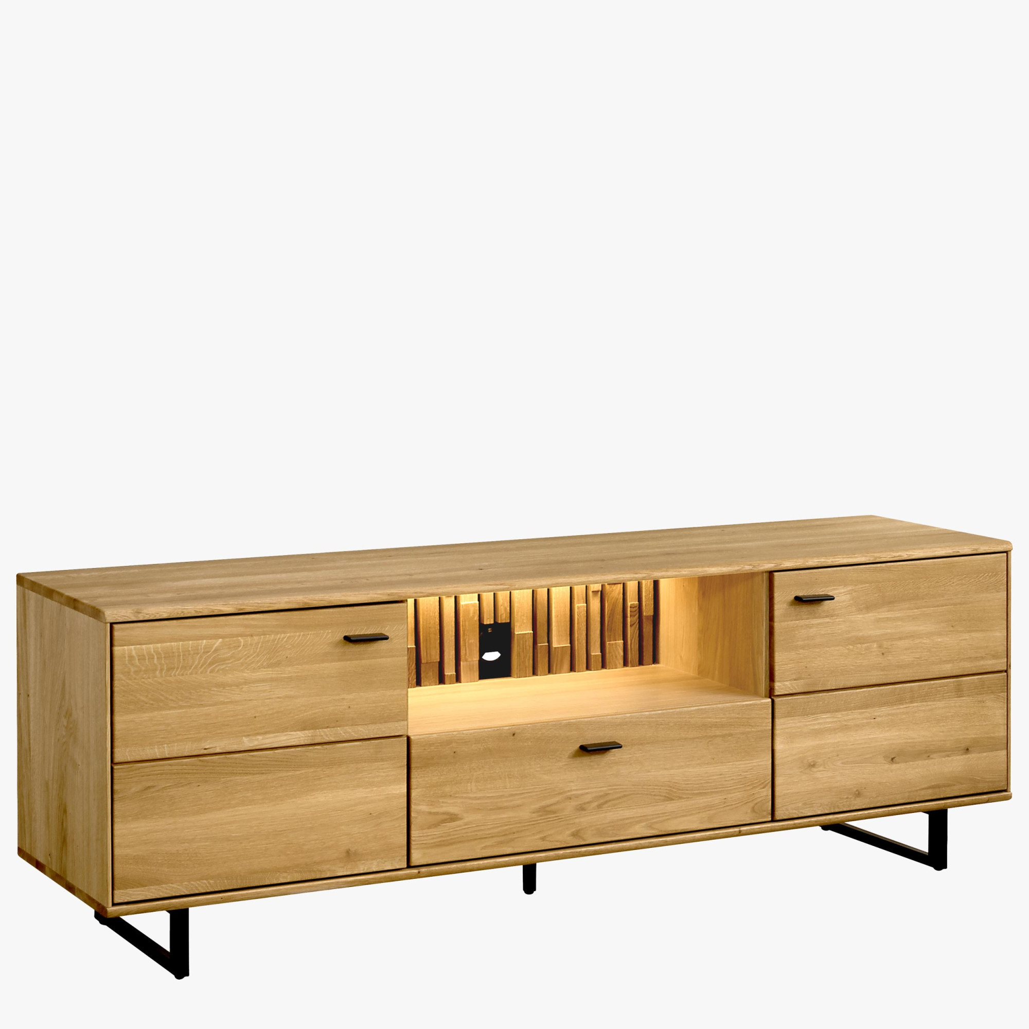 Táto moderná TV komoda je navrhnutá s ohľadom na funkčnosť a nadčasový dizajn, čo z nej robí ideálny doplnok pre váš obývací priestor. Vyrobená z kvalitného dubového dreva a dubovej dyhy, táto komoda ponúka robustnú konštrukciu a elegantný vzhľad, ktorý pridá vášmu interiéru nádych luxusu a nadčasovosti.