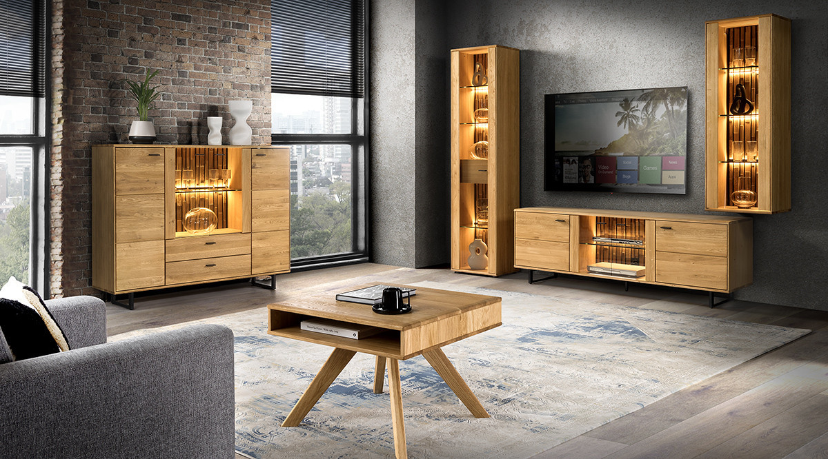 Luxusný nábytok do obývacej izby v kvalitnom prevedení dubového masívu v kombinácii s dubovou dyhou, kde hlavné viditeľné časti sú masívne. Dodávame v dekore dub prírodný medový brúsený. Nábytok je dodávaný v zmontovanom stave (pevnejší, stabilnejší, bez viditeľných a estetiku kaziacich skrutiek než skladacie zostavy) a zásuvky i dvierka sú vybavené systémom tlmenia pre mäkké a tiché zatváranie. Poličky v presklených častiach sú sklenené. Elegantná dubová obývacia zostava z masívu a prírodnej dyhy. Moderný industriálny dizajn s parketovým vzorom a kovovými nožičkami – to sú hlavné prednosti dubového nábytku Tramontino. Zadné časti presklených dvierok sú vyrobené špeciálnym dizajnom zo skladaných parketových doštičiek, viz foto. Nábytok je ošetrený prírodným voskom a olejom nemeckej značky Livos.