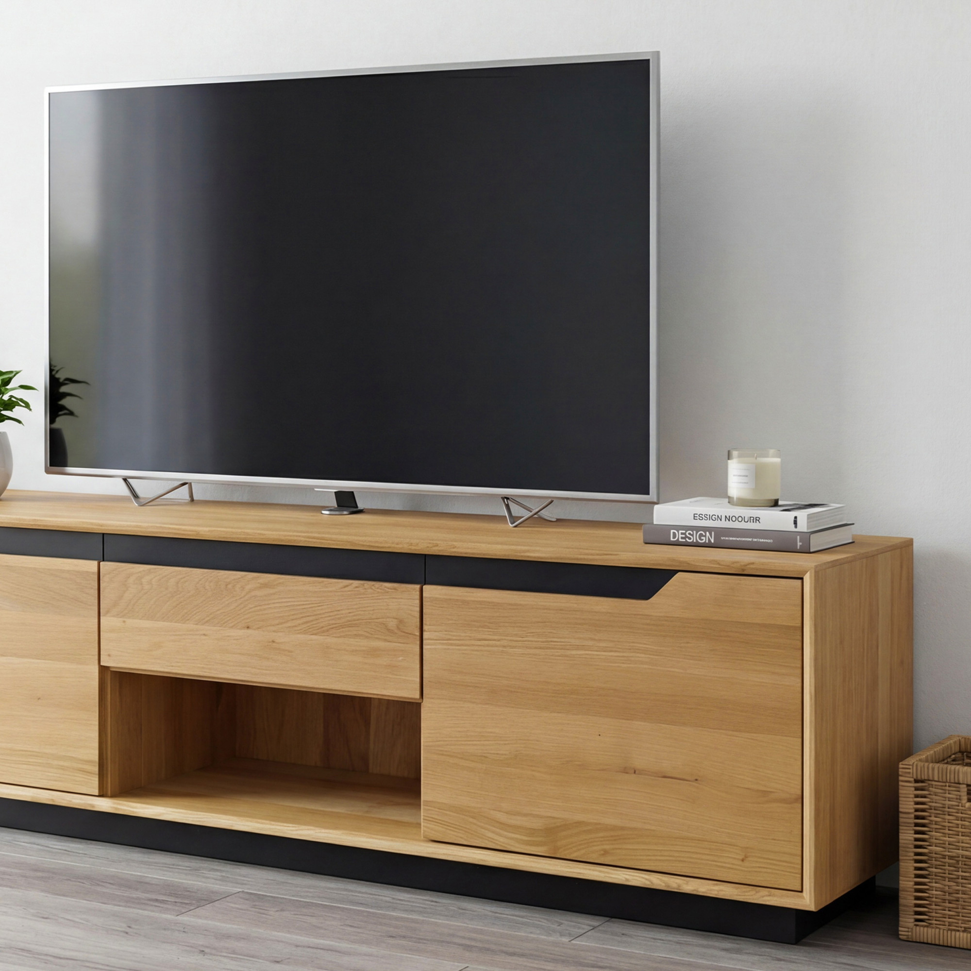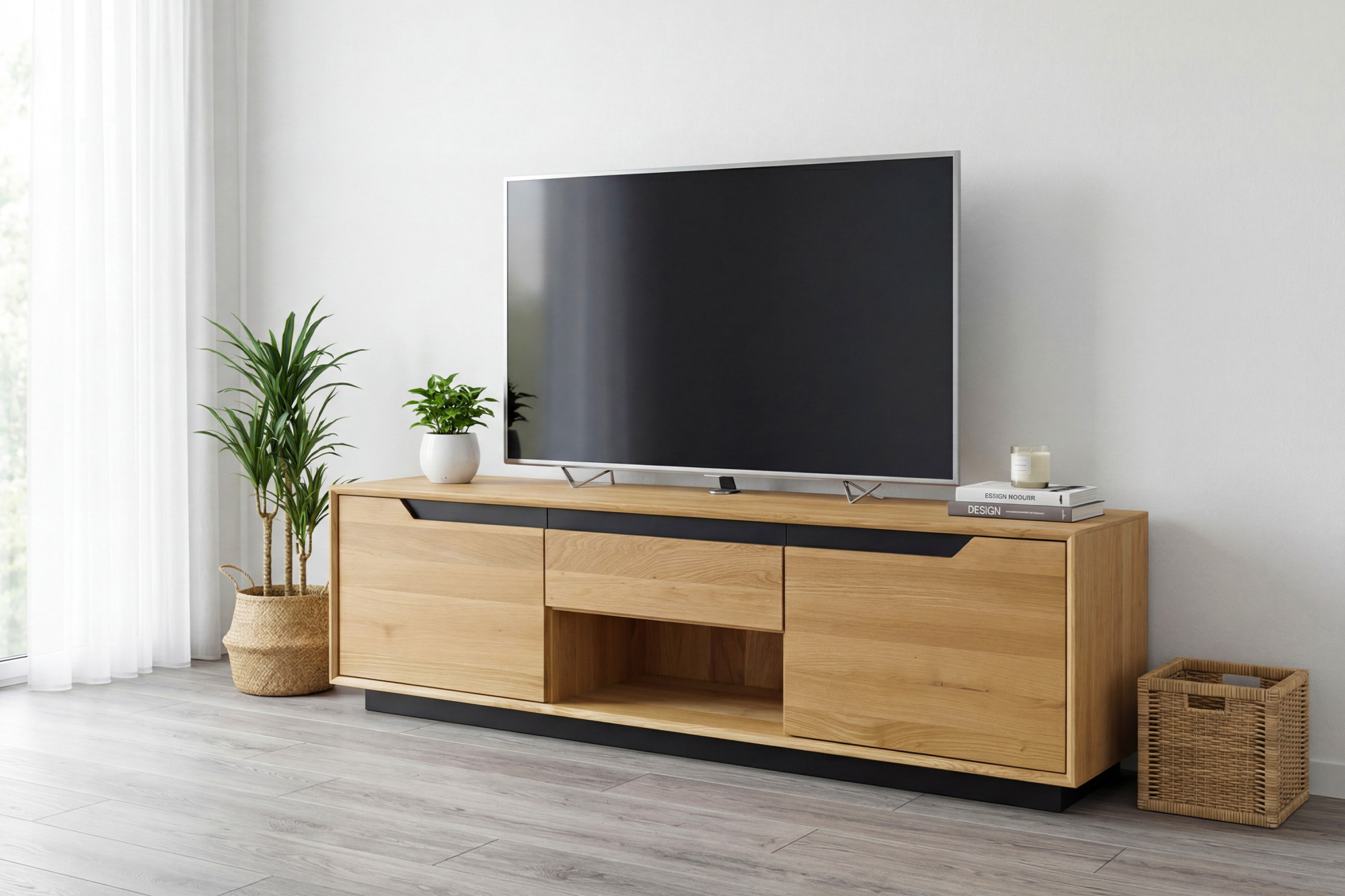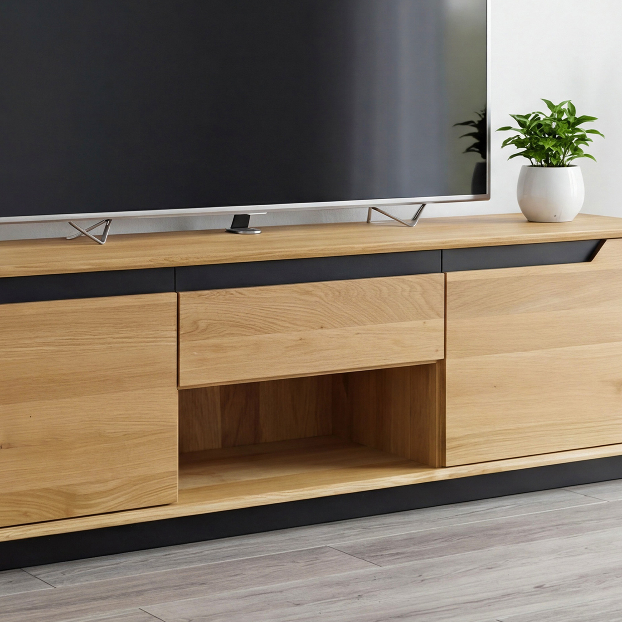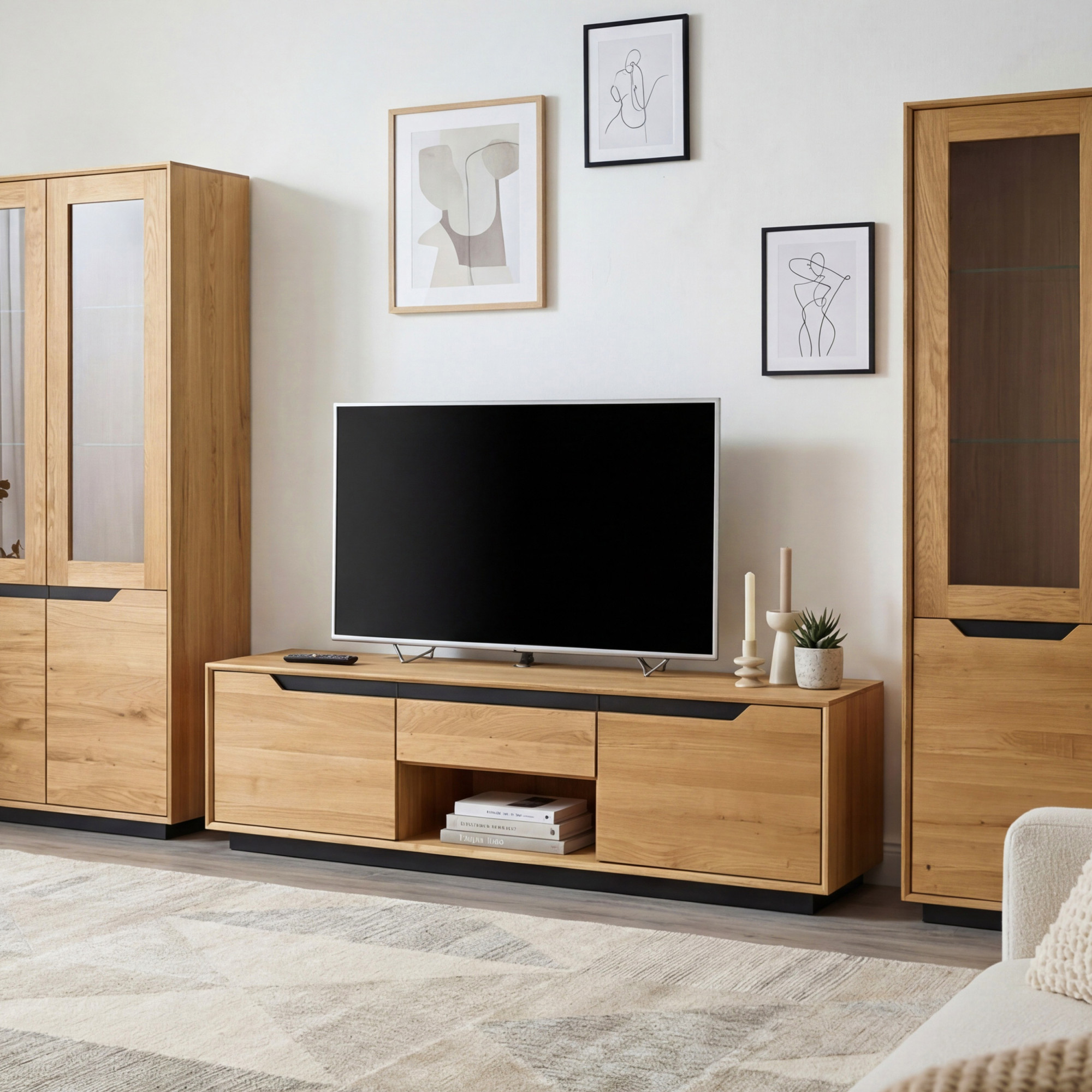 Dubová TV komoda s dvierkami a zásuvkou je výnimočným kúskom nábytku, ktorý prinesie do každej domácnosti nielen funkčnosť, ale aj nadčasovú eleganciu. Vyrobená z masívneho dubového dreva, táto komoda kombinuje prírodnú krásu s moderným dizajnom a ponúka praktické riešenie na uskladnenie vašich multimediálnych zariadení a ďalších nevyhnutností. Predná časť, vrchná doska, bočné výplne i korpus komody sú vyrobené z kvalitného dubového dreva, ktoré je starostlivo vybrané pre svoju vysokú odolnosť a estetickú hodnotu. Komoda disponuje dvoma bočnými dvierkami, strednou otvorenou časťou a jednou priestrannou zásuvkou, čo poskytuje dostatok úložného priestoru pre všetky vaše potreby.