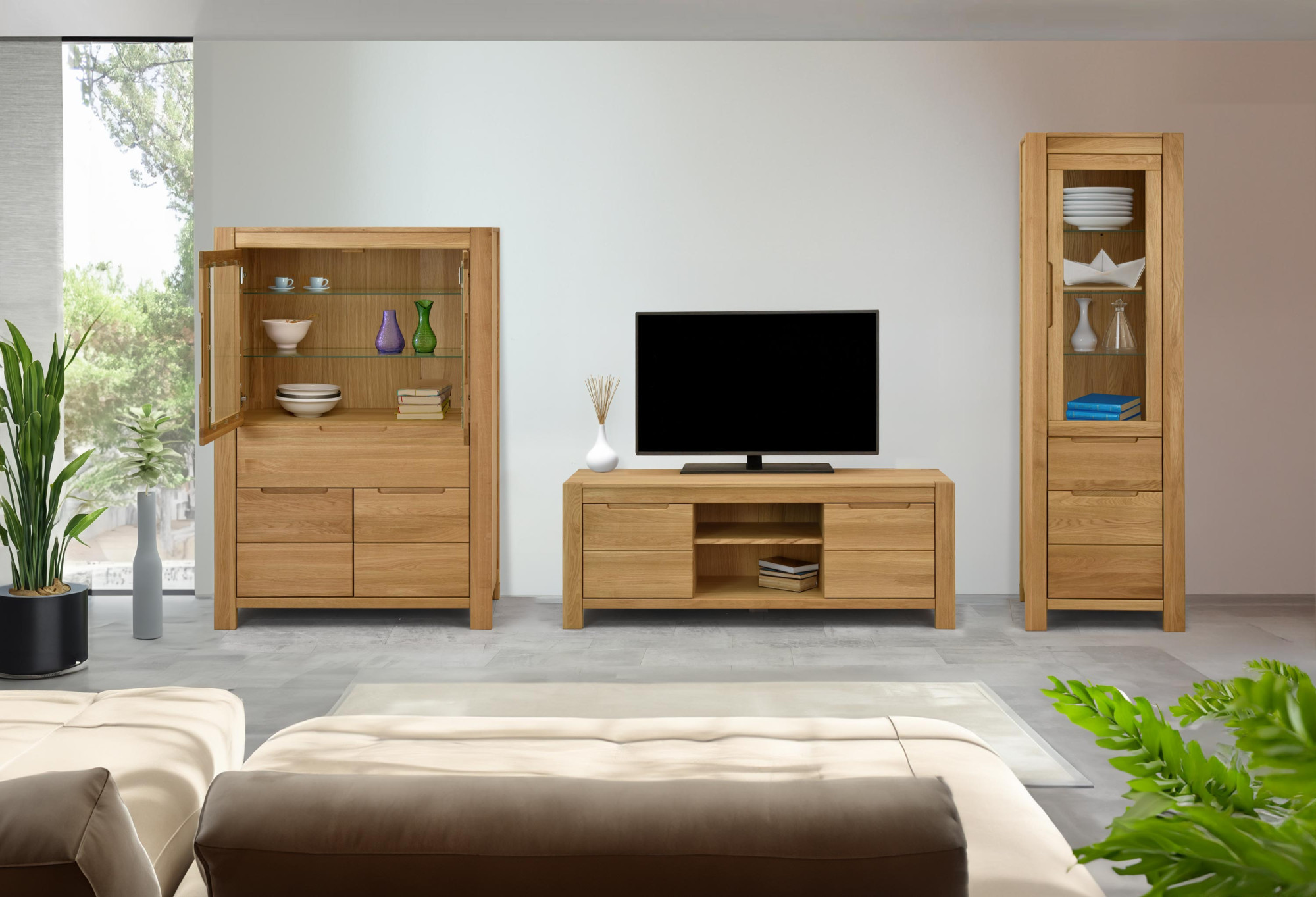 Dubová TV komoda 160 cm široká z kolekcie Napoleon prináša do obývačky elegantné spojenie prírodného materiálu a modernej funkčnosti. Dva uzavreté oddiely s tlmeným dovieraním ukryjú prehrávače aj káble, zatiaľ čo priestranná otvorená polica nechá vyniknúť soundbaru či dekoráciám. Vstavané úchytky nerušia čisté línie a komoda tak pôsobí ľahko aj v menšej miestnosti. Vďaka kompaktnej šírke 160 cm sa dobre kombinuje s menšími sedačkami aj rohovými zostavami a vytvára vizuálne vyvážené centrum domácej zábavy.