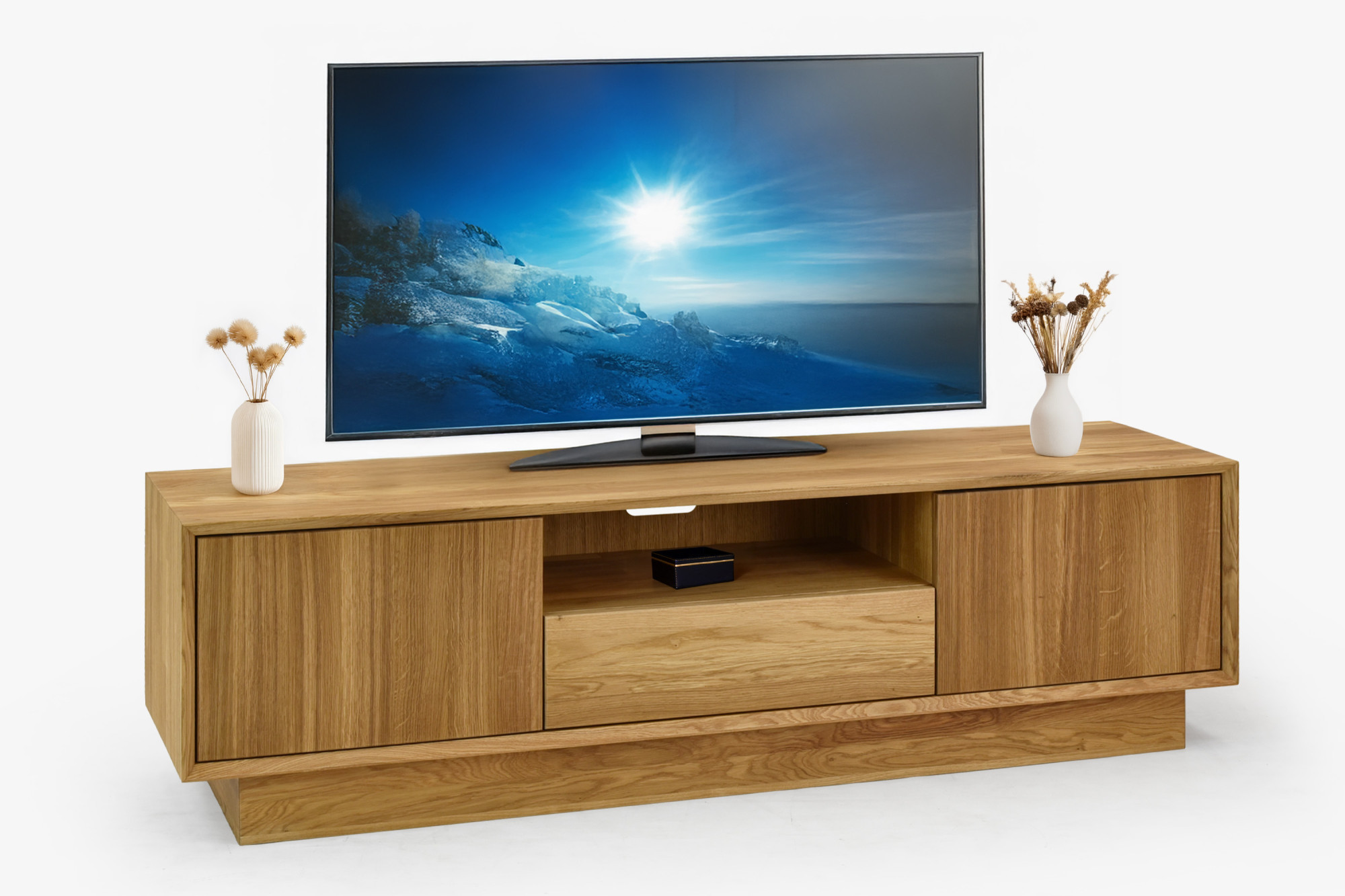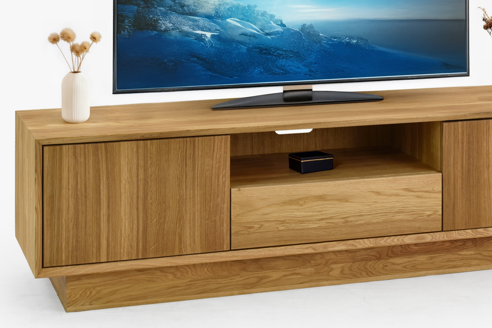 Masívna televízna komoda z dubu je elegantný a odolný kus nábytku, ktorý vnesie do vášho domova teplo prírodného materiálu a zároveň poskytne praktické úložné priestory. Celá komoda je vyrobená z kvalitného dubového dreva, vrátane korpusu, predných aj vnútorných častí. Dubové drevo sa pýši svojou pevnosťou, dlhou životnosťou a nadčasovou krásou, ktorú umocňuje povrchová úprava prírodným olejom. Po stranách sa nachádzajú uzatvárateľné dvierka, zatiaľ čo stredná časť je otvorená – ideálna na umiestnenie elektroniky či dekorácií. S celkovou šírkou 160 cm poskytuje dostatok priestoru, bez pocitu masívnosti či ťažkopádnosti.