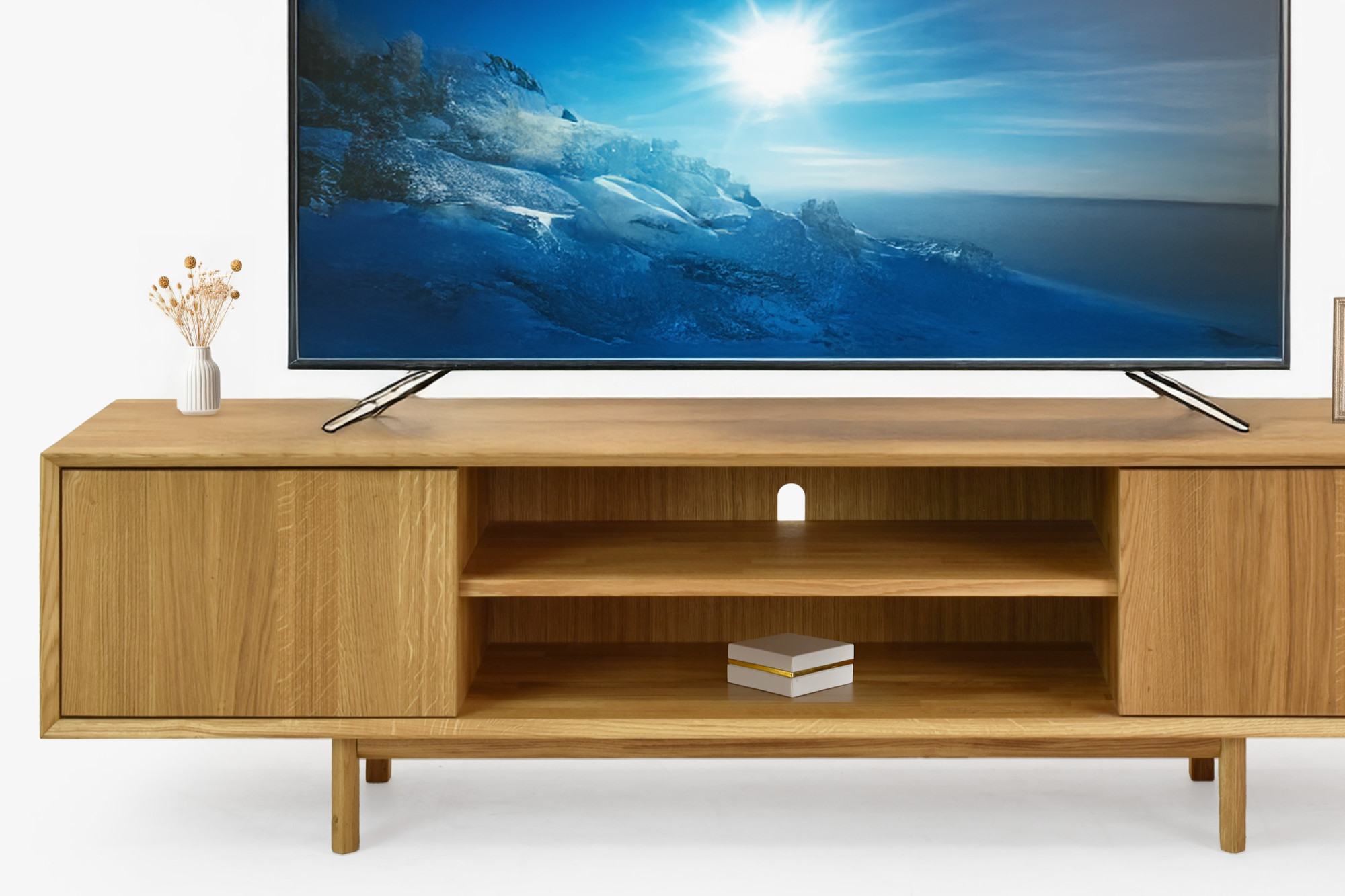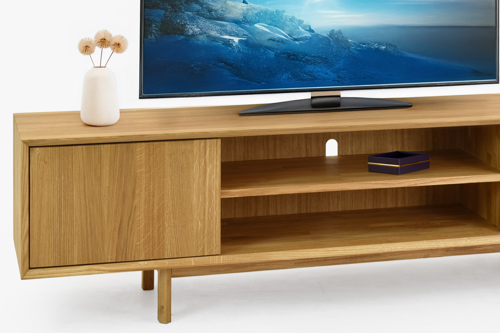 Masívna TV komoda na nožičkách kombinuje funkčnosť, kvalitu a moderný vzhľad v jednom. Vďaka svojej väčšej šírke 180 cm ponúka dostatok priestoru pre televíziu, elektroniku i dekorácie. Jej elegantné nožičky dodávajú celej konštrukcii ľahkosť a praktickú výhodu pri upratovaní. Vyrobená z kvalitného dubového dreva a ošetrená prírodným olejom, vydrží dlhé roky v perfektnom stave.