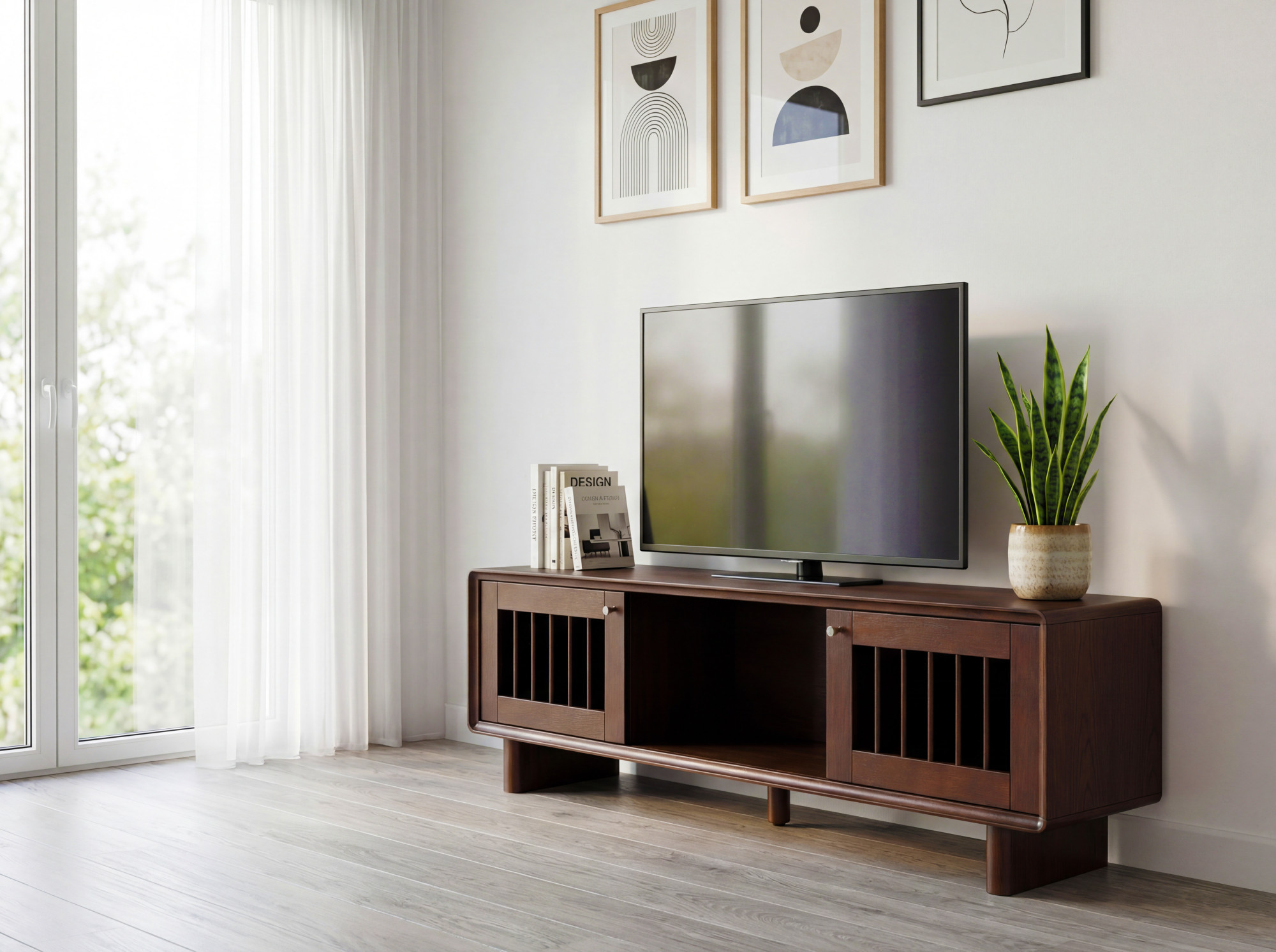 TV stolík stojí na elegantných masívnych drevených nohách, ktoré nábytku dodávajú stabilitu a vzdušný vzhľad. Posuvné dvierka s lamelovou výplňou sú vybavené systémom soft-close pre tiché a plynulé zatváranie. Kovové úchytky v modernom prevedení podčiarkujú exkluzívny dizajn celého kusu. Zaoblené hrany dodávajú stolíku moderný charakter a zároveň zvyšujú bezpečnosť v domácnosti. Povrch je ošetrený matným lakom, ktorý účinne chráni drevo a krásne zvýrazňuje jeho prirodzenú štruktúru.