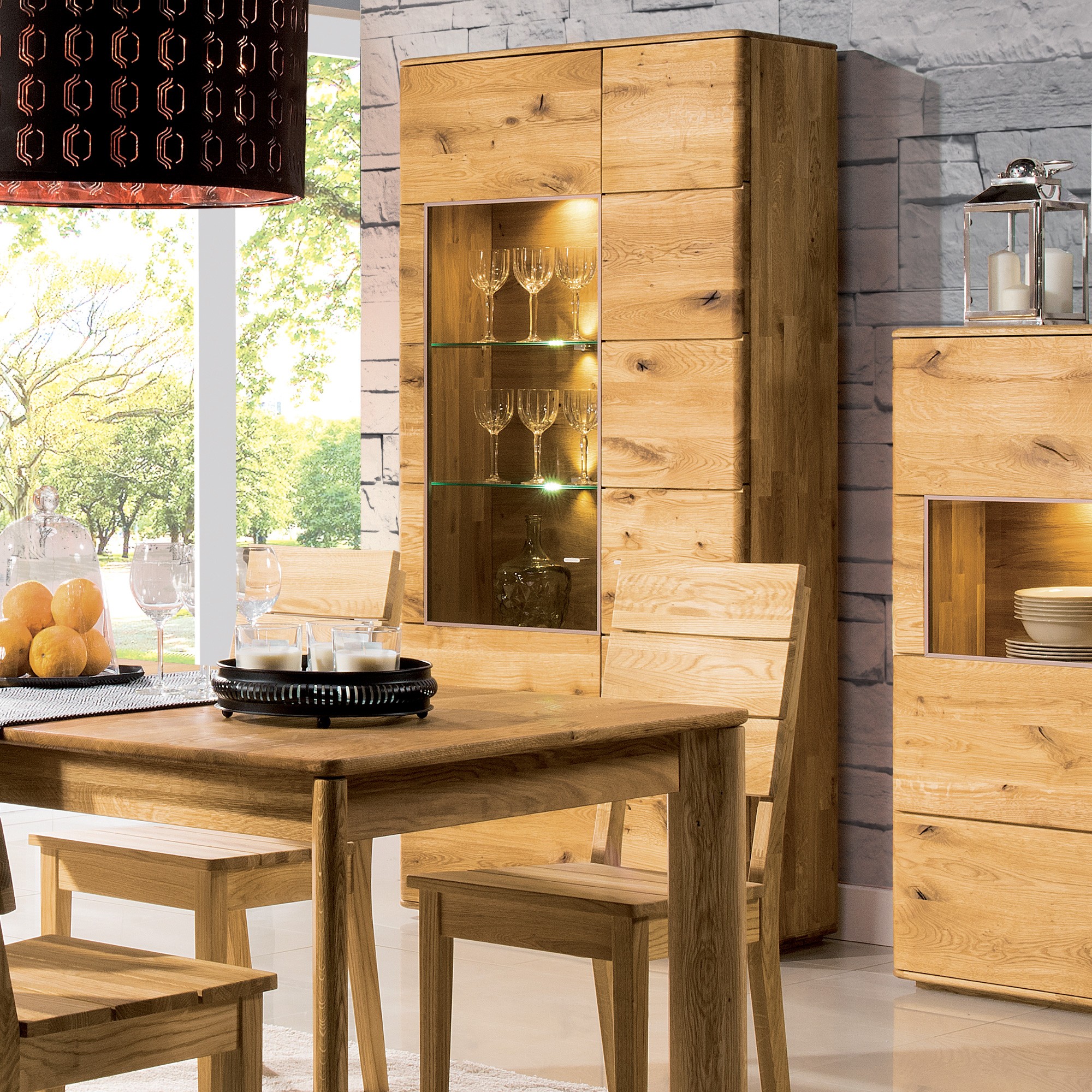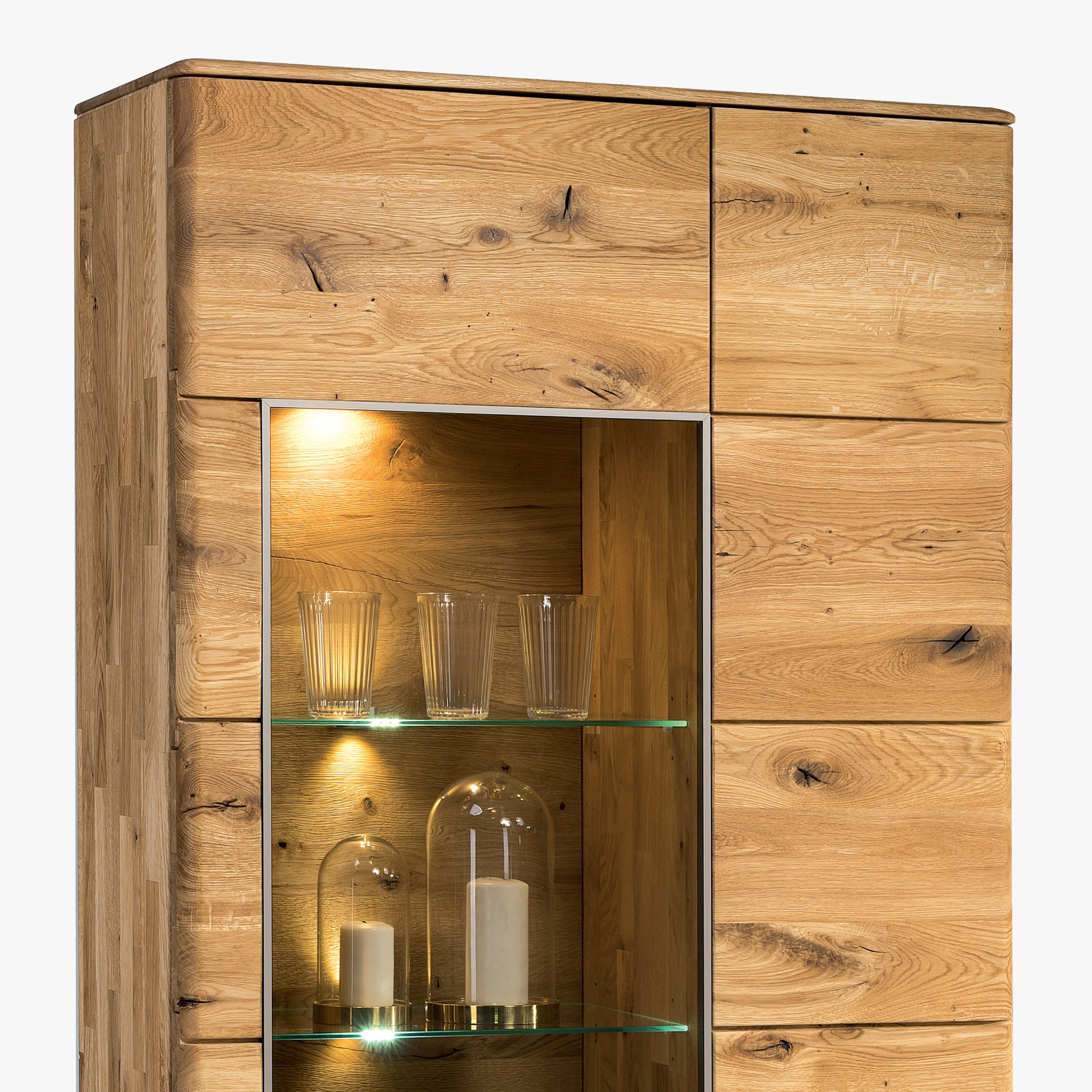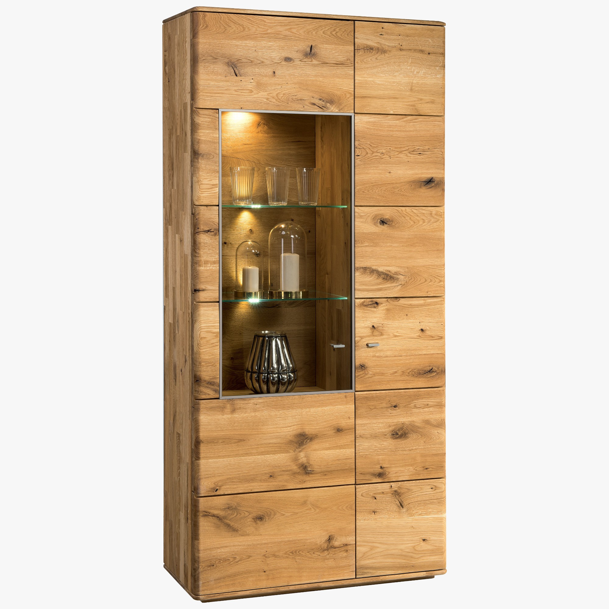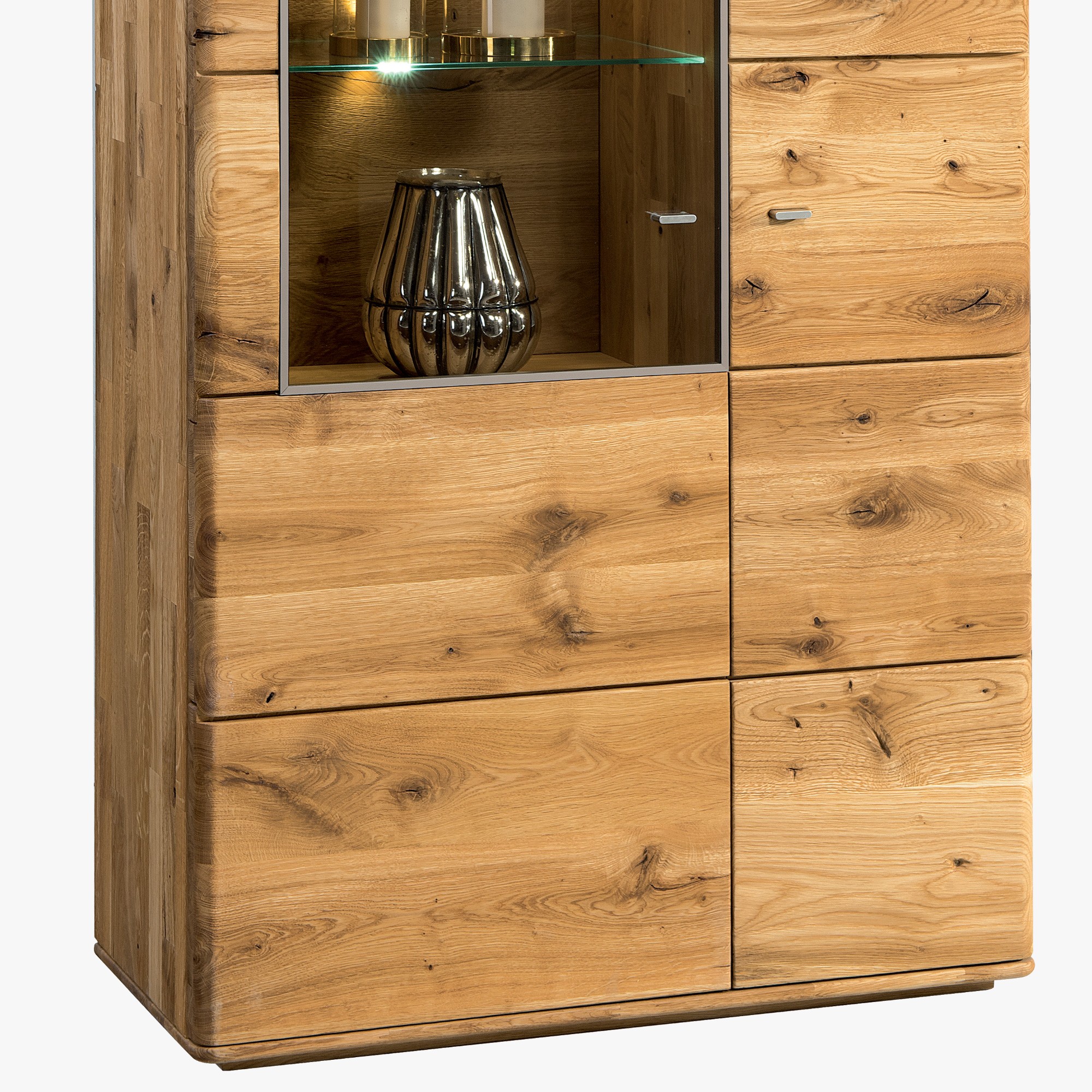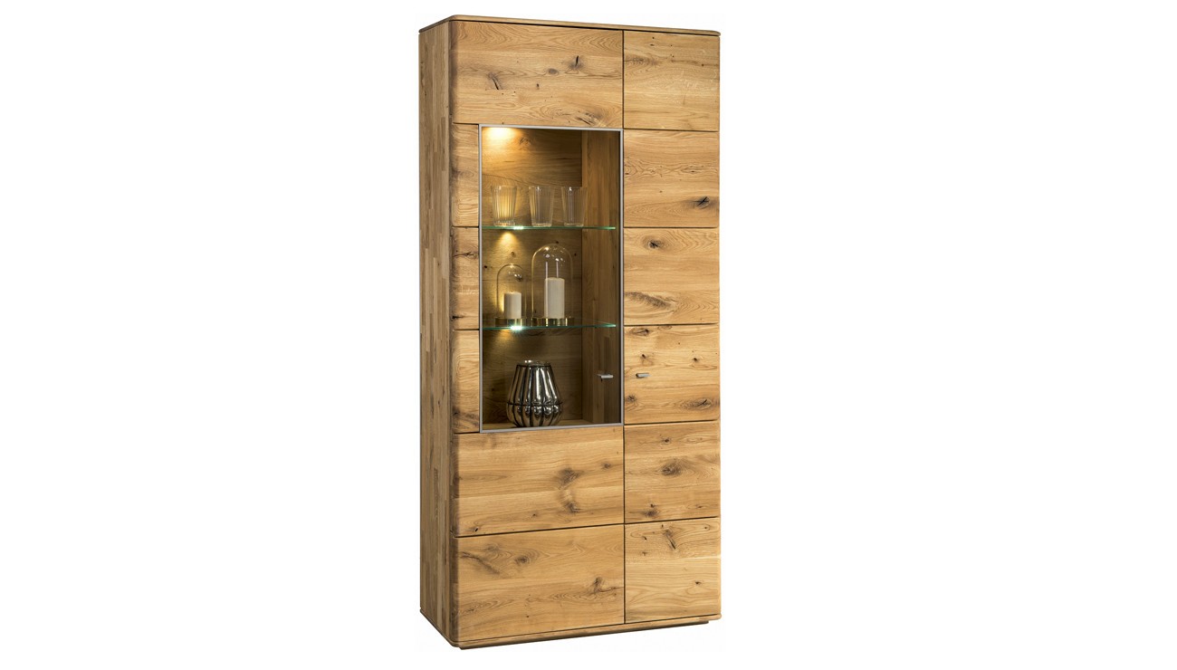 Dopriať si praktickosť vitrín a zároveň zútulniť váš domov teplým drevom, tak to môžete jedine s dubovou kolekciou Texas. Vysoká komoda, polopresklená, polozatvorená, je jej súčasťou. Spolu s ďalším dubovým nábytkom tvorí veľmi luxusnú kolekciu z prírodného dubového masívu. Kolekcia je vhodná na zariadenie jedální a obývacích izieb. Do usporiadania vašej domácnosti vám nechceme zasahovať, preto je iba na vás, kde si nábytok umiestnite. Vysoká a čiastočne presklená vitrína však najlepšie zapadne do jedálne. Do presklenej policovej časti si môžete vystaviť reprezentatívny inventár a iné veci, do zatvoreného priestoru potom všetko ostatné.