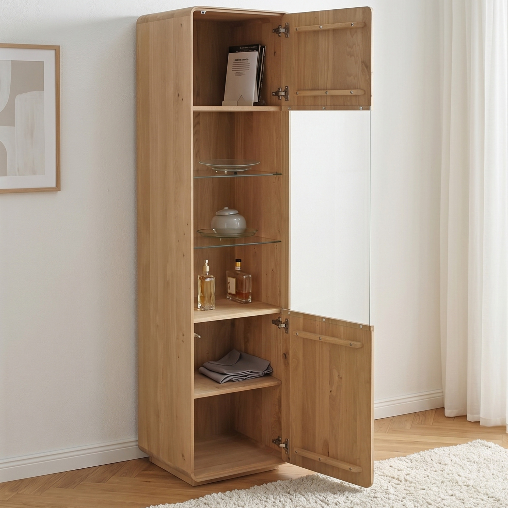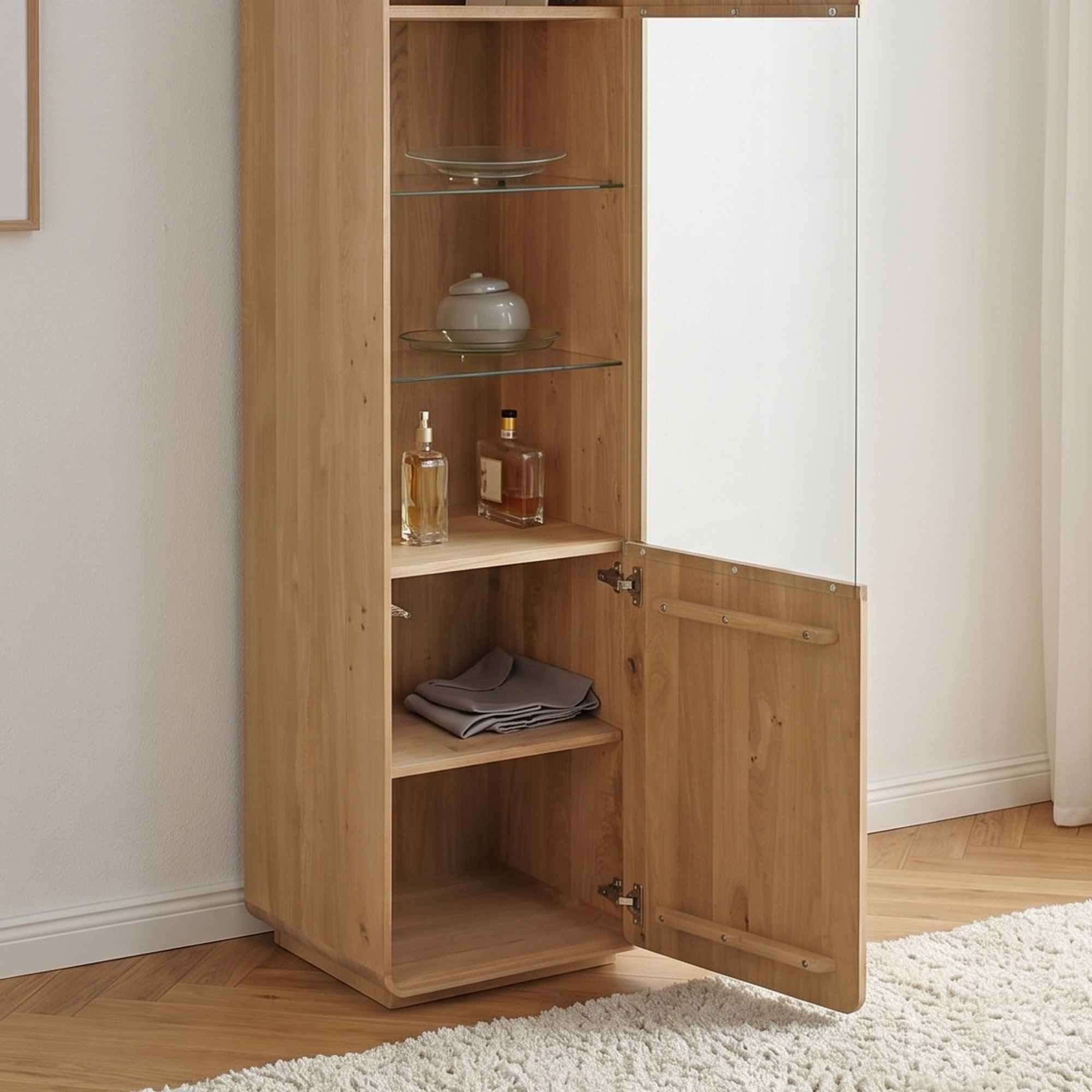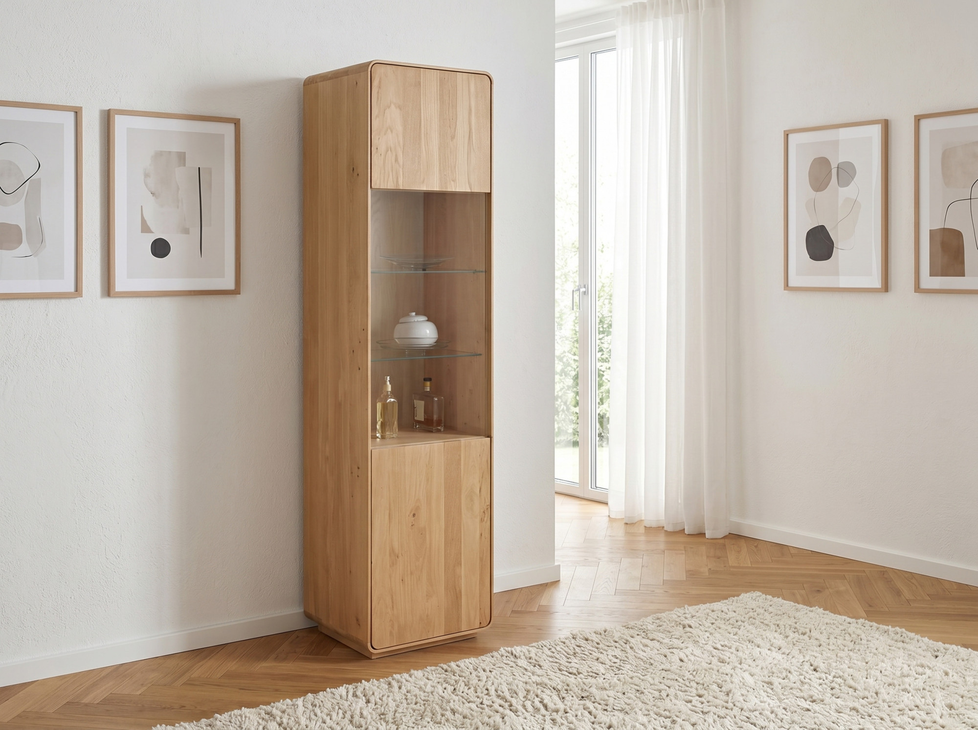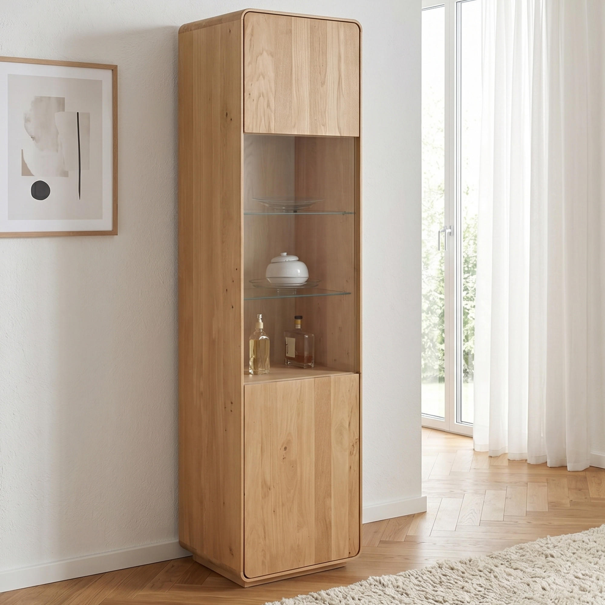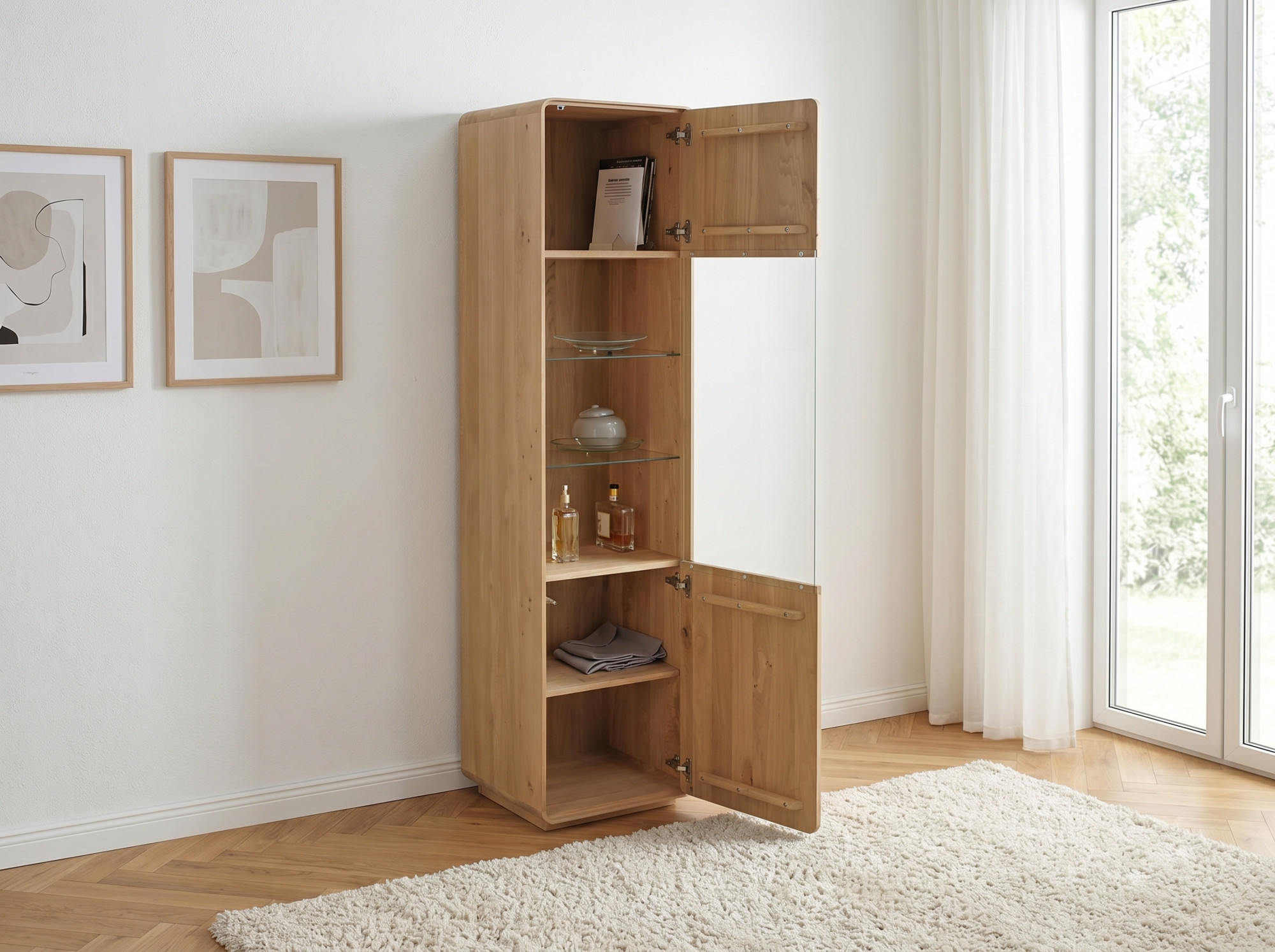 Predstavujeme vám jedinečnú jednodverovú dubovú vitrínu z našej prestížnej kolekcie Avalon, ktorá je vyrobená z kvalitného dubového dreva, poskytujúceho nielen trvácnosť a stabilitu, ale aj pridávajúceho vášmu interiéru teplý a prirodzený vzhľad. Táto vitrína, ošetrená prírodným olejom v farbe dub biely, je dokonalým spojením moderného dizajnu a praktickosti, ponúkajúca ideálny priestor na vystavenie vašich najcennejších kúskov alebo kníh. FSC certifikát zabezpečuje, že drevo bolo získané zodpovedne a udržateľne, čo je v súlade s naším záväzkom k ochrane životného prostredia. Dvere vitríny sú vybavené systémom tip on pre jednoduché otváranie stlačením, čo podčiarkuje minimalistický a užívateľsky prívetivý dizajn. Okrem toho, vďaka zaobleným rohom, vitrína prináša do každého priestoru jemnosť a eleganciu, zatiaľ čo jej montáž je maximálne zjednodušená – vitrína je dodávaná už plne zostavená.
