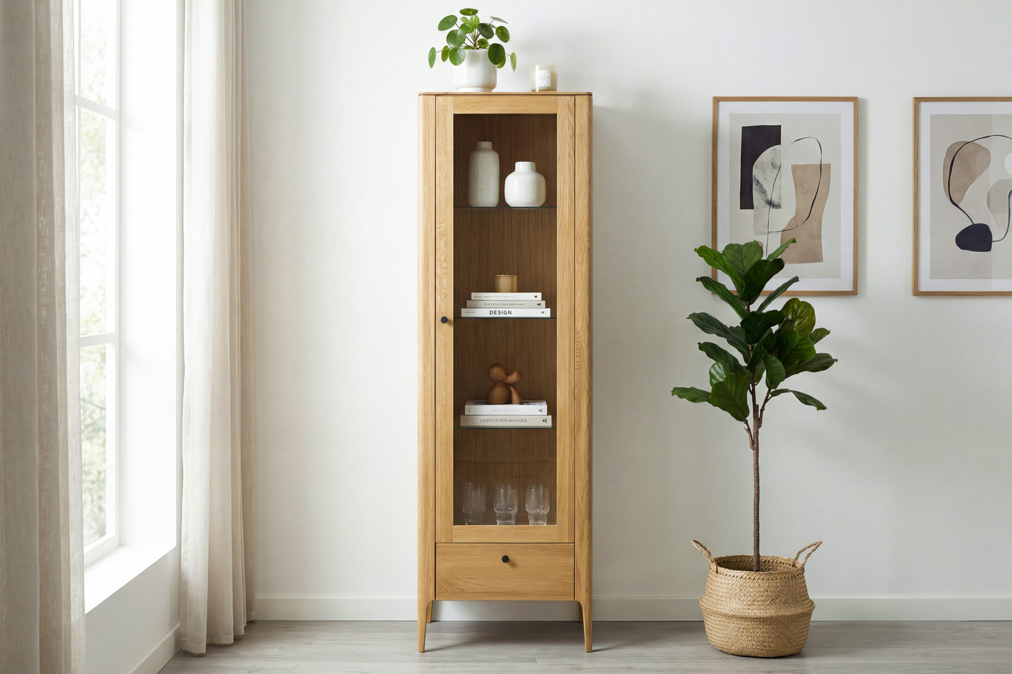 Táto jednodverová vitrína je veľmi praktická vďaka svojmu premyslenému usporiadaniu. Disponuje jednými presklenými dvierkami a jedným priestranným zásuvkou, ktoré poskytujú dostatok úložného priestoru pre vaše potreby. Vnútorná časť vitríny je vybavená tromi sklenenými policami, ktoré sú ideálne na vystavenie vašich obľúbených dekorácií, porcelánu alebo pohárov. Všetky zásuvky a dvierka sú vybavené tichým zatváraním soft-close, čo zaisťuje hladký a tichý chod, čím predlžuje životnosť nábytku. Dvere vitríny majú univerzálnu stranu, čo znamená, že si môžete vybrať, či budú otvárané doprava alebo doľava, podľa vašich potrieb a dispozície miestnosti.