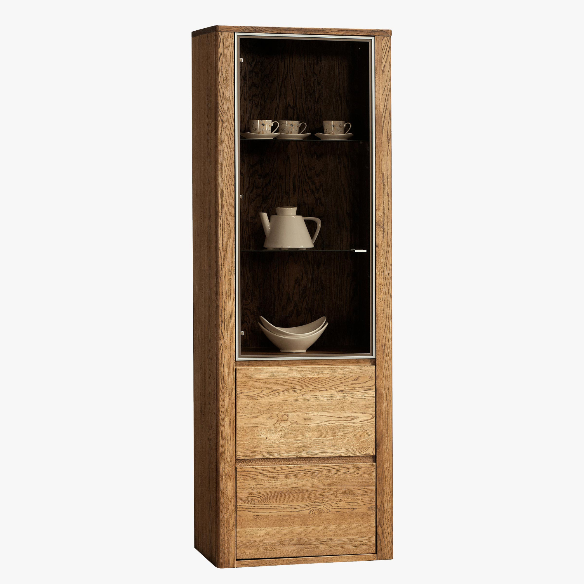 Vitrína je vysoká takmer dva metre a jej vnútro je dômyselne rozdelené na dve časti! Vrchná časť vitríny je vybavená sklenenými policami zo špeciálneho tvrdeného skla. Tento priestor je krytý presklenými dvierkami v elegantnom hliníkovom ráme a s drobnou úchytkou. Spodná časť vitríny je vybavená drevenou policou a opatrená plnými drevenými dvierkami s bezúchytkovým otváraním. Ľahké otváranie je zabezpečené pomocou skosenia vrchnej hrany dvierok. Obe dvierka sú opatrené kovaniami so systémom tichého samo-zatvárania soft-stop, ktoré dotvára dojem luxusu a kvality.