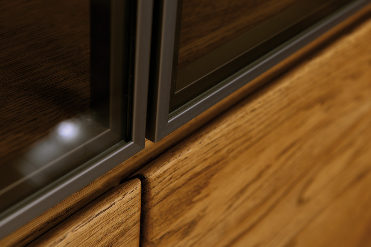 Moderná vitrína z dubového masívu z kolekcie NICE, dubového nábytku, vitrína je rozdelená do troch častí, ľavá strana má presklenené dvierka s tromi sklenenými policami,
