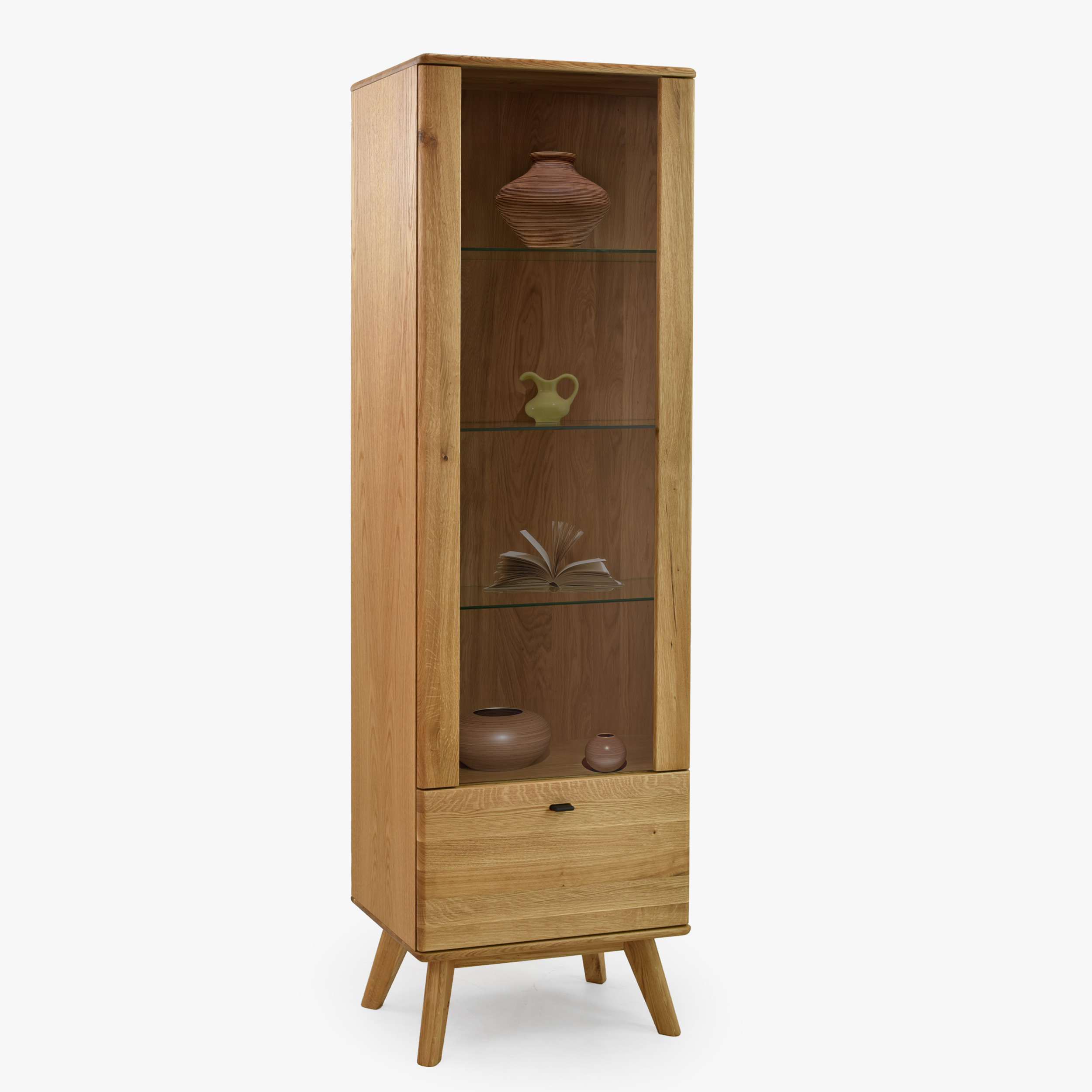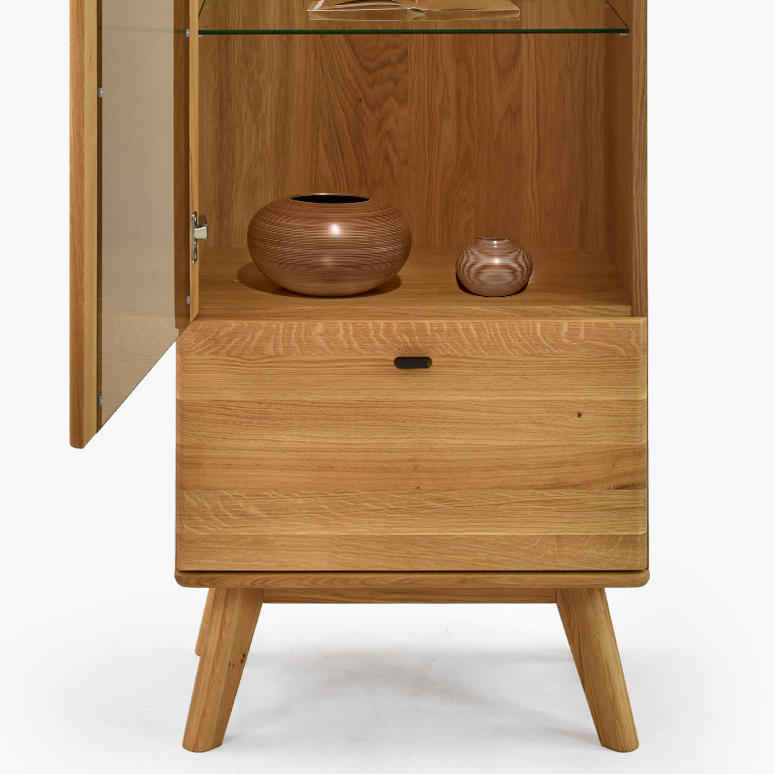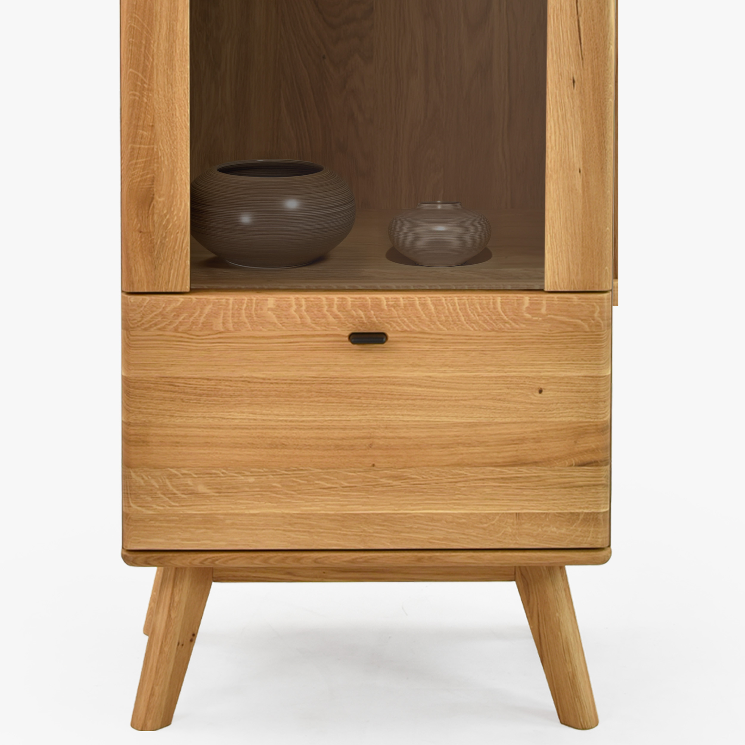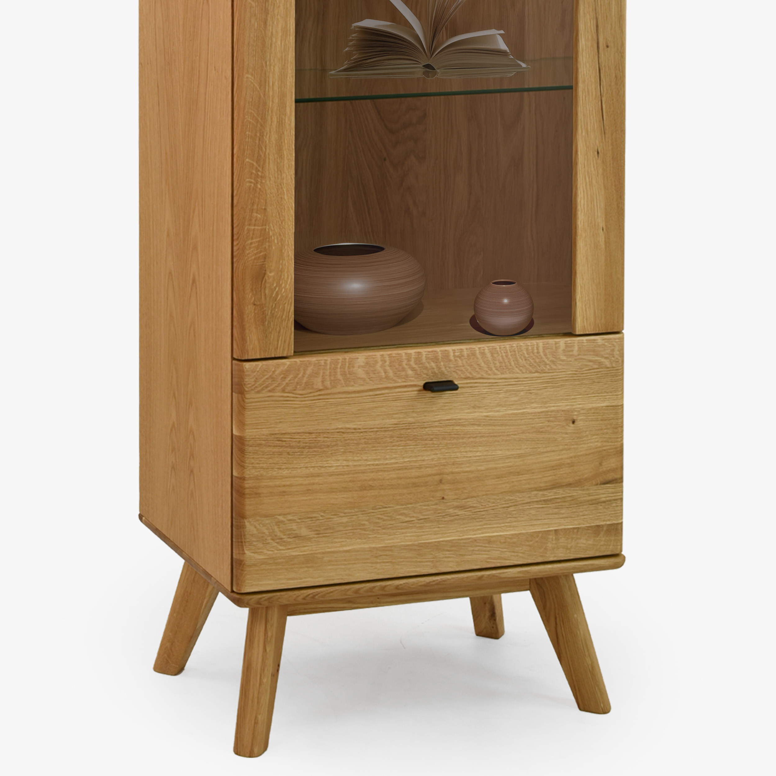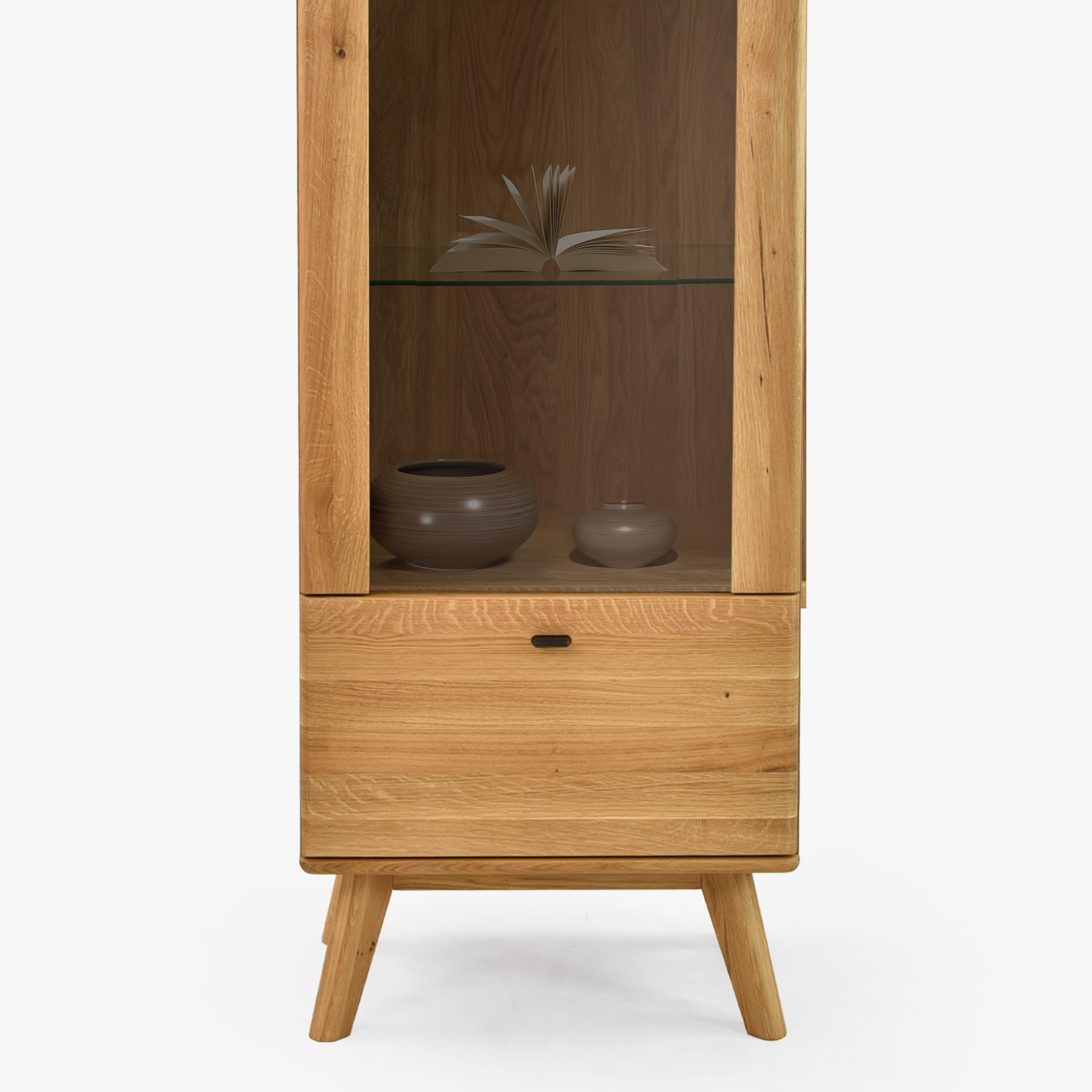 Jednodverová masívna vitrína na nohách z kolekcie Jánošík predstavuje spojenie prírodného dubového dreva, moderného dizajnu a precízneho remeselného spracovania. Tento model je ideálnou voľbou pre každého, kto ocení kvalitu pravého masívu a chce do svojho domova vniesť kúsok prírody. Vitrína je vyrobená v kombinácii masívneho dubu (horná doska, čelné časti, nohy a konštrukčné prvky) a prémiovej dubovej dyhy (boky a korpus), čo zaručuje dokonalý vzhľad aj dlhú trvácnosť. Štandardne má dvierka s pántmi na ľavej strane, no vďaka predpríprave je možné ich ľahko prehodiť na pravú. Vo vnútri sa nachádzajú tri sklenené police pre vystavenie dekorácií, porcelánu alebo skla a v spodnej časti praktická zásuvka na drobnosti.