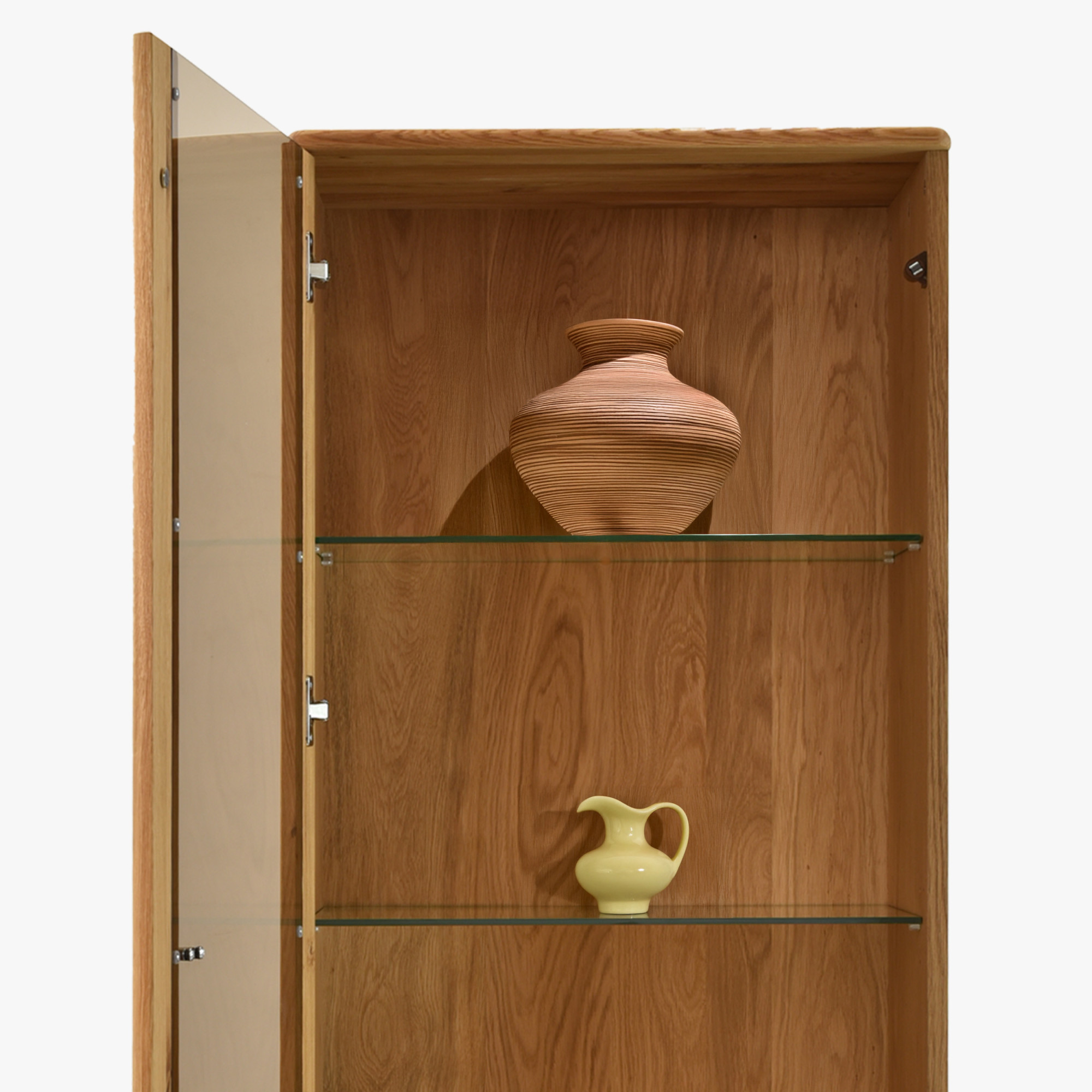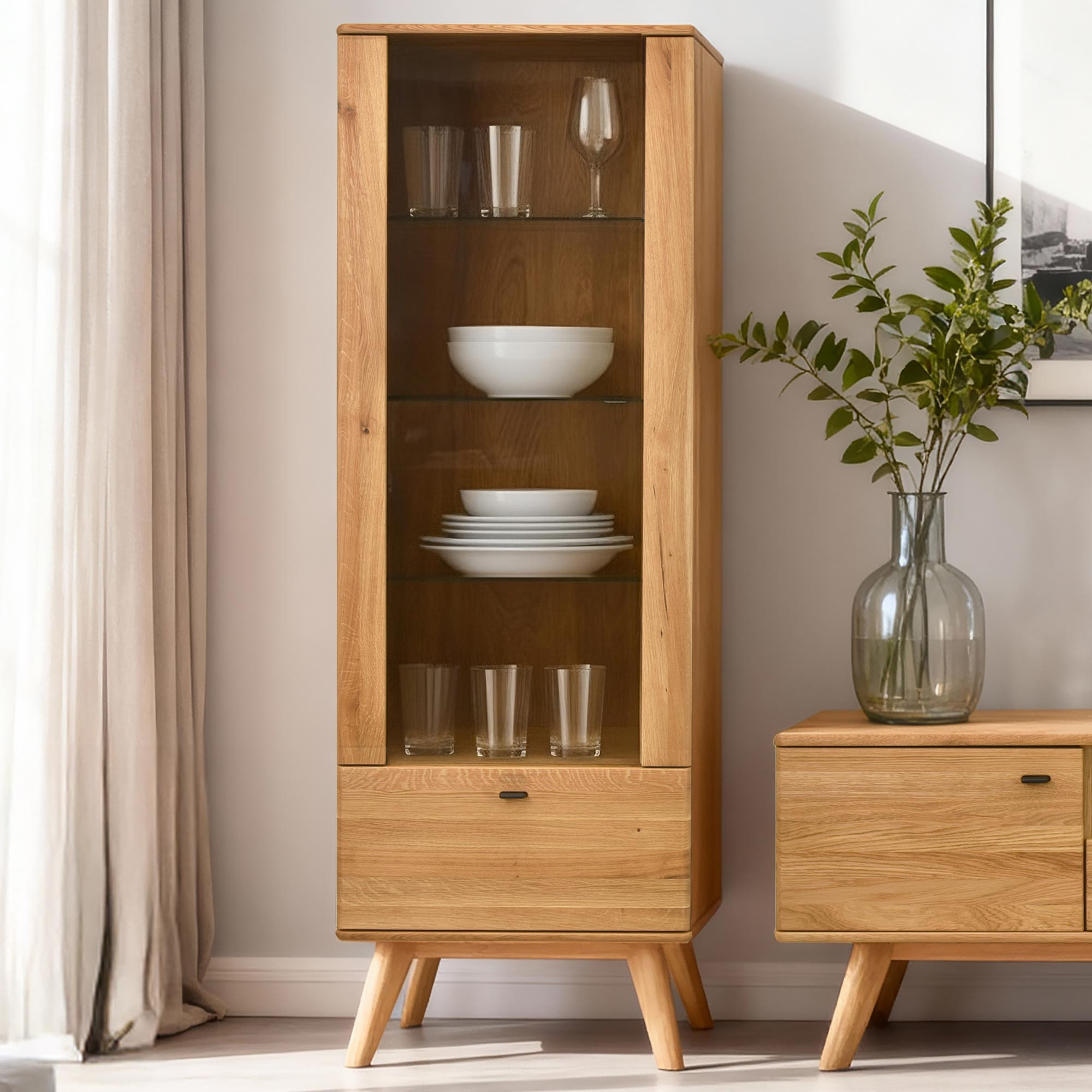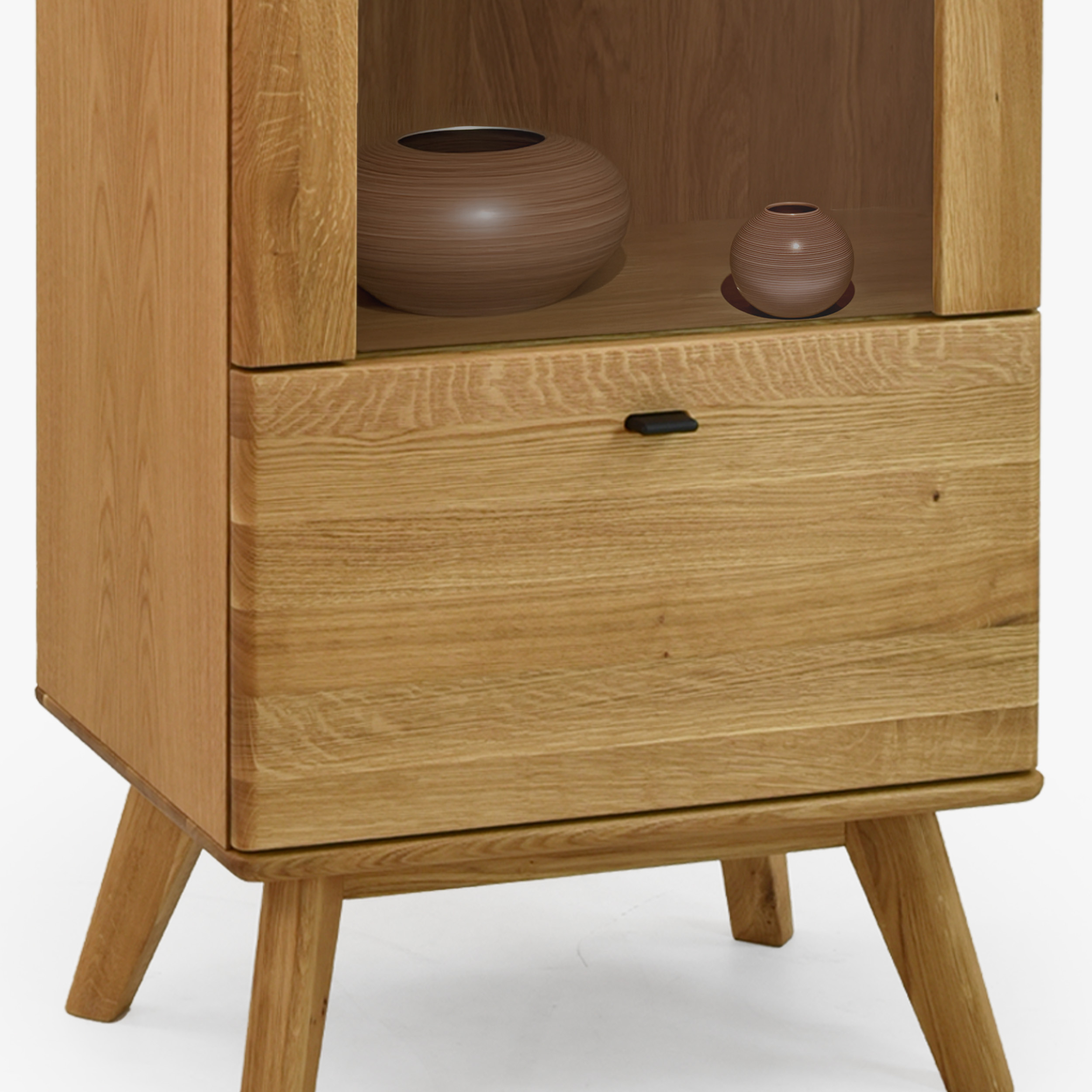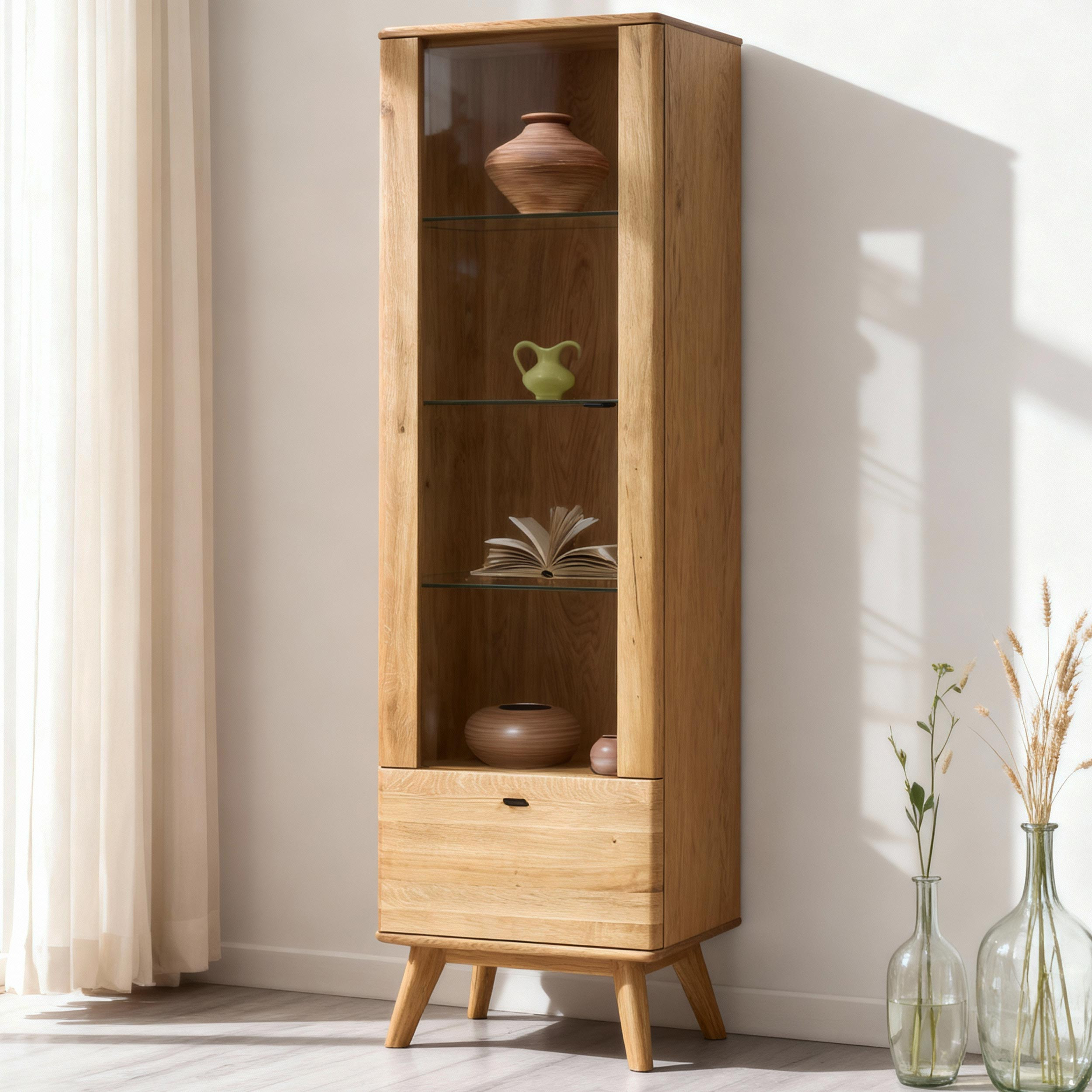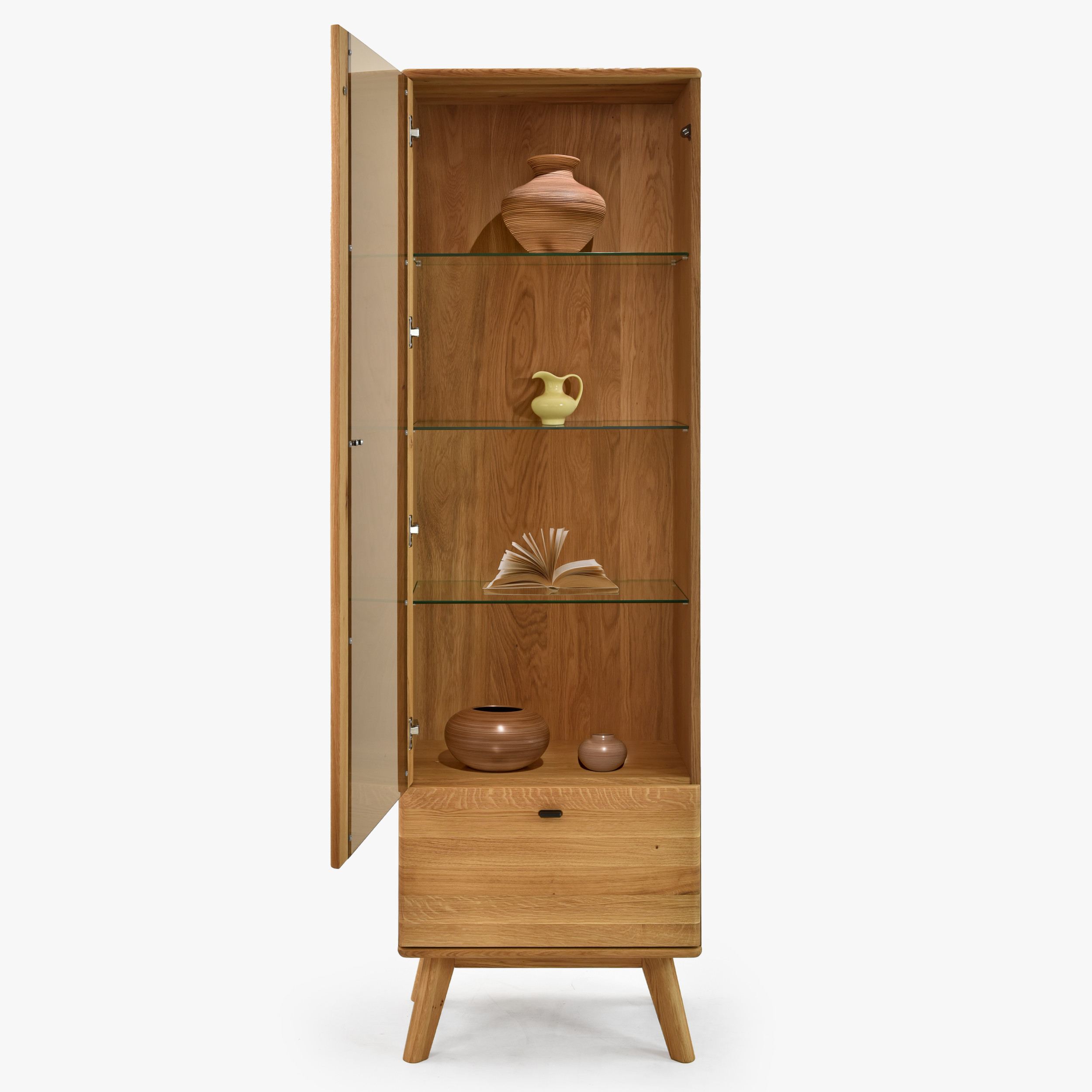 Jednodverová masívna vitrína na nohách z kolekcie Jánošík predstavuje spojenie prírodného dubového dreva, moderného dizajnu a precízneho remeselného spracovania. Tento model je ideálnou voľbou pre každého, kto ocení kvalitu pravého masívu a chce do svojho domova vniesť kúsok prírody. Vitrína je vyrobená v kombinácii masívneho dubu (horná doska, čelné časti, nohy a konštrukčné prvky) a prémiovej dubovej dyhy (boky a korpus), čo zaručuje dokonalý vzhľad aj dlhú trvácnosť. Štandardne má dvierka s pántmi na ľavej strane, no vďaka predpríprave je možné ich ľahko prehodiť na pravú. Vo vnútri sa nachádzajú tri sklenené police pre vystavenie dekorácií, porcelánu alebo skla a v spodnej časti praktická zásuvka na drobnosti.