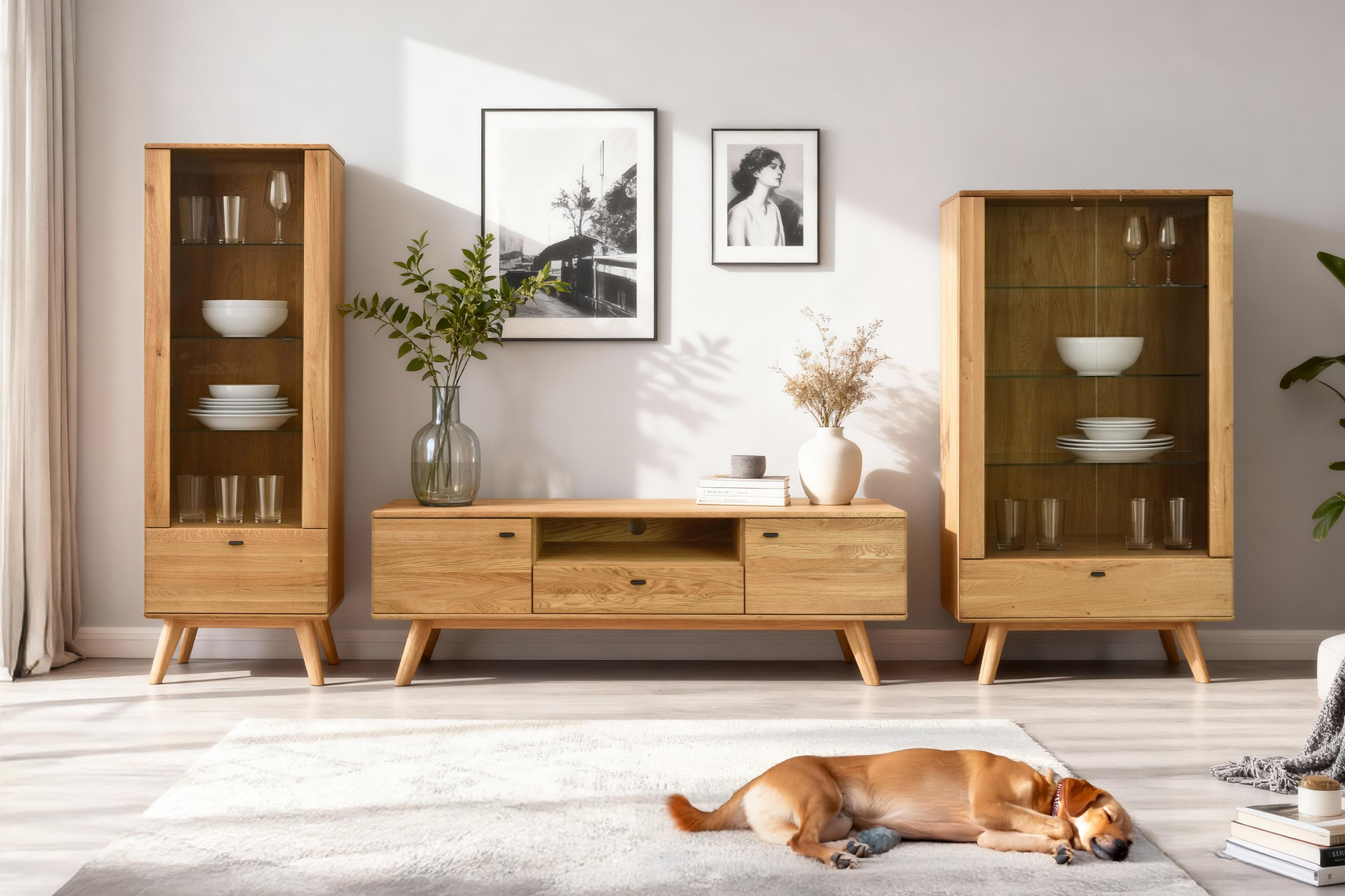 Všetky dvierka i zásuvky sú vybavené moderným systémom Soft-Close, ktorý zabezpečuje tiché a plynulé dovieranie. Povrch vitríny je ošetrený kvalitným nemeckým olejom Livos v odtieni prírodný olej, ktorý zvýrazňuje krásnu štruktúru dubu a poskytuje trvalú ochranu proti opotrebovaniu. Vďaka stabilnej konštrukcii na nohách pôsobí vitrína vzdušne a elegantne, pričom sa výborne kombinuje s ďalším nábytkom z dubového dreva zo série Jánošík. Použité drevo nesie FSC certifikát, ktorý potvrdzuje ekologicky zodpovedný pôvod materiálu.
