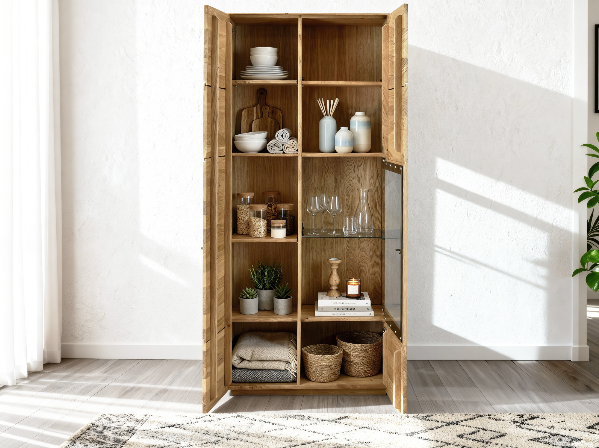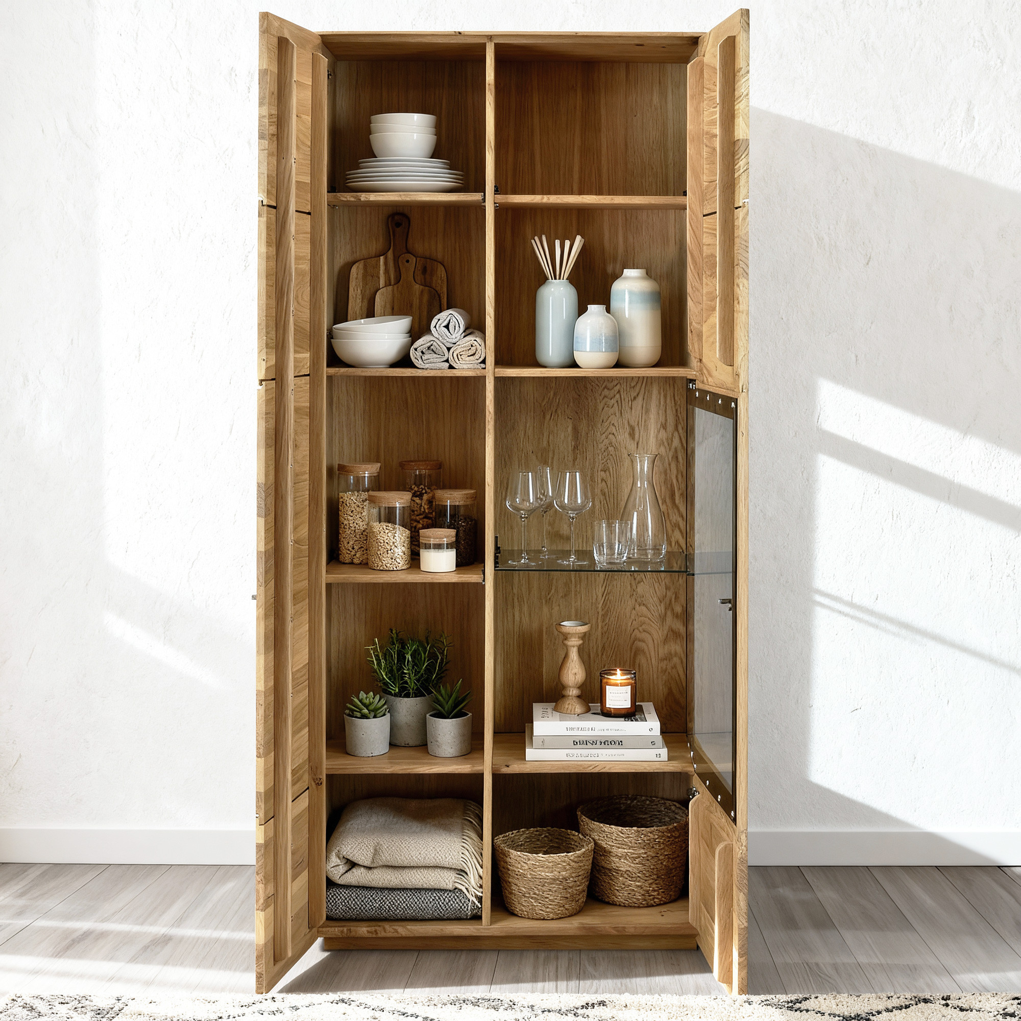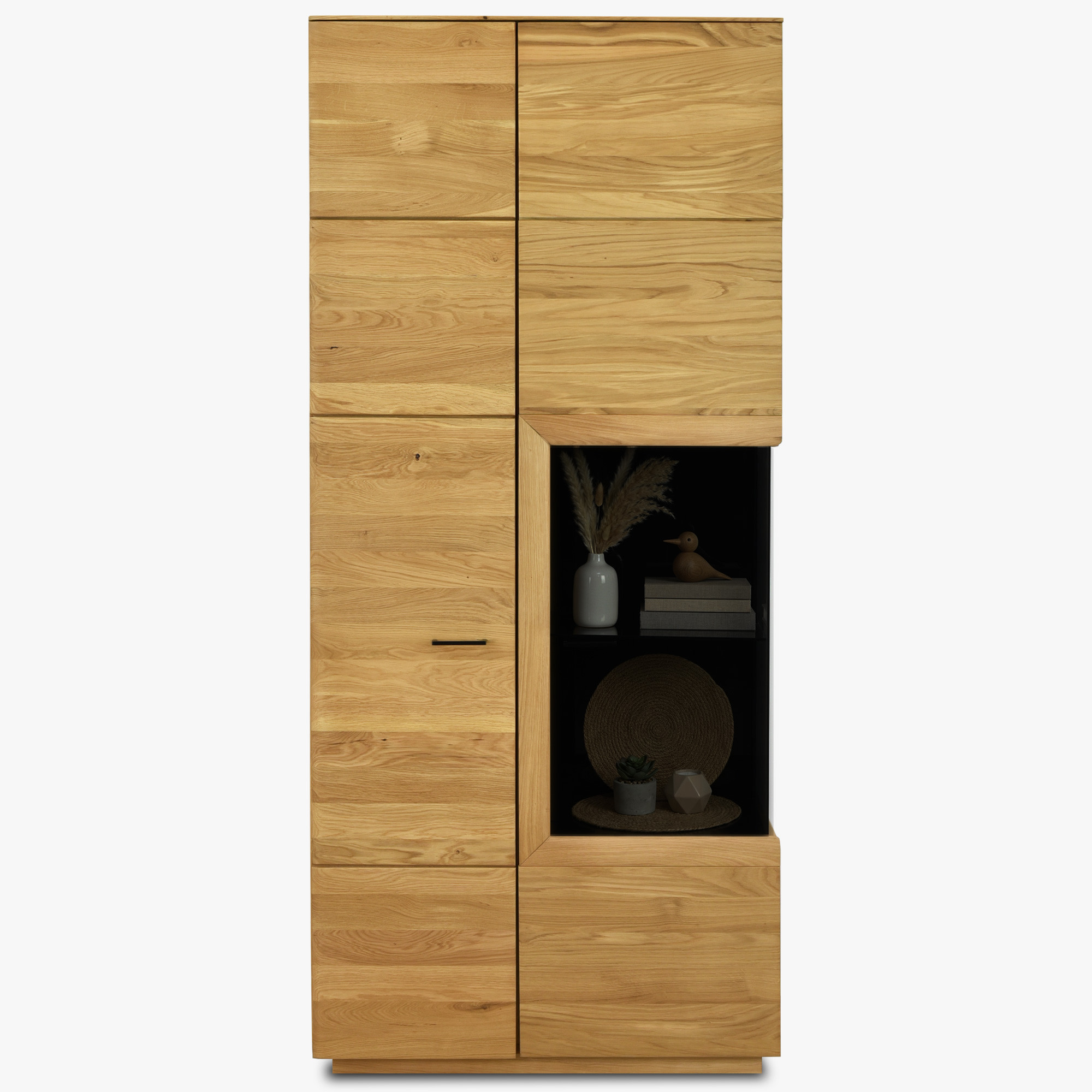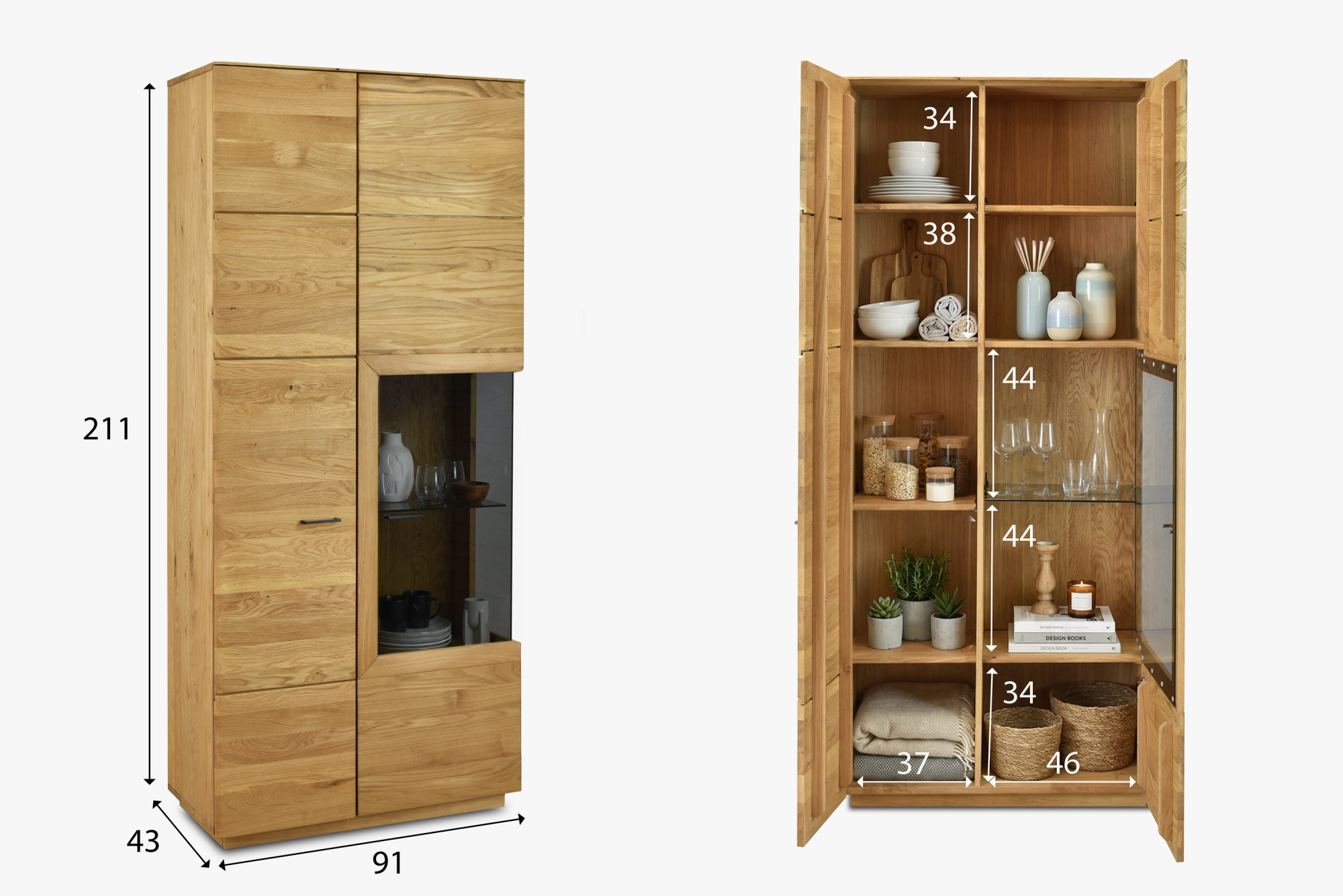Predstavujeme vám vysokú dubovú vitrínu z kolekcie Bosco, ktorá sa stane dominantou vašej obývacej izby alebo jedálne. Táto dvojdverová vitrína z masívneho dubu s celkovou výškou 211 cm a šírkou 91 cm ponúka veľkorysý úložný priestor pre vaše obľúbené predmety. Vitrína je vybavená dvoma dvierkami – jedny sú plne drevené pre skryté uloženie, druhé sú čiastočne presklené čiernym sklom, ktoré umožňuje elegantnú prezentáciu vašich cenností, porcelánu či dekorácií.