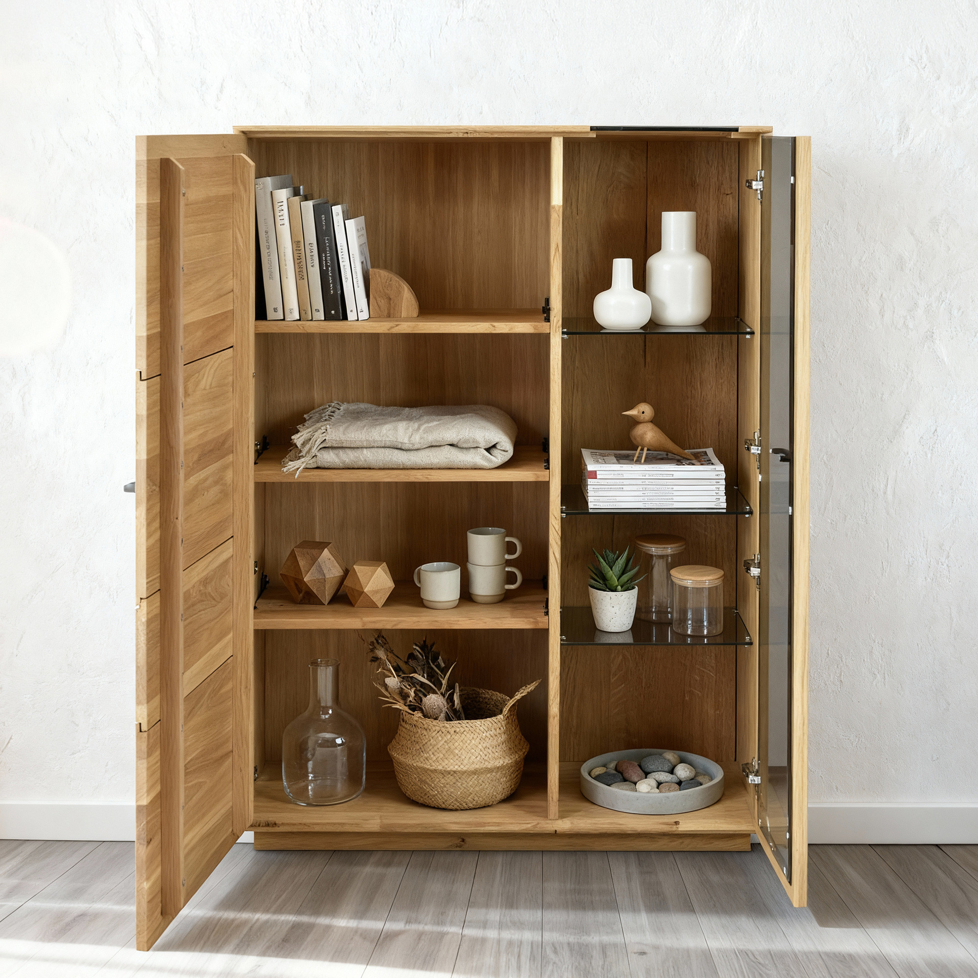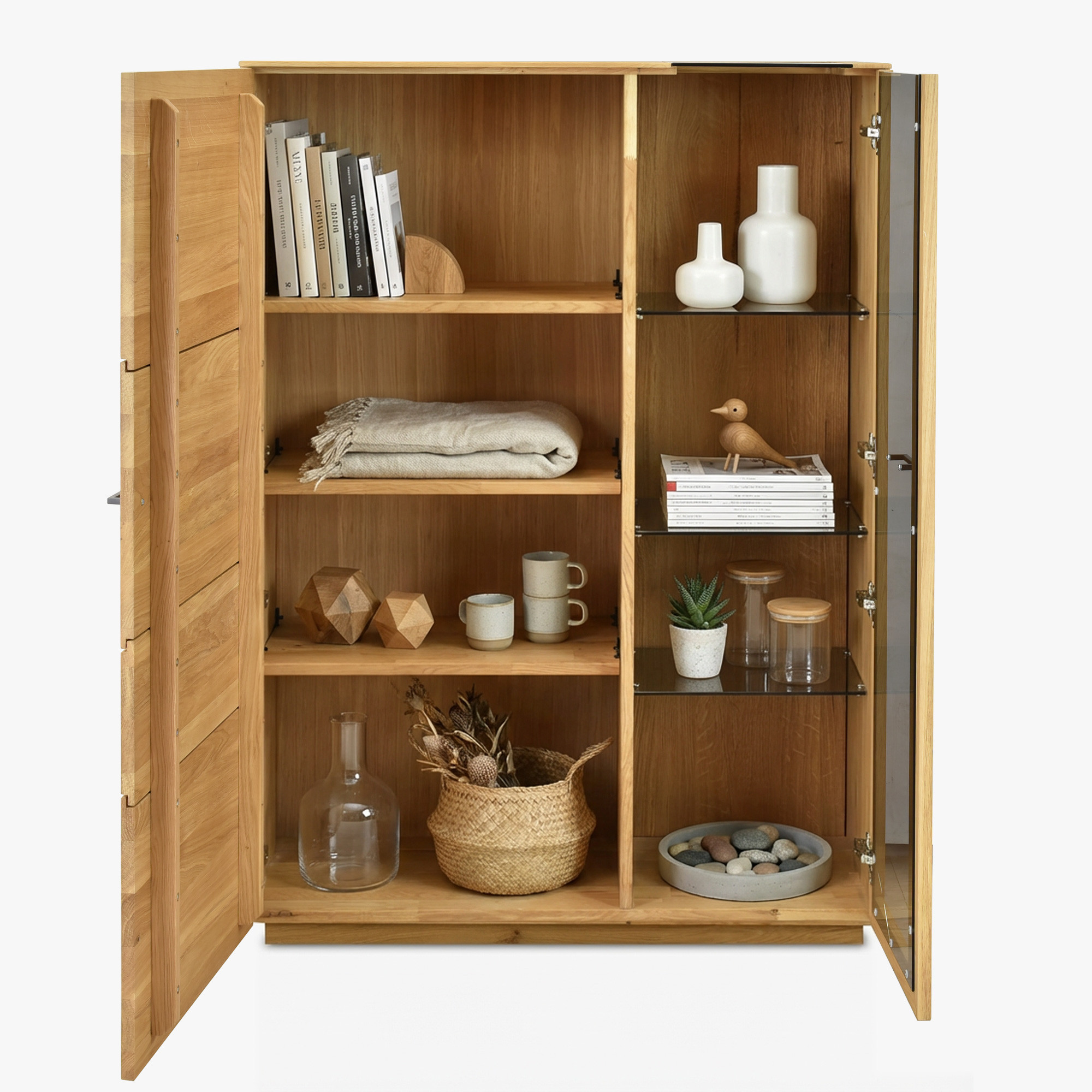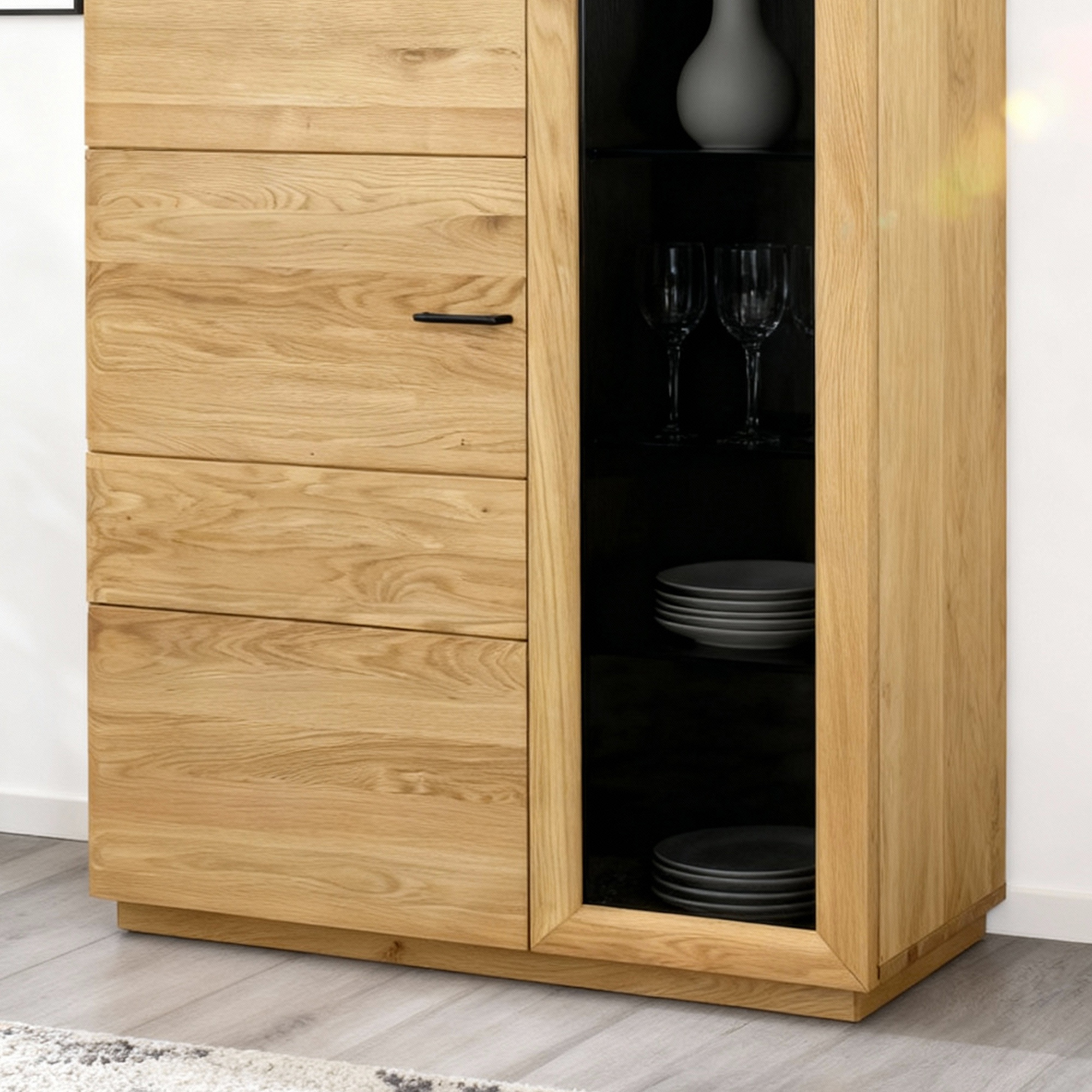 Vnútorný priestor vitríny je po otvorení prakticky rozdelený na dve polovice s množstvom odkladacích plôch. K dispozícii je jedna sklenená polica a niekoľko drevených políc pre variabilné usporiadanie. Kolekcia Bosco prináša moderný nábytok z prírodného dreva s typickými jemne zaoblenými hranami a ukončeniami, vďaka ktorým pôsobí nábytok luxusne a elegantne. Všetky kusy sú dodávané plne zmontované, takže odpadá zdĺhavá montáž. Povrch je ošetrený olejom v odtieni dub natural, ktorý krásne zvýrazňuje prirodzenú štruktúru dreva. Kusy kolekcie je možné vzájomne kombinovať.