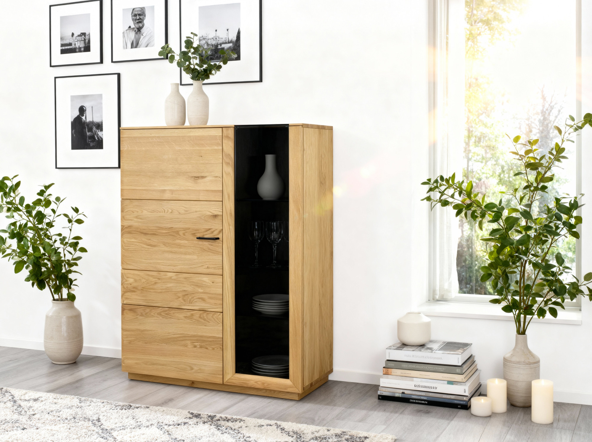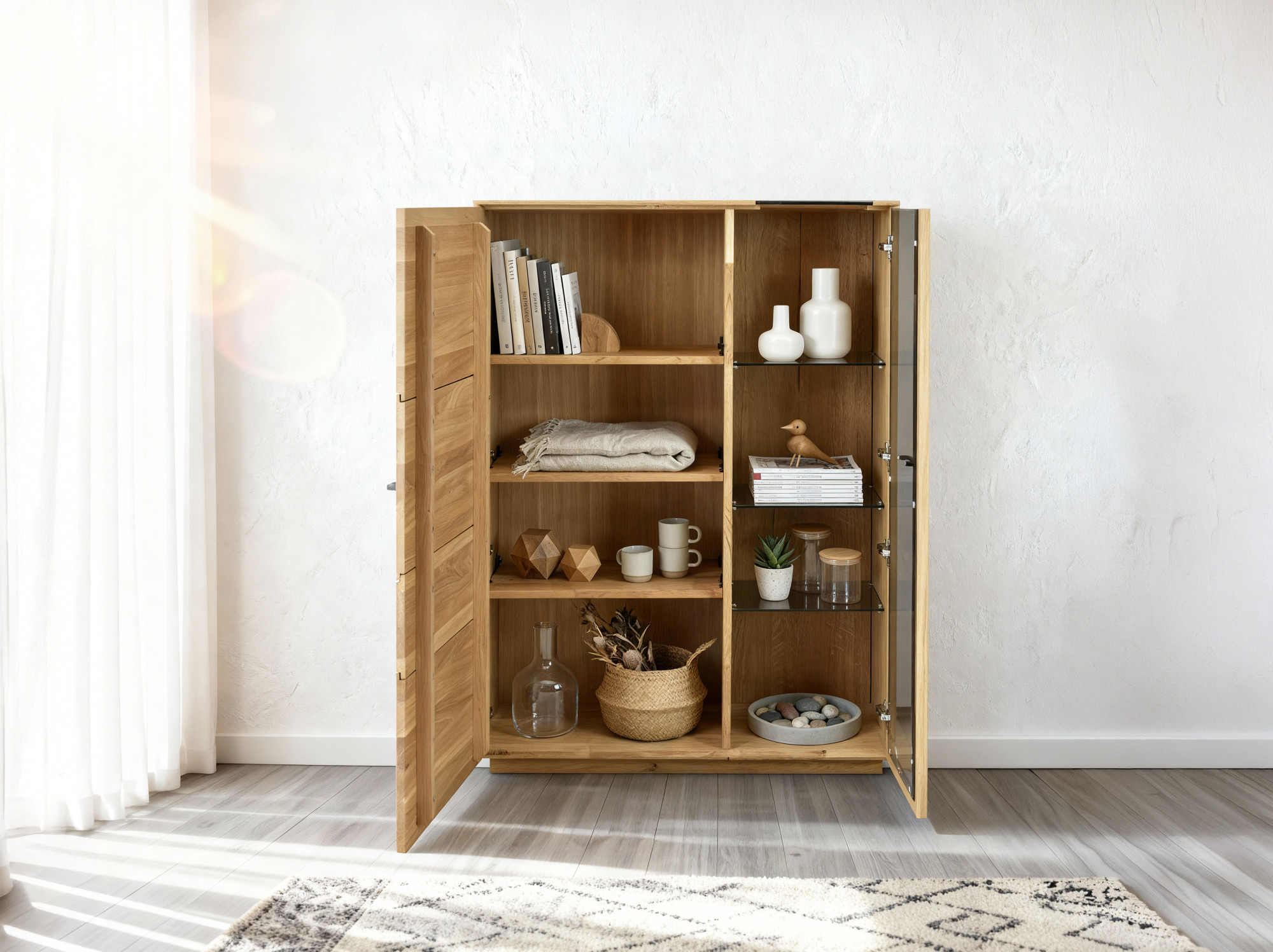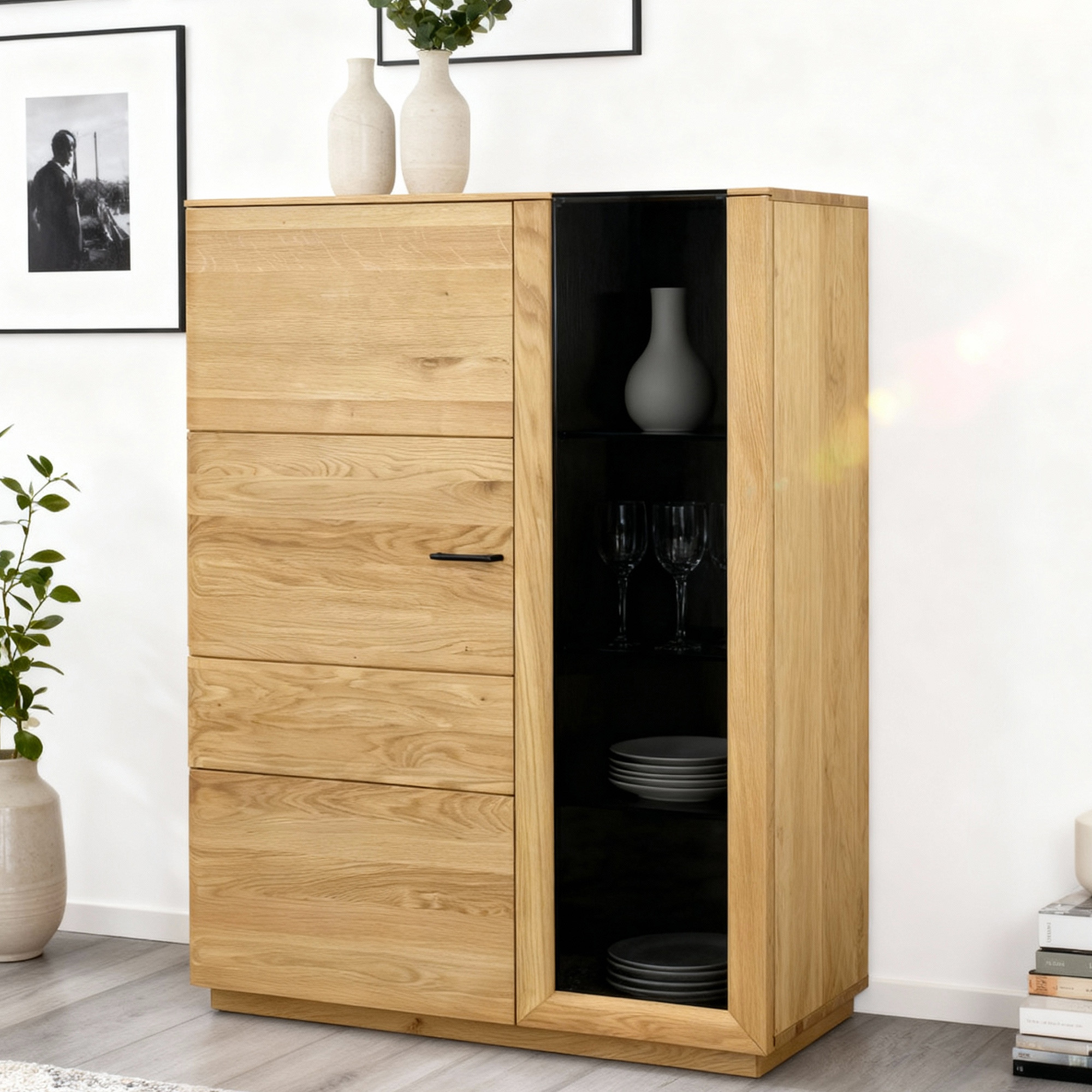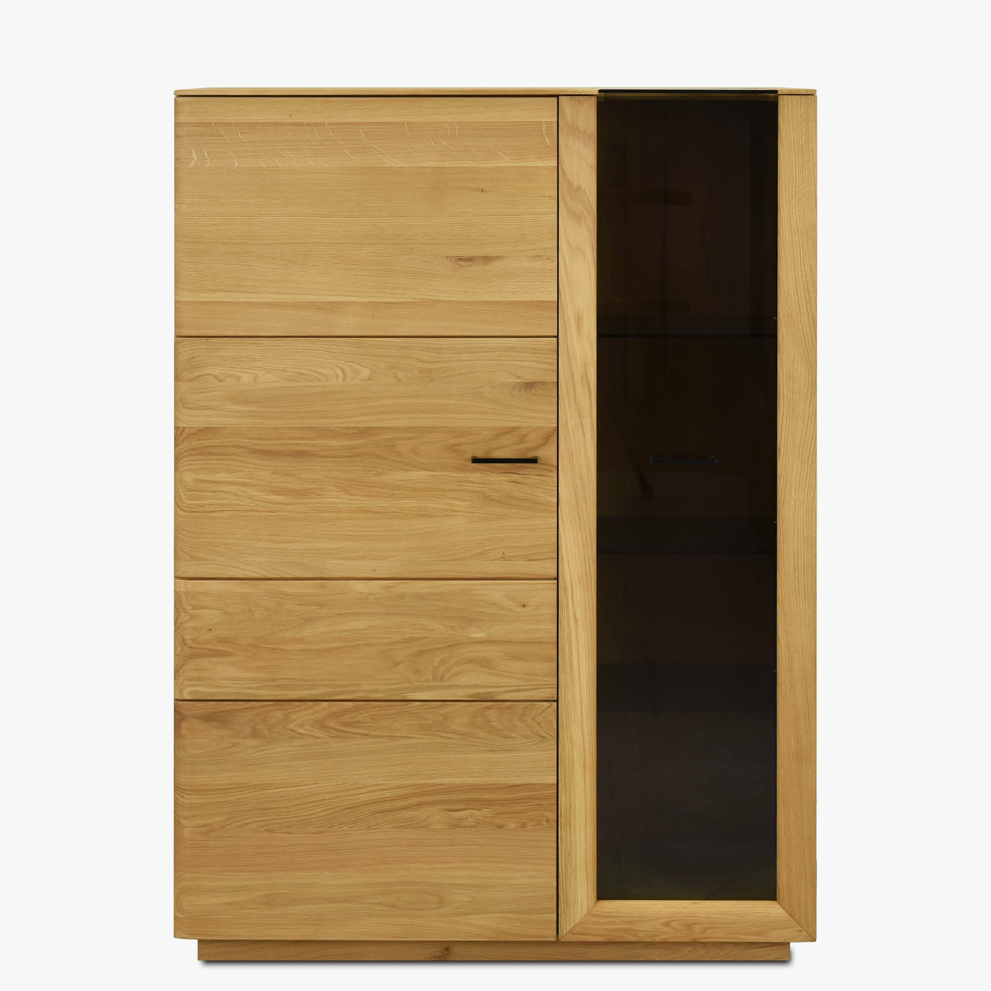 Vnútorný priestor vitríny je po otvorení prakticky rozdelený na dve polovice s množstvom odkladacích plôch. K dispozícii je jedna sklenená polica a niekoľko drevených políc pre variabilné usporiadanie. Kolekcia Bosco prináša moderný nábytok z prírodného dreva s typickými jemne zaoblenými hranami a ukončeniami, vďaka ktorým pôsobí nábytok luxusne a elegantne. Všetky kusy sú dodávané plne zmontované, takže odpadá zdĺhavá montáž. Povrch je ošetrený olejom v odtieni dub natural, ktorý krásne zvýrazňuje prirodzenú štruktúru dreva. Kusy kolekcie je možné vzájomne kombinovať.