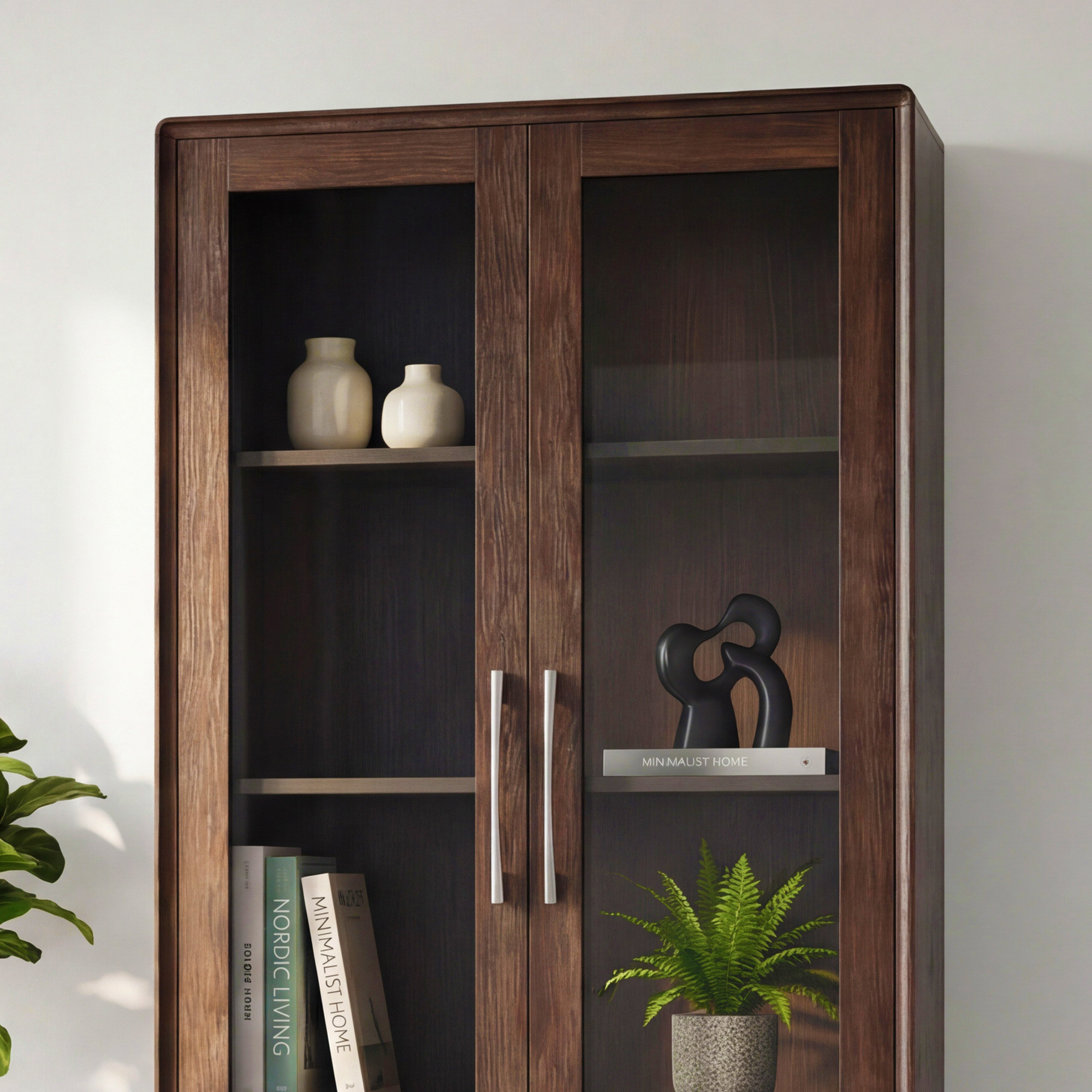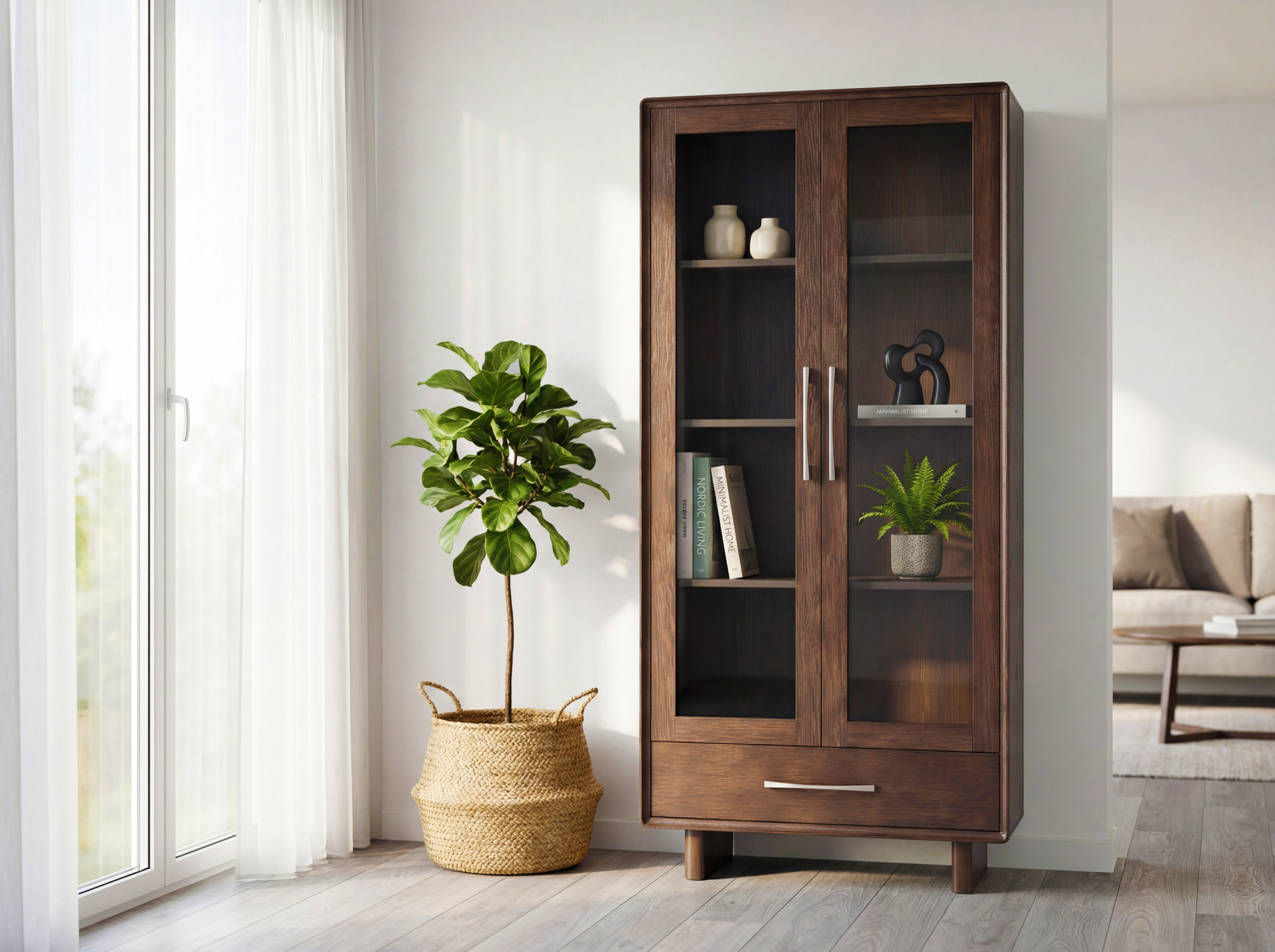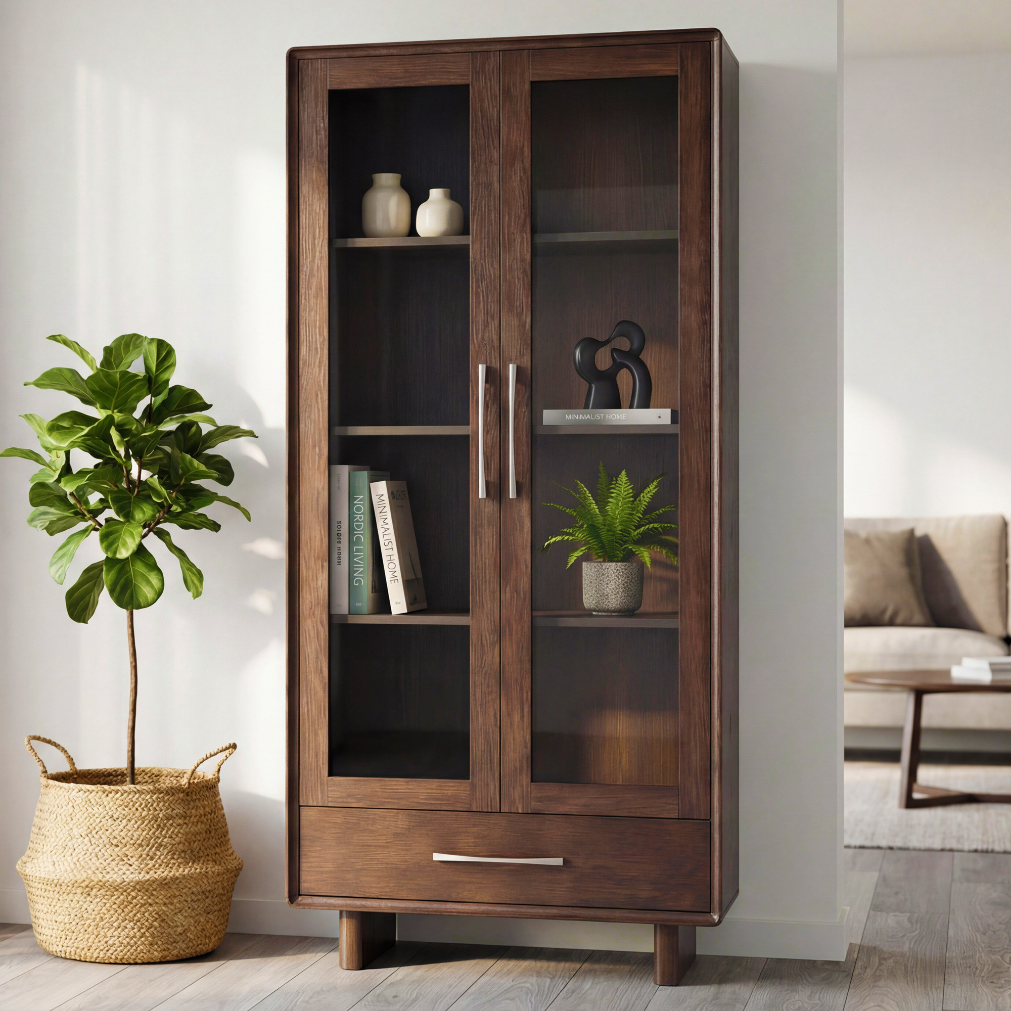 Predstavujeme vám designovú vitrínu Koper, ktorá spája elegantnú prezentáciu vašich obľúbených predmetov s praktickým úložným priestorom. Táto štýlová dvojdverová vitrína v teplej orechovej farbe je ideálna na vystavenie skla, porcelánu, kníh či dekorácií. Horná časť so sklenenými dvierkami umožňuje efektnú prezentáciu, zatiaľ čo spodná zásuvka ponúka diskrétny úložný priestor. Celý nábytok je vyrobený z prémiovej dubovej dyhy s masívnymi dubovými hranami, čo zaručuje mimoriadnu pevnosť a dlhú životnosť. Zaoblené hrany dodávajú vitríne moderný charakter a zároveň zvyšujú bezpečnosť v domácnosti.