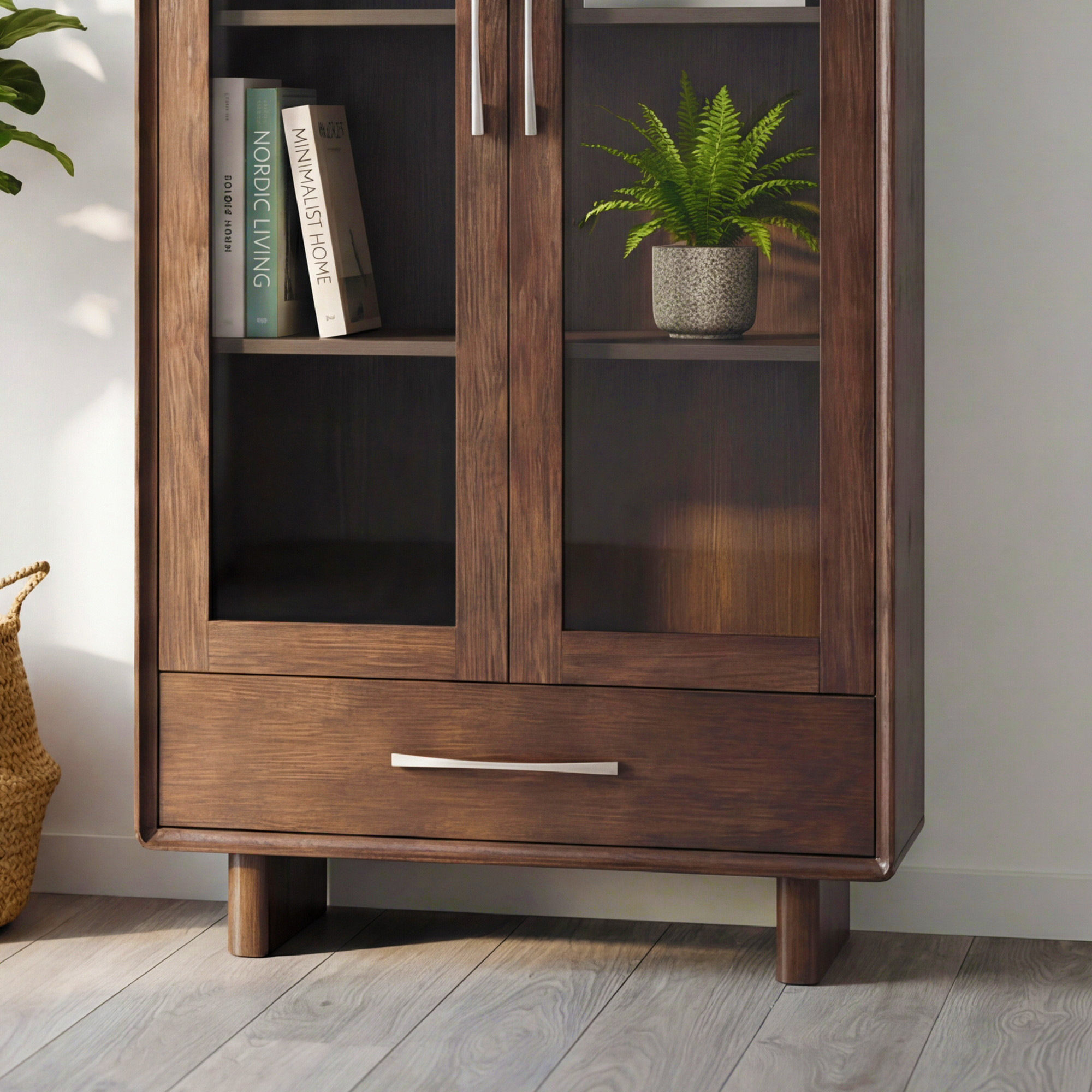 Vitrína so sklenenými dvierkami a zásuvkou v farbe orech
