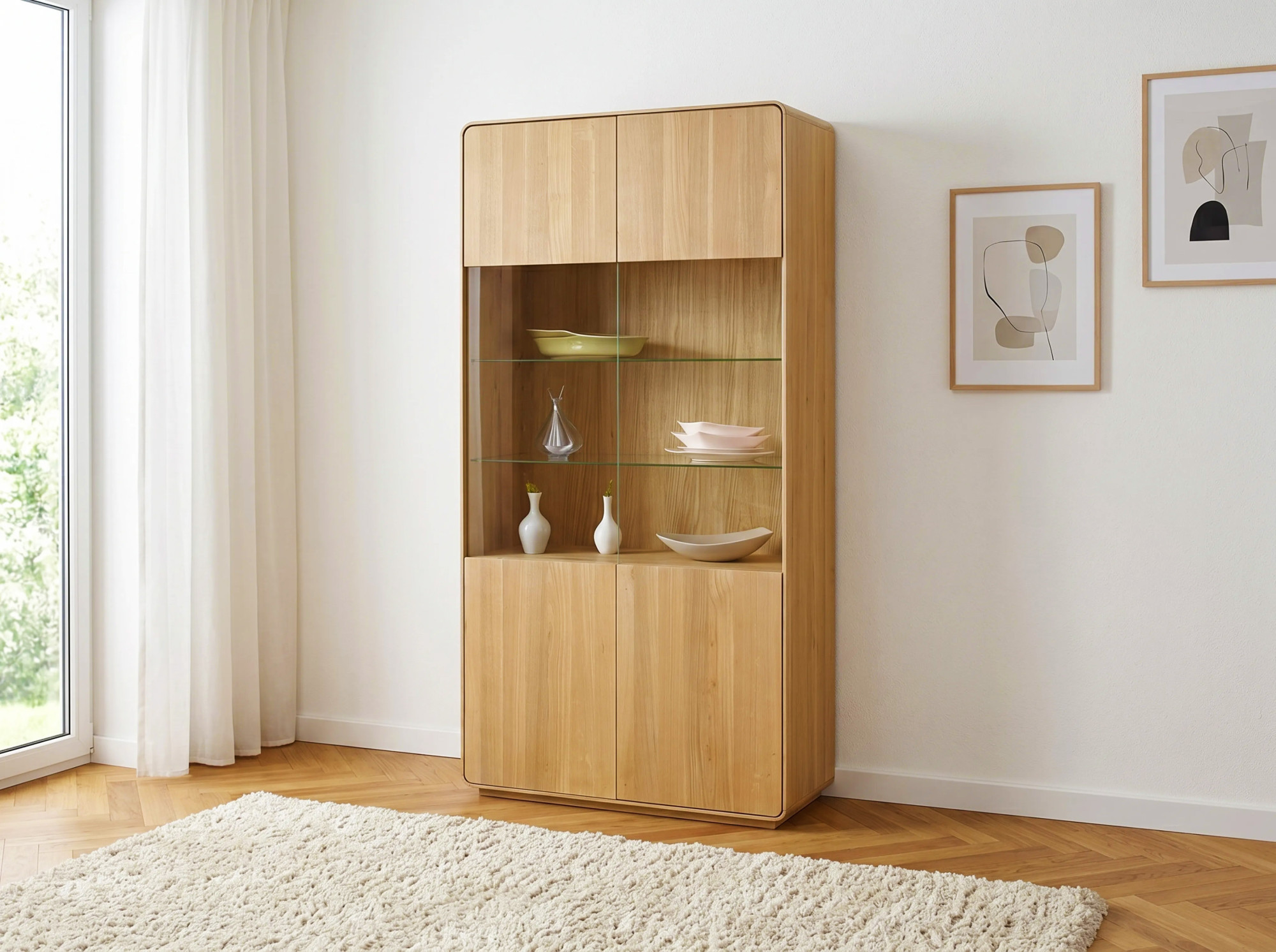 Táto masívna dubová vitrína z kolekcie Avalon spája nadčasový škandinávsky dizajn s prírodnou krásou dreva a stane sa reprezentatívnou dominantou vašej obývačky alebo jedálne. Vitrína je vyrobená z celomasívneho dubového dreva v krásnom odtieni dub natural, ktorý dodá interiéru teplo, útulnosť a prirodzenú eleganciu. Vďaka FSC certifikátu máte istotu, že drevo pochádza z zodpovedne spravovaných lesov. Charakteristické zaoblené hrany požičajú vitríne luxusný a zároveň minimalistický vzhľad typický pre škandinávsky štýl.