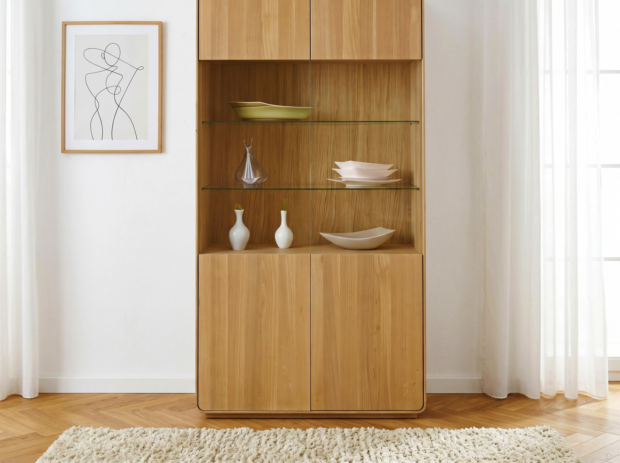 Vitrína ponúka mimoriadne univerzálne úložné riešenie. Stredová presklenená časť s dvoma sklenenými policami a bočným sklom zabezpečuje krásne presvetlenie a je ideálna na vystavenie obľúbenej zbierky porcelánu, skla alebo dekoratívnych predmetov. Horné i dolné uzavreté dvojdvierka z masívneho duba naopak diskrétne ukryjú praktické veci, ktoré nechcete mať na očiach – dolná skrinka je navyše vybavená vertikálnou priečkou pre lepšiu organizáciu. Všetky dvierka sú vybavené systémom soft-close, ktorý zabezpečuje tiché a plynulé zatváranie. Povrch je ošetrený prírodným olejom, ktorý zvýrazňuje unikátnu kresbu masívneho duba a zároveň poskytuje spoľahlivú ochranu proti každodennému opotrebeniu. Olejovaná povrchová úprava umožňuje drevu dýchať a v prípade potreby je povrch ľahko renovovateľný. Vitrína je dodávaná už kompletne zmontovaná a pripravená na okamžité použitie. Skvele sa kombinuje s ďalšími kúskami z kolekcie Avalon, čím vytvoríte harmonicky zladený interiér.