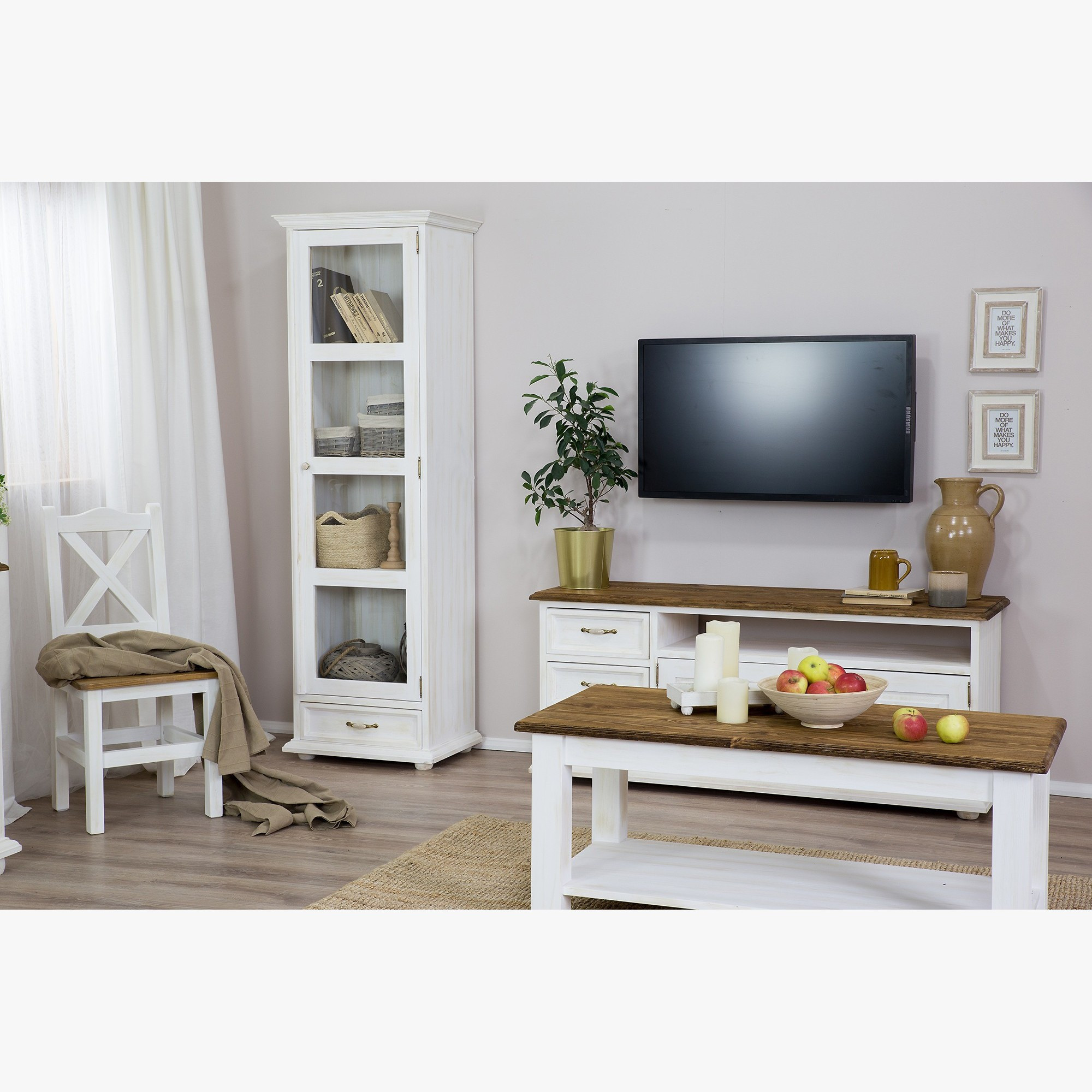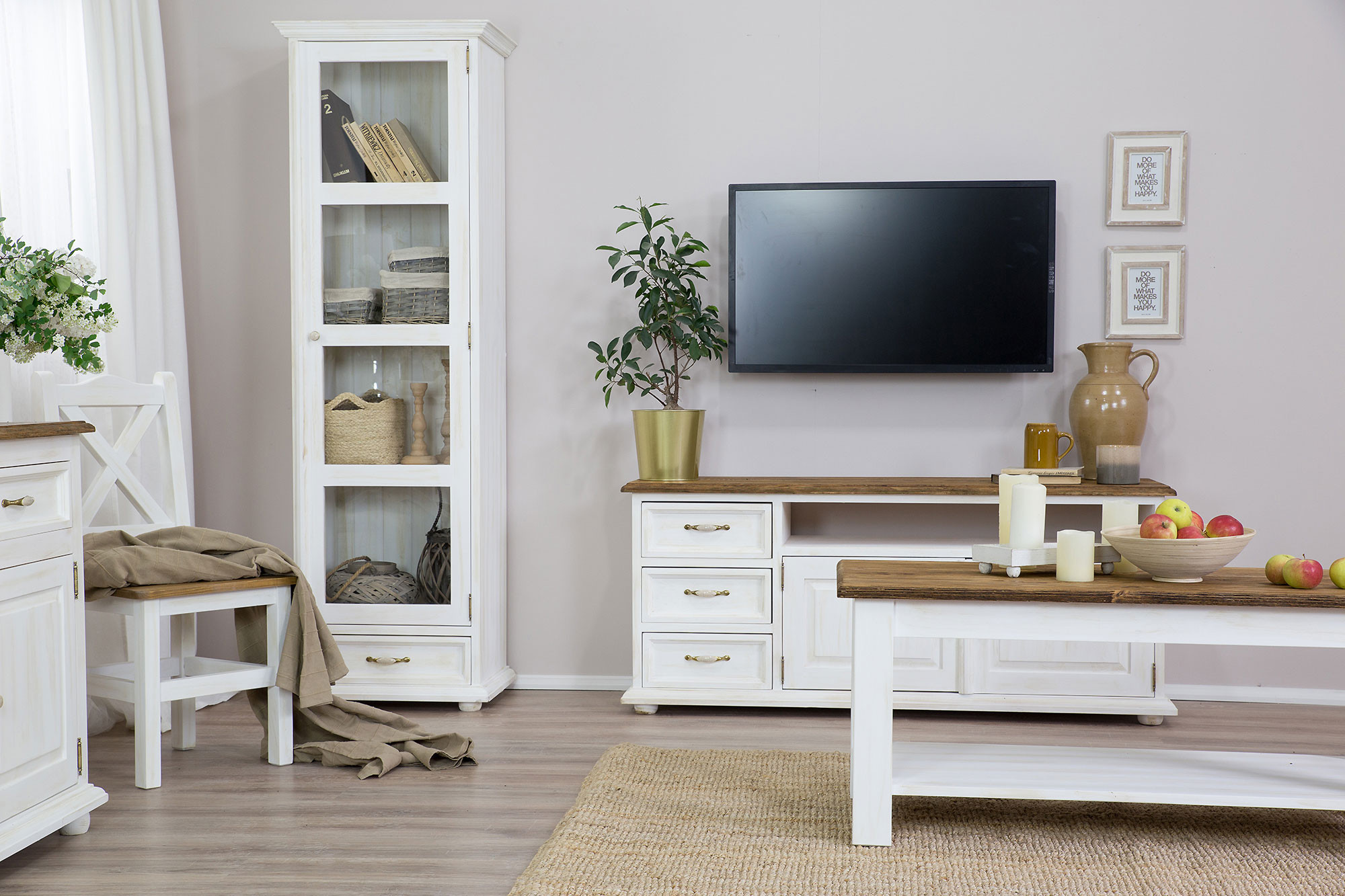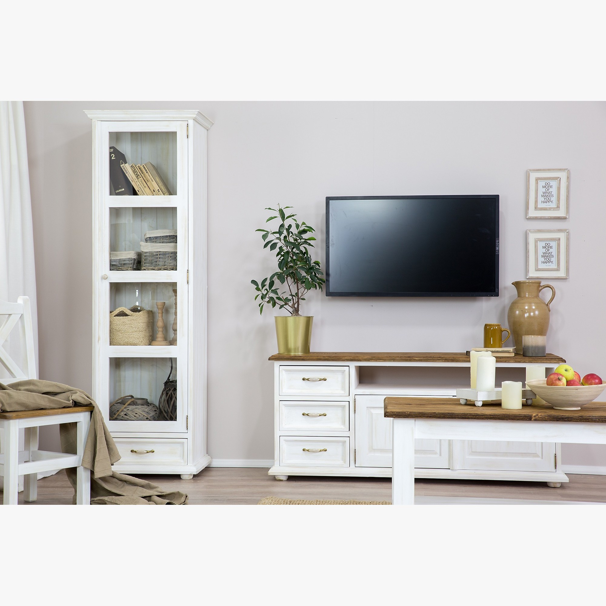 Prekrásna drevená vitrína vyrobená v krásnom provensálskom štýle. Vitrína je dvojdverová a má presklené dvierka, je vhodná do jedálne, obývačky na čokoľvek, čo chcete vystaviť. Vitrína je vyrobená zo 100% dreva - borovica, vrátane zadnej steny. Krásnym znakom kolekcie Le buax sú porcelánové úchytky, ktoré vytvárajú kompletný a charakter prírodného nábytku z oblasti Provence.