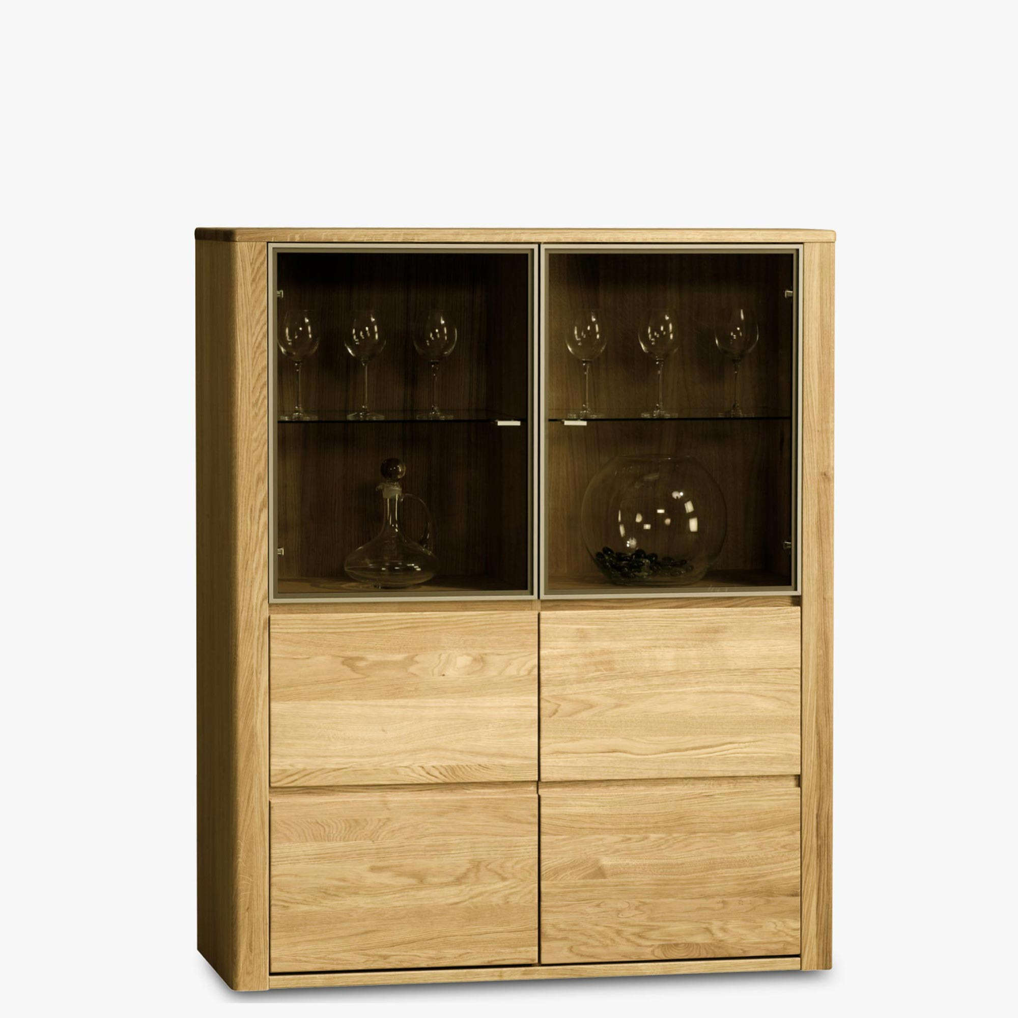 Luxusná vitrína vyrobená z dubového masívu v kombinácii s dubovou dyhou, ktorá vás očarí svojím precízne vypracovaným a moderným dizajnom, ktorý bol navyše ocenený diamantom nábytkárstva 2013. Vitrína je rozdelená na polovicu s presklenými dvierkami a druhá časť je z drevenými.