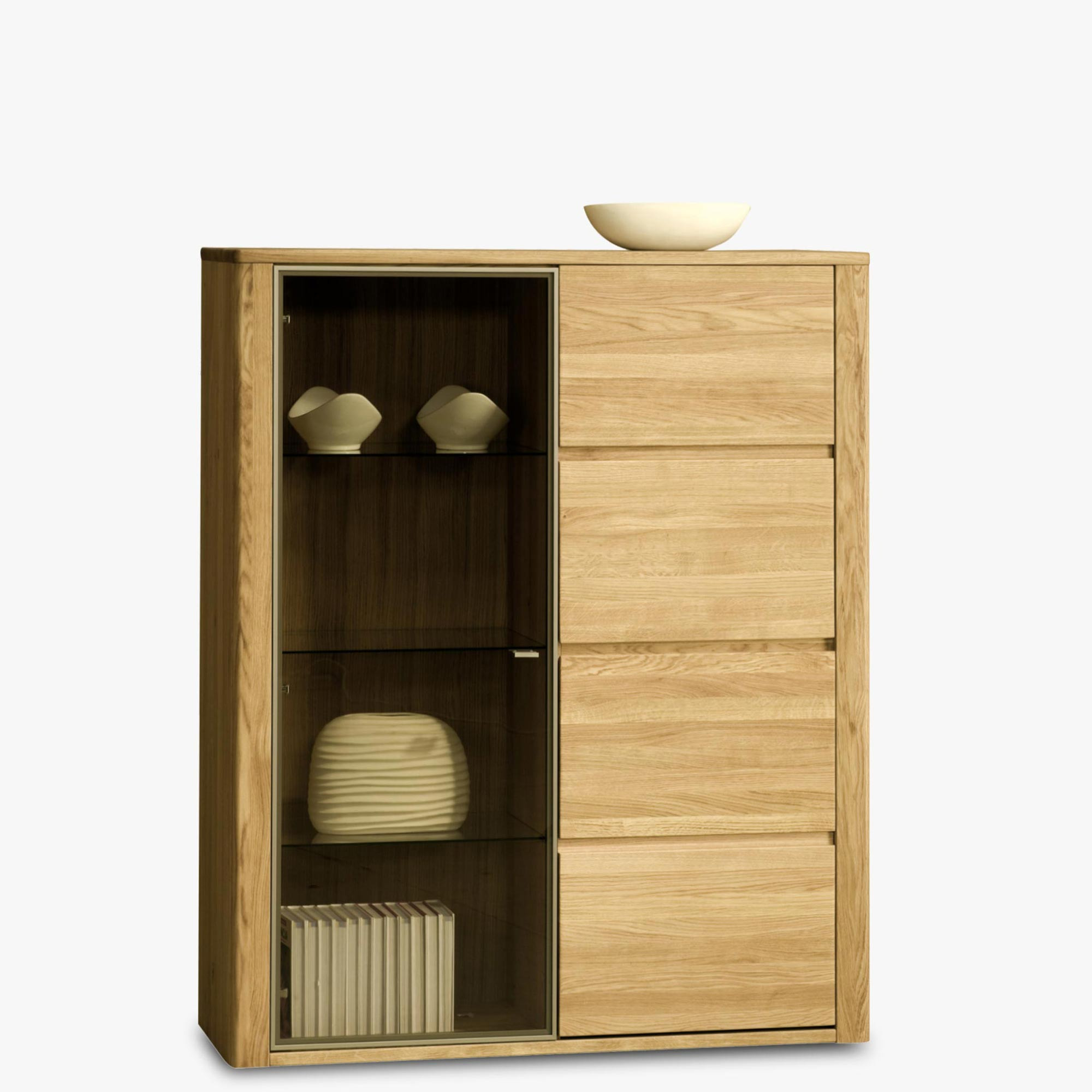 Moderná vitrína z dubového masívu z kolekcie NICE, dubového nábytku, vitrína je rozdelená do troch častí, ľavá strana má presklené dvierka s tromi sklenenými policami,