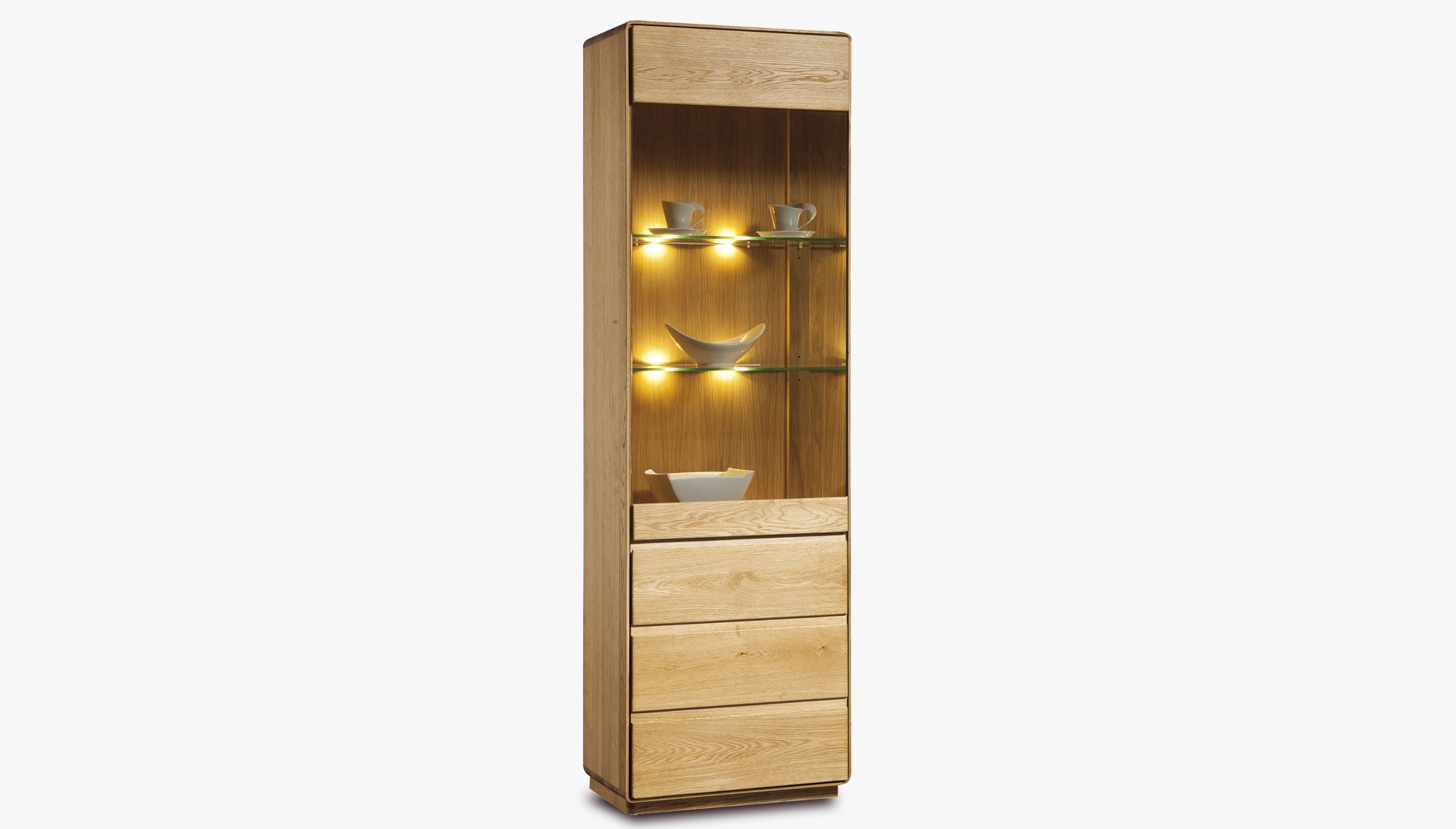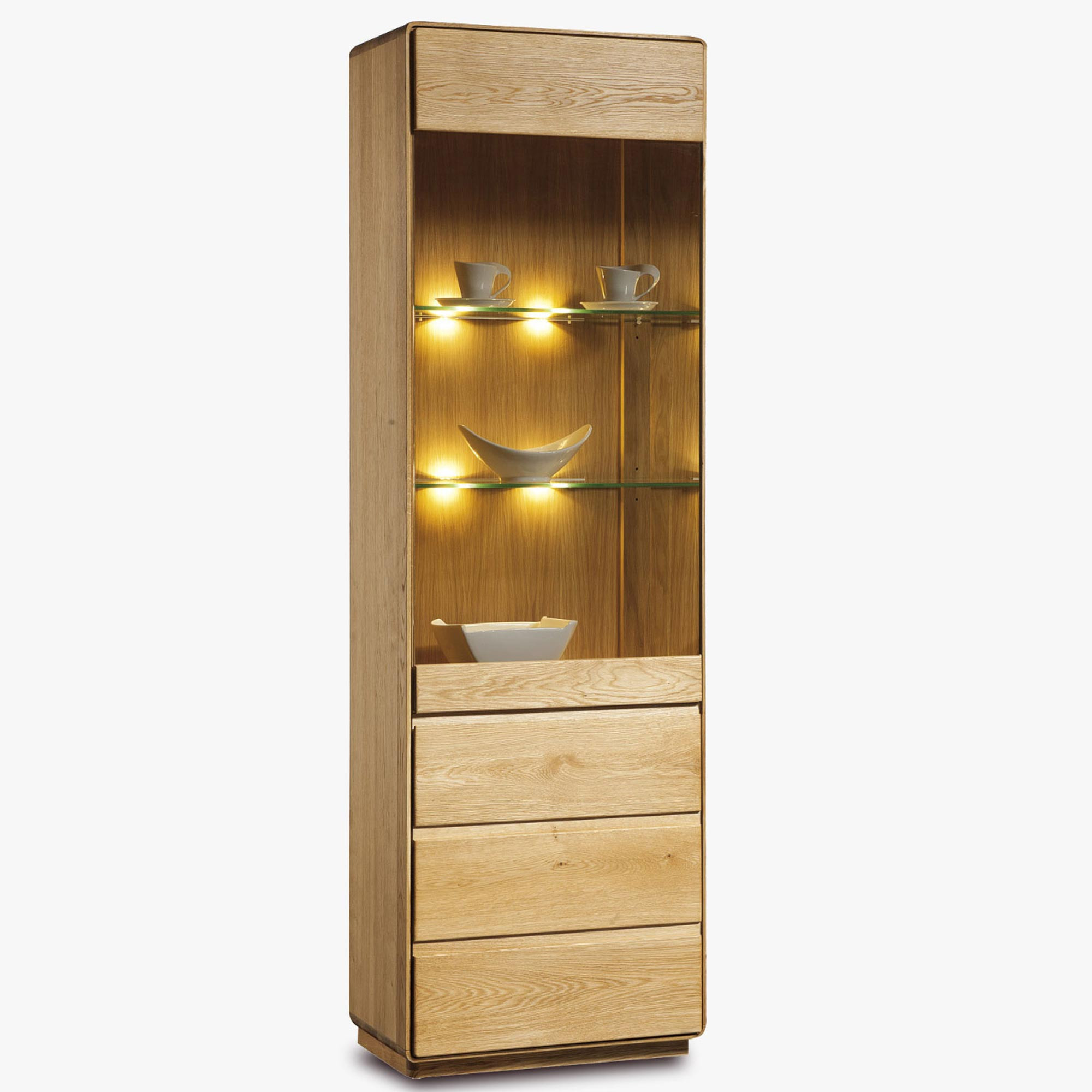Vitrínu si okamžite zamilujete pre nezameniteľnú krásu divokého kartáčovaného dubu, špičkové remeselné spracovanie i charakteristickú vôňu, akou sa môže pýšiť dubový nábytok. Návrh renomovaného zahraničného dizajnéra vitríne vtisol vzdušný štýl s minimalistickým poňatím, hladkými plochami a jemne zaoblenými hranami. Dojem vzdušnosti dokonale umocňuje systém bezúchytkového otvárania dvierok.