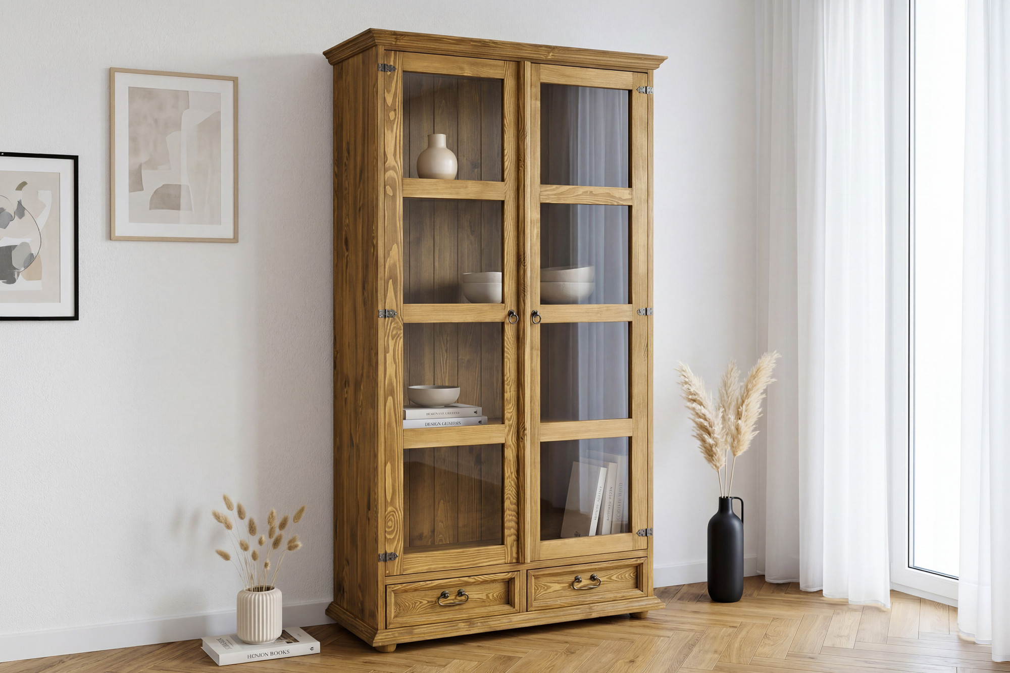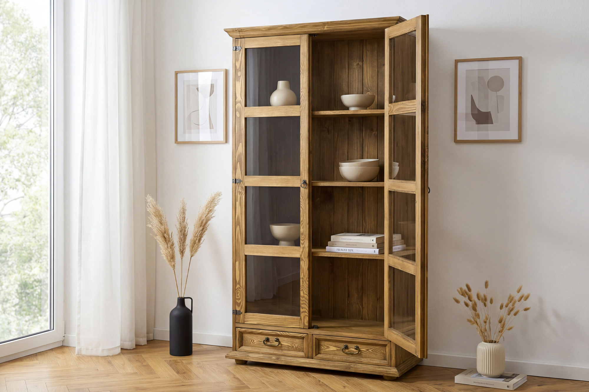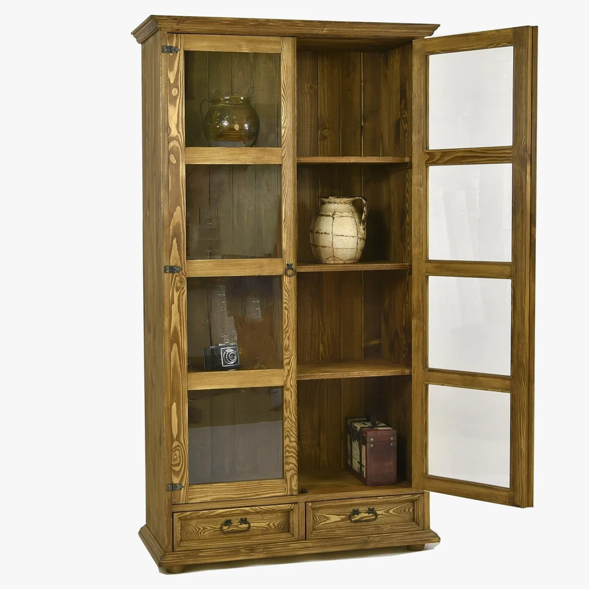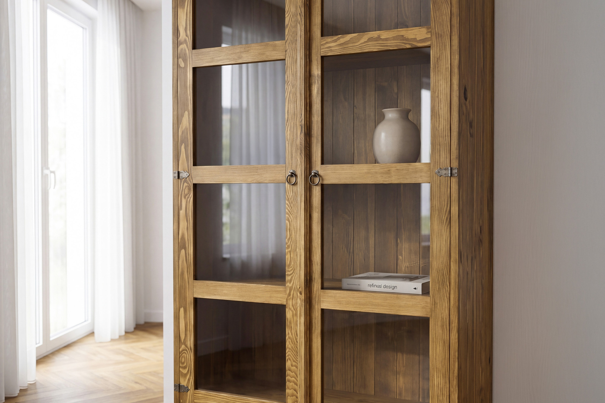 Vitrína je vyrobená z kvalitného masívneho borovicového dreva, ktoré je obľúbené pre svoju pevnosť, prirodzený vzhľad a dlhú životnosť.